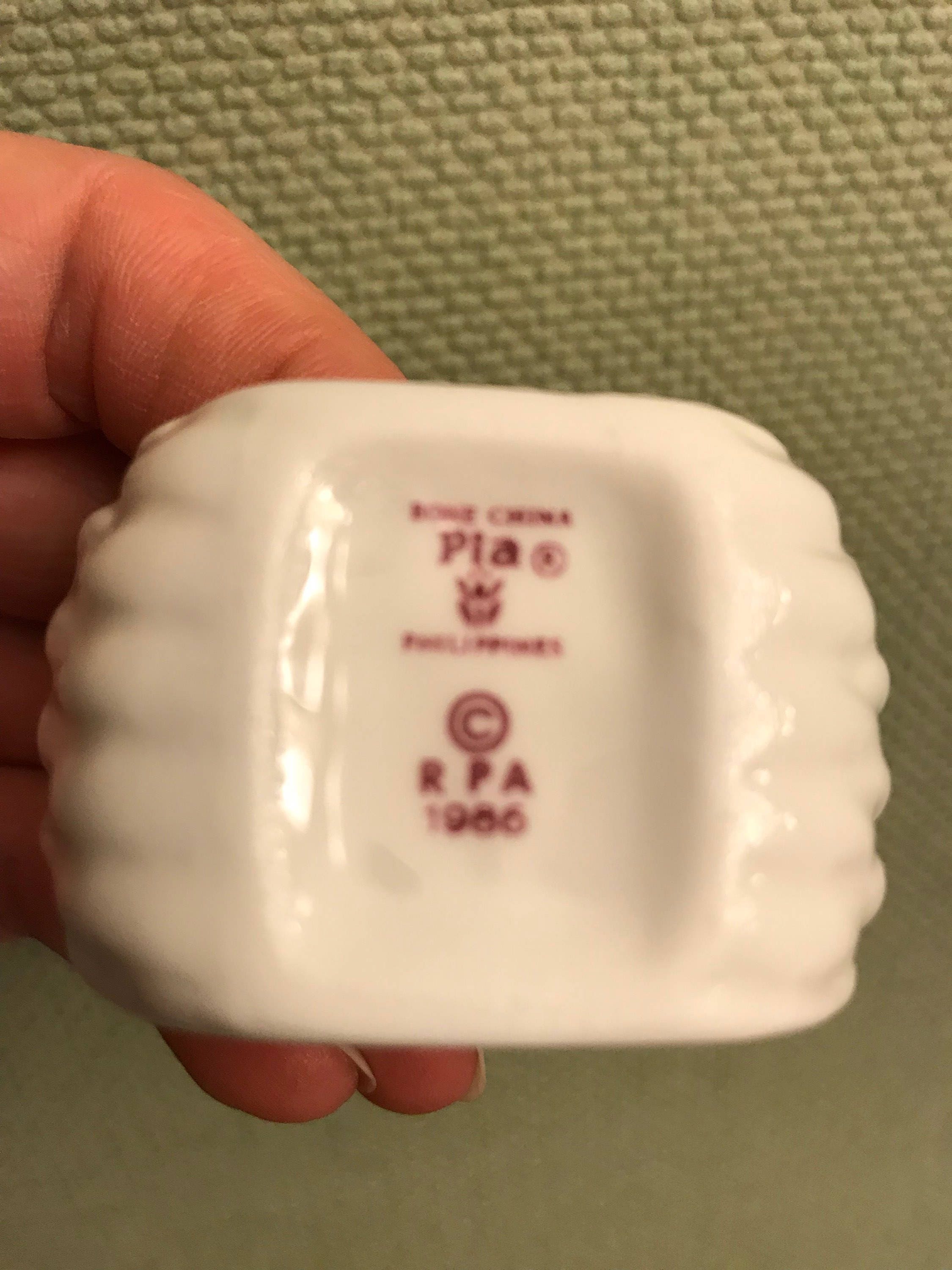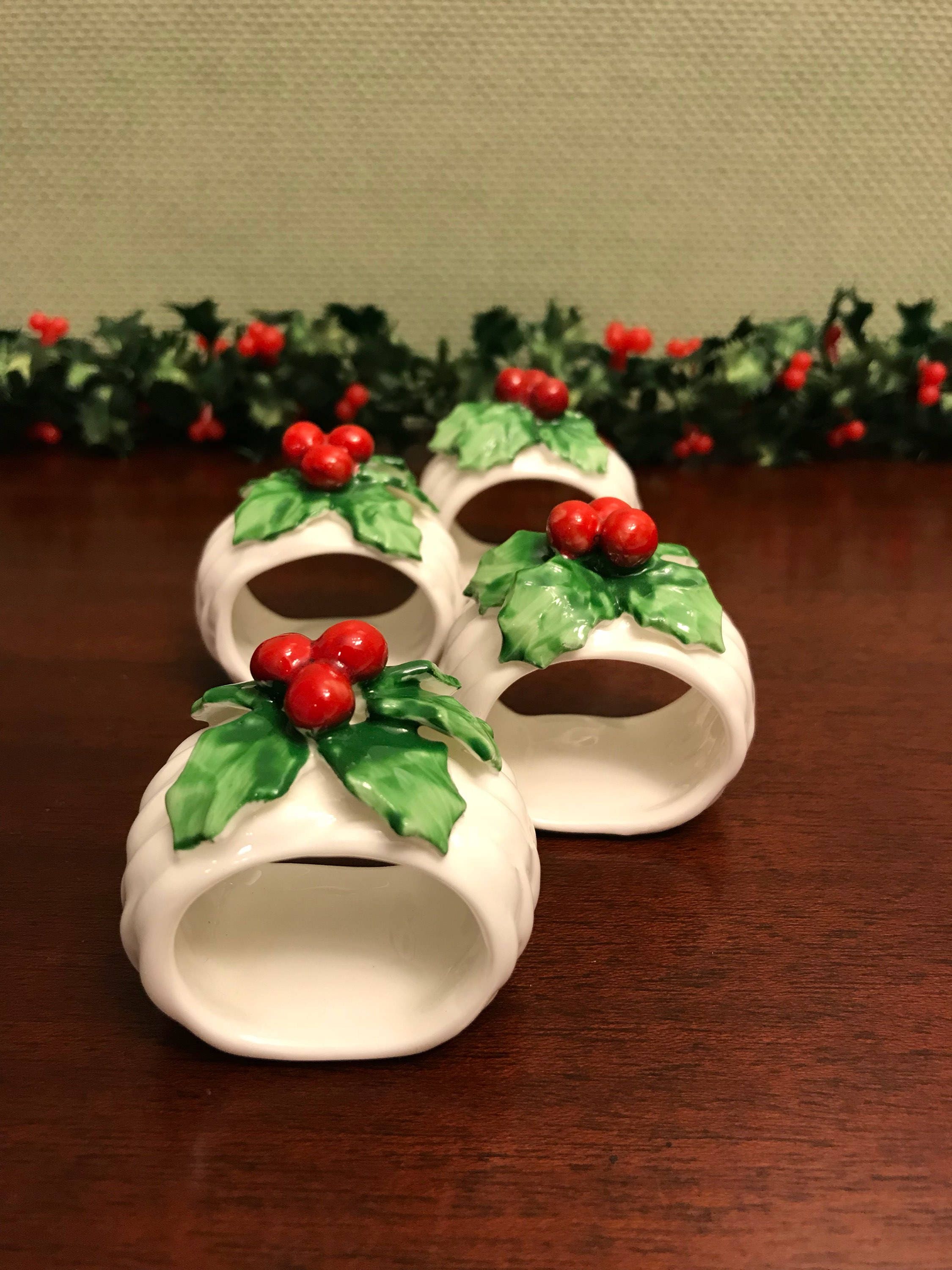 Vintage Holly porcelain napkin rings. Perfect for a holiday table setting. These D shaped standing napkin rings have a beautiful hand painted three dimensional Holly design. Lovely set of 4 Napkin Rings perfect for a gift or to grace your dinner table. The lovely Holly design is a wonderful compliment to most holiday china patterns. These Napkin Rings have a PIA makers mark and are dated 1986. Made in the Philippines. Bone China.
