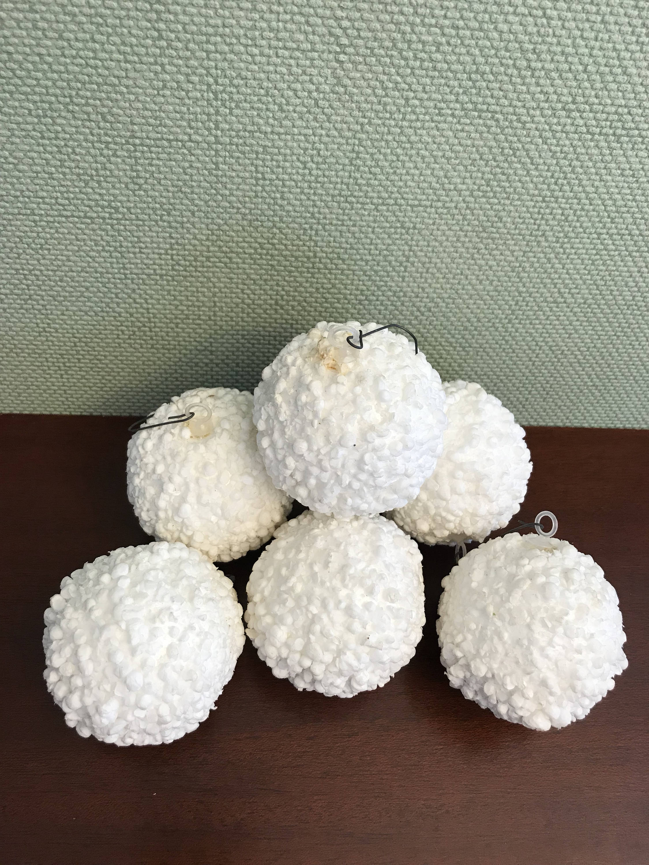 Vintage Snowball shaped Tree Ornaments, White Ball ornaments, Christmas Ball ornaments, set of 6 unbreakable ornaments, 1960s, gift