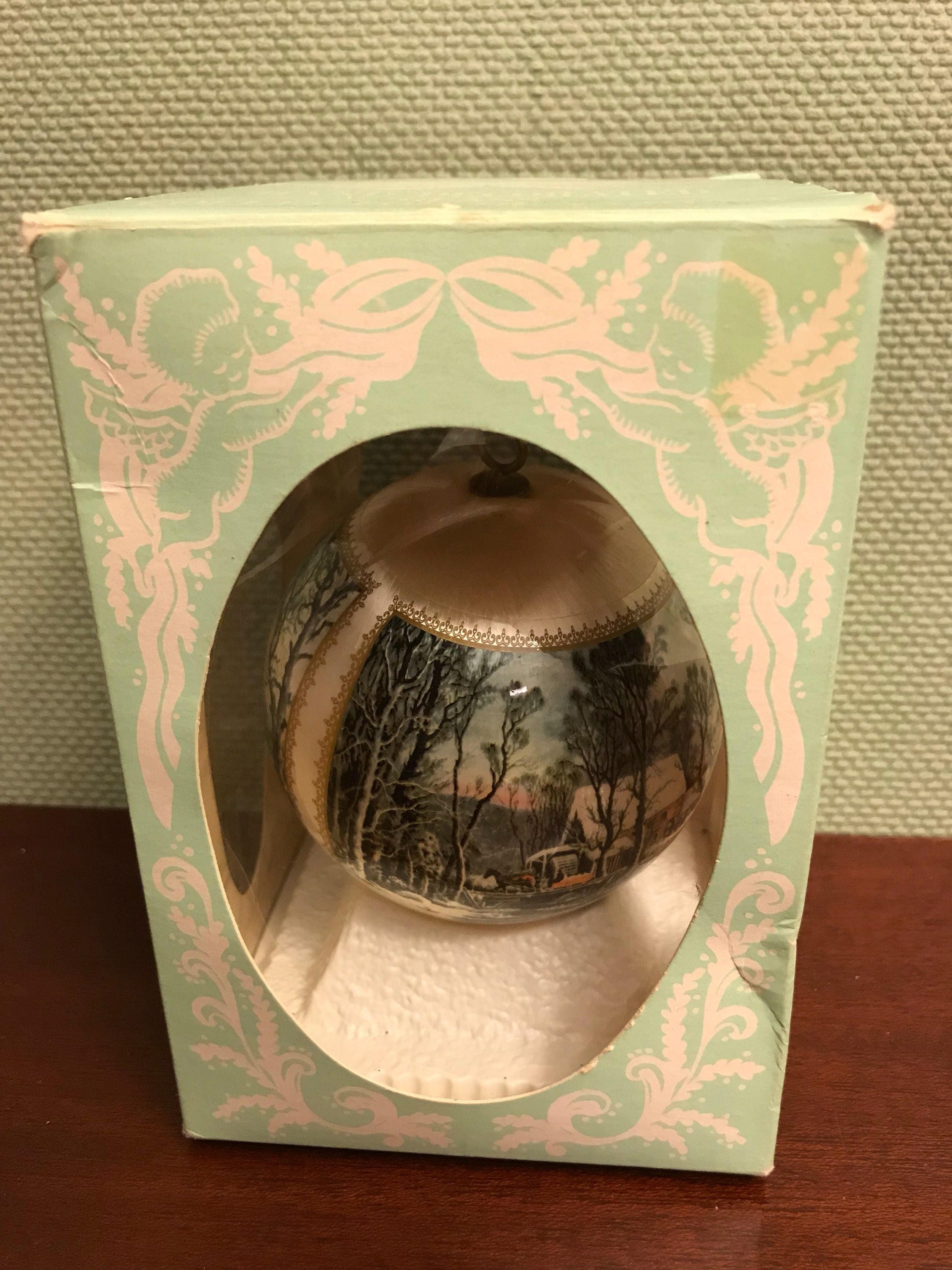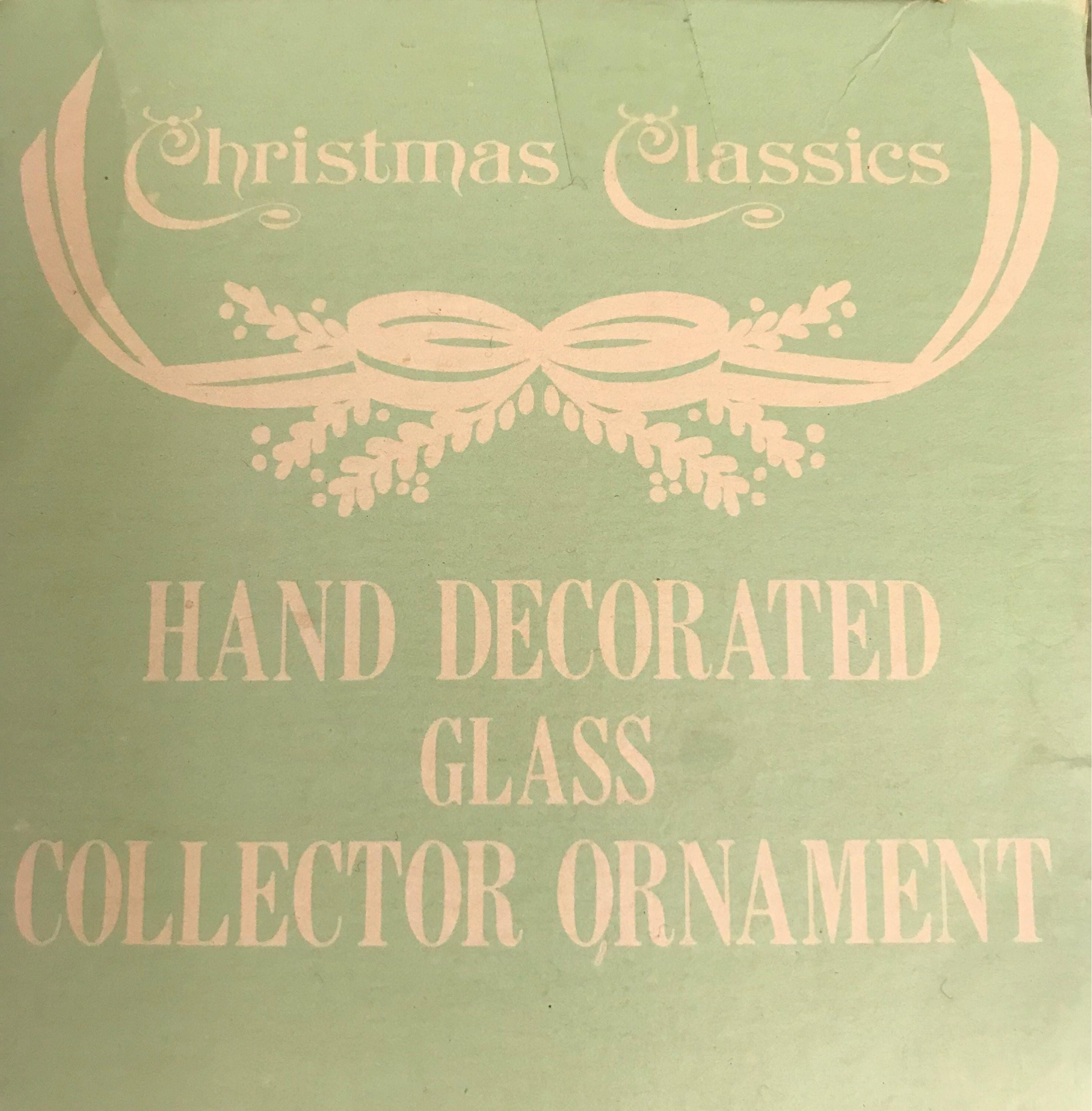 It is in the original gift box, which showed some signs of its age. The Box is marked Christmas Classics Hand Decorated Glass Collector ornament.