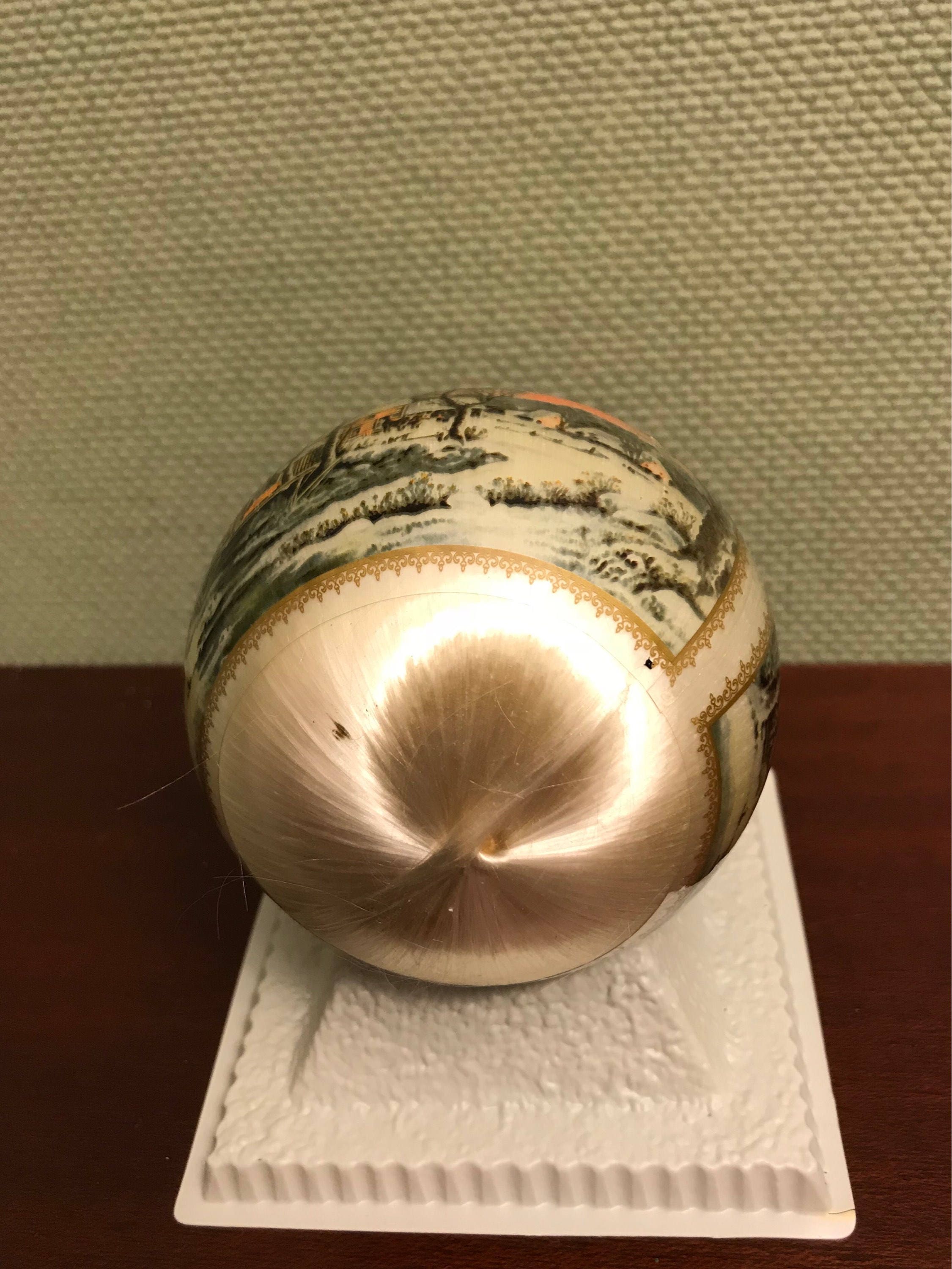 This is a lovely glass ball. It is covered in Satin threads, and has a cellophane wrap that is decorated with a winter scene. The colors are soft. The Scene reminiscent of a Currier & Ives Scene. So pretty.