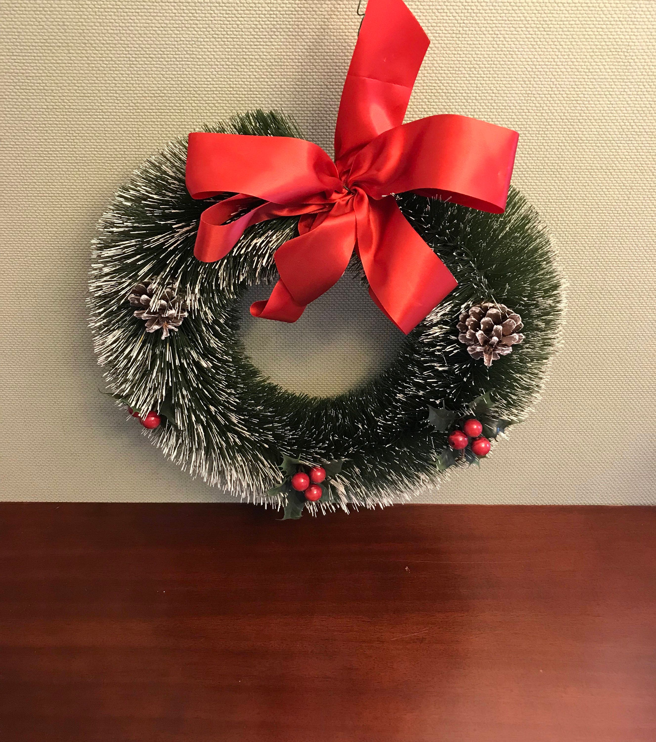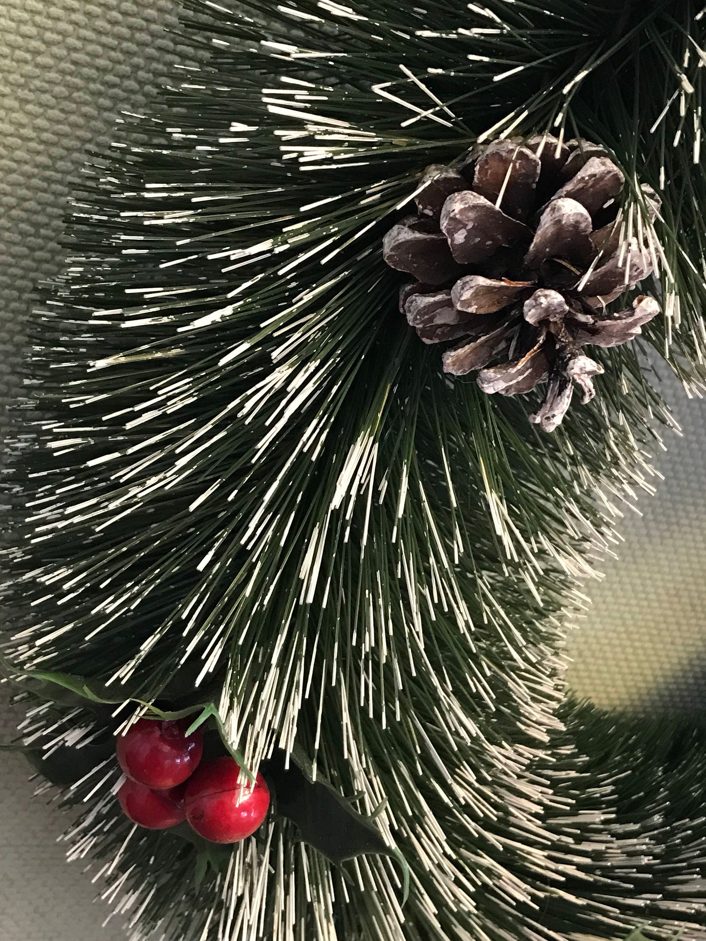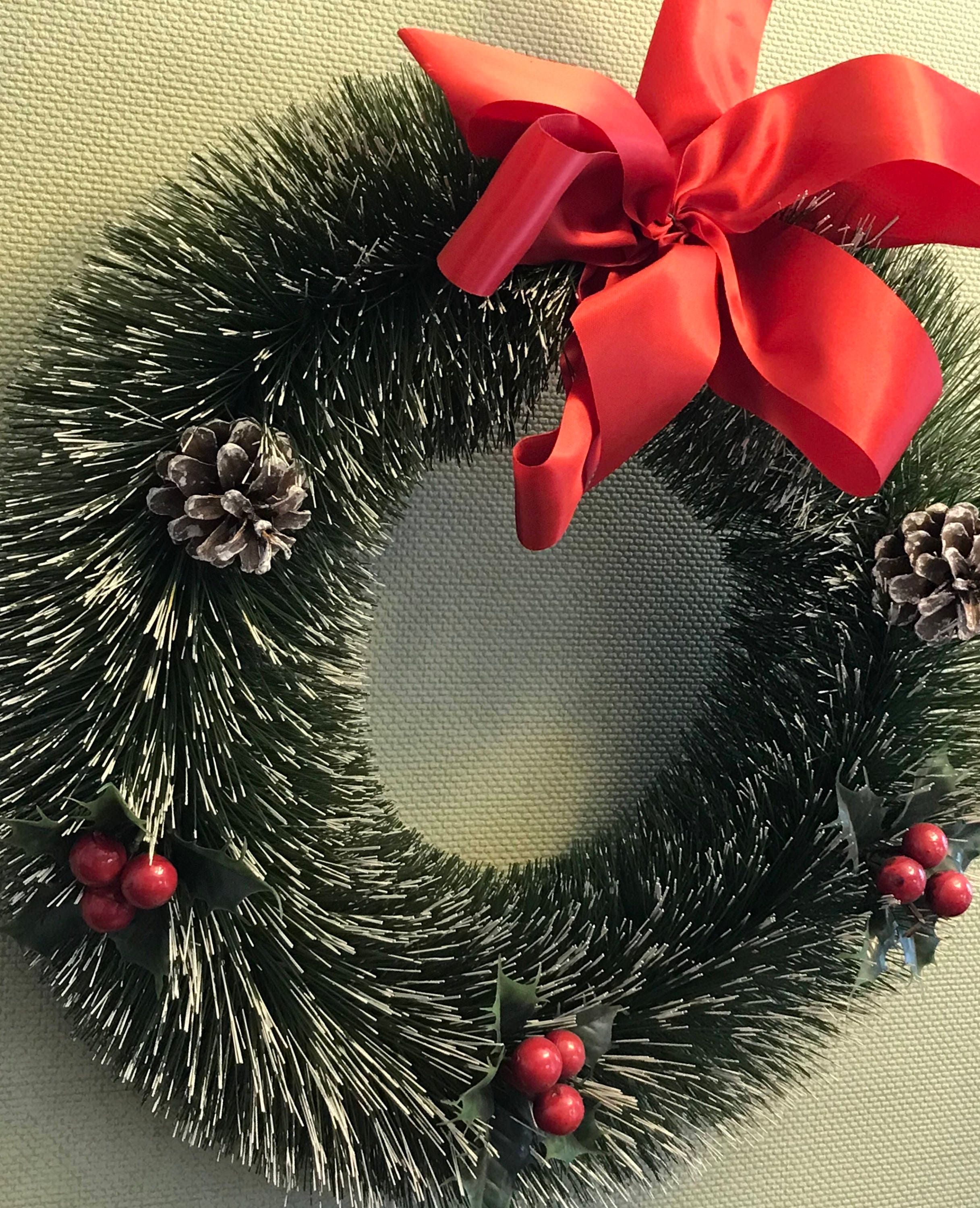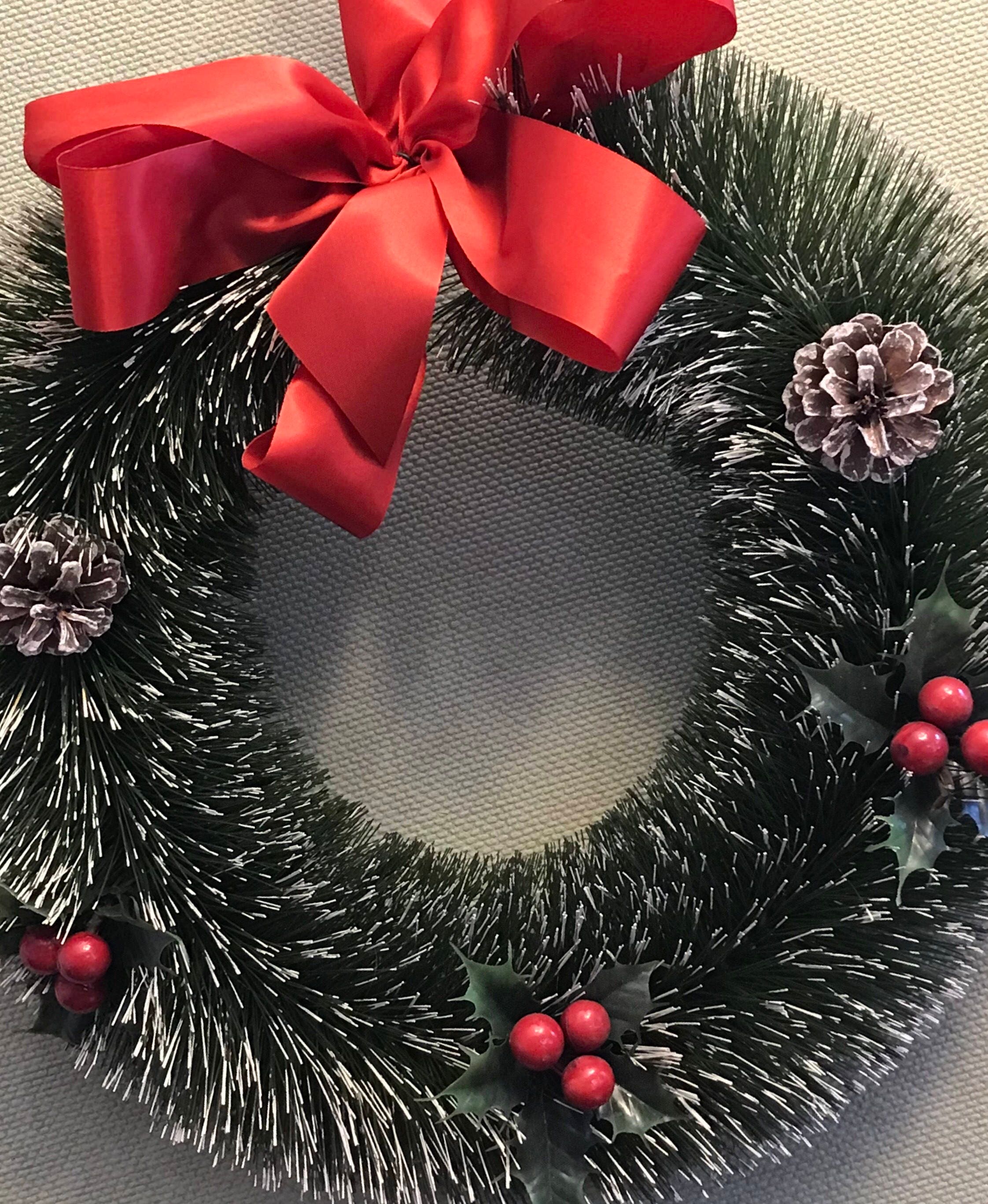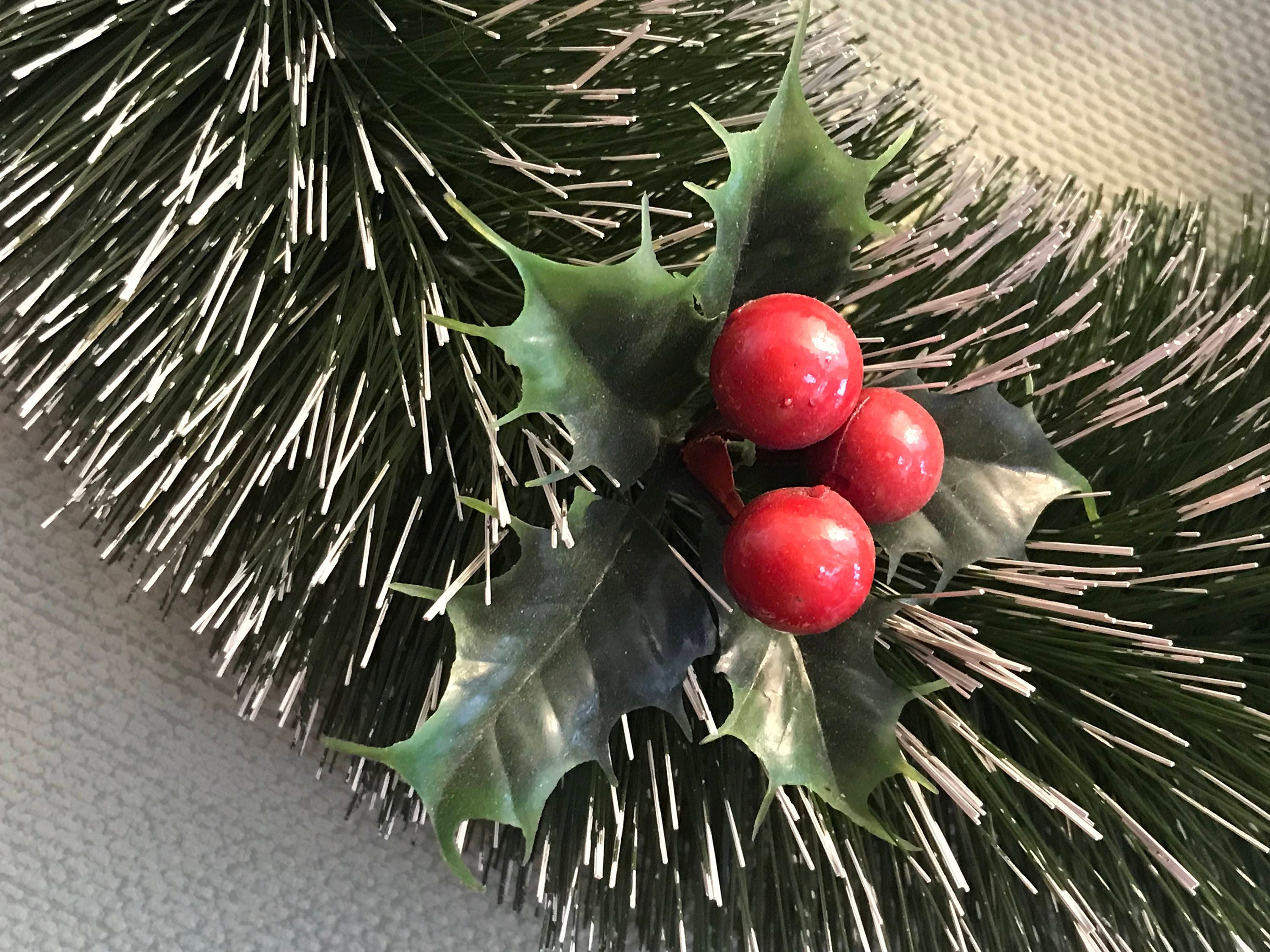 This is a lovely vintage bottle brush wreath, popular in the 1950s and 1960s! It has a large original red bow, flocked bottlebrush tips, little flocked pine cones, and plastic Holly with big red berries, so fabulously Kischty Christmas. Just like used to hang on grandma’s door every Christmas.