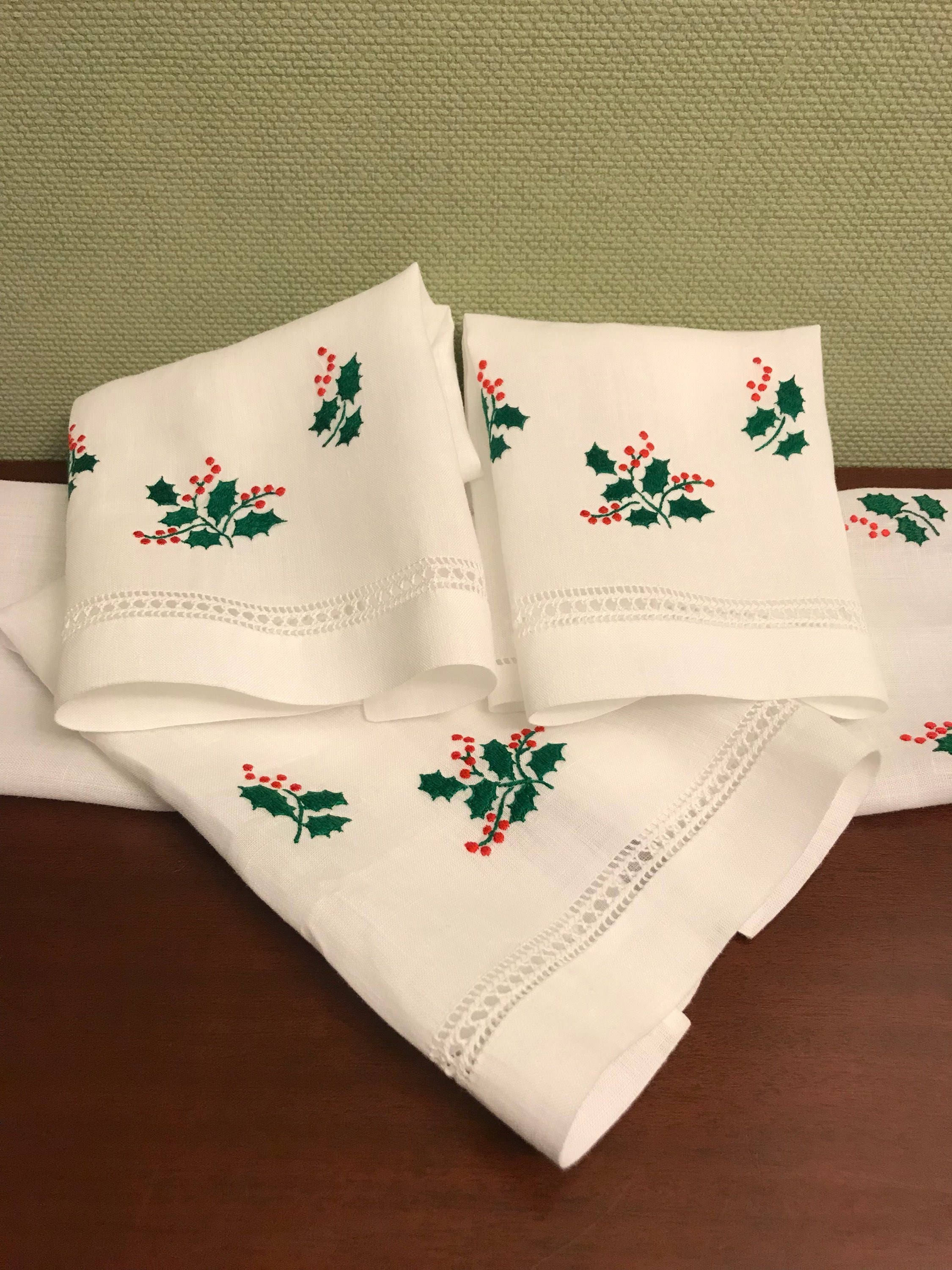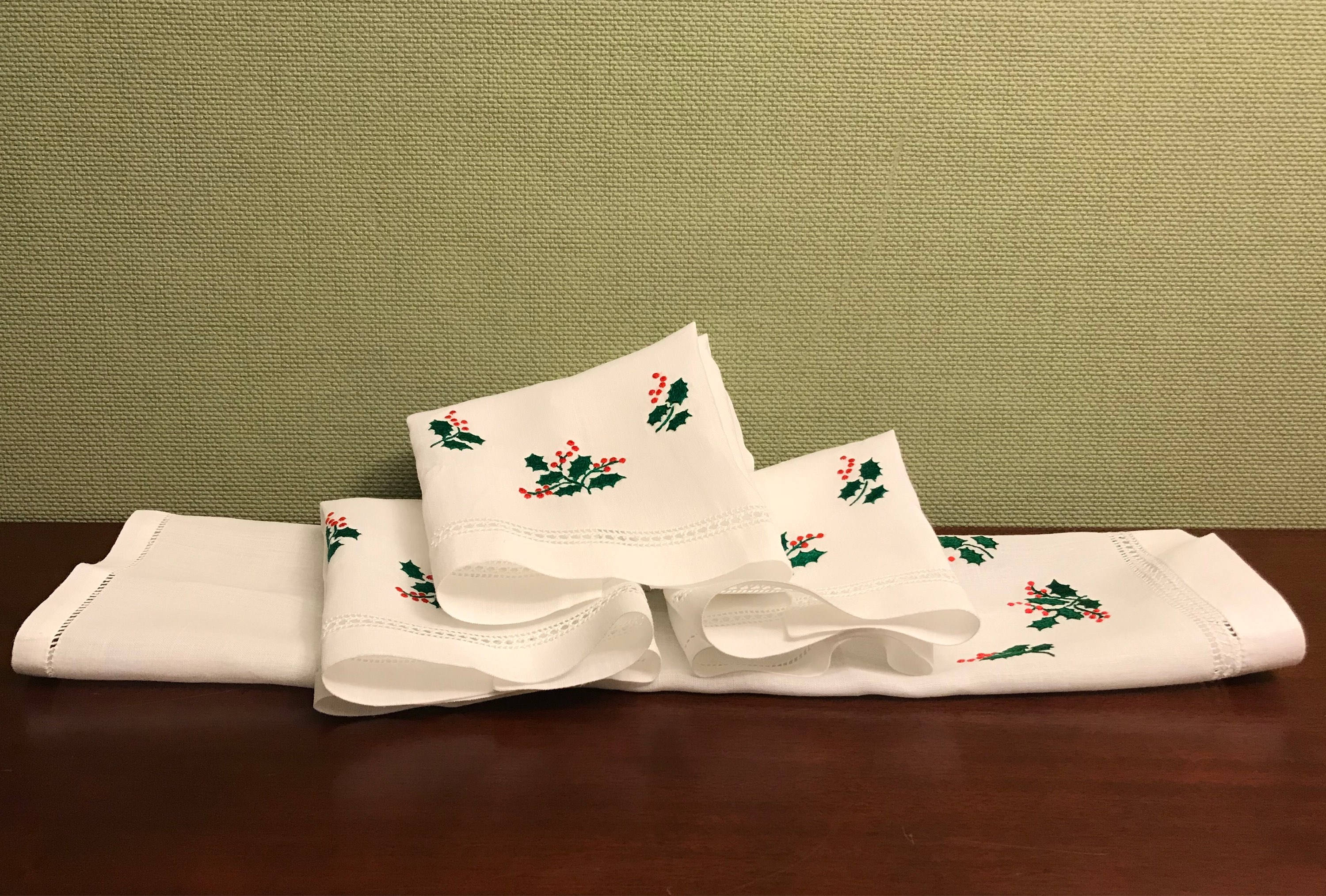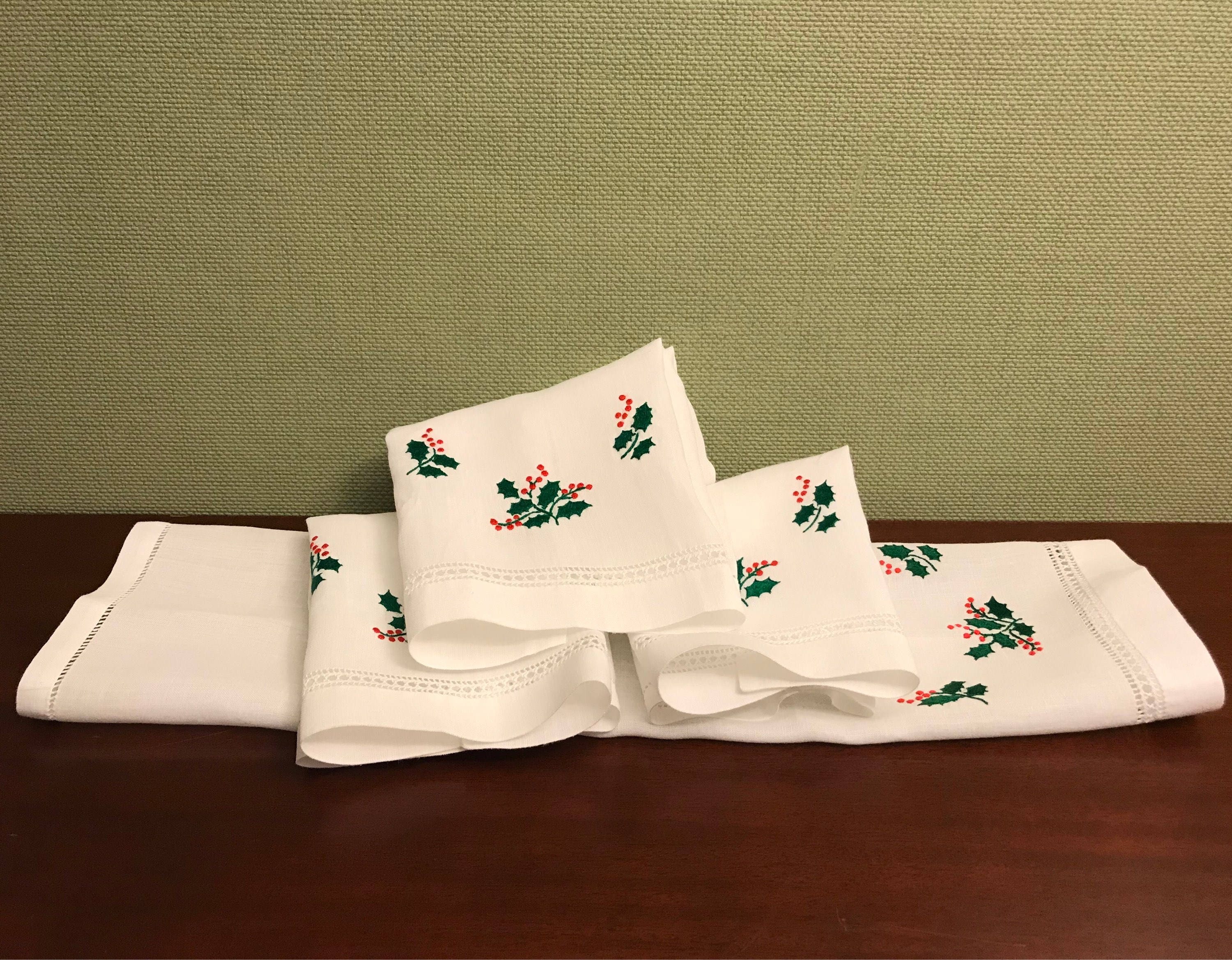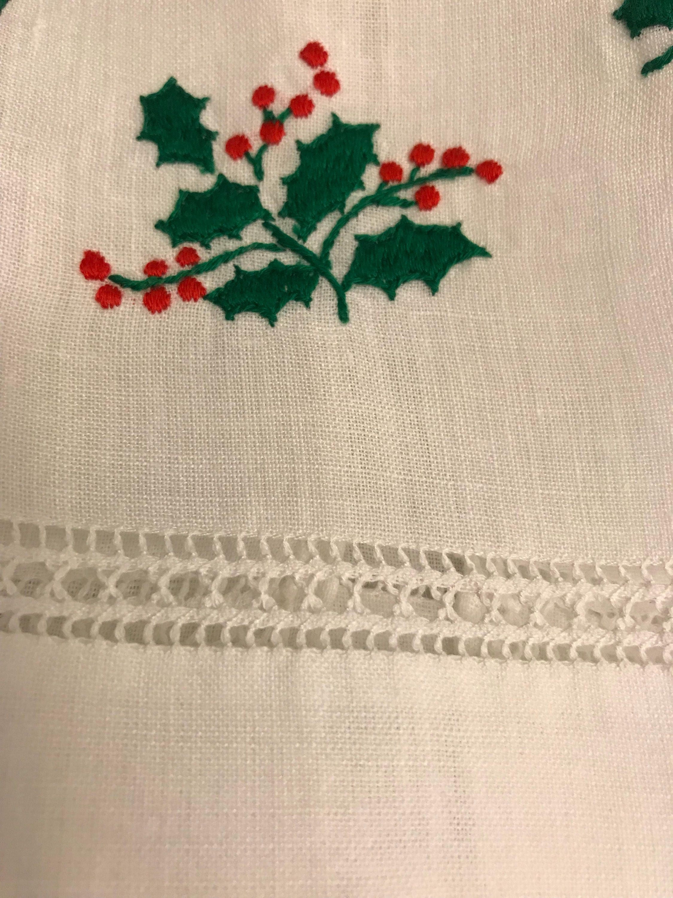 Vintage set of 4 Holiday Tea Towels embroidered with Holly. These lovely Christmas towel are dainty. They are made of fine lawn fabric with pretty decorative insets. This set would be a great hostess gift.