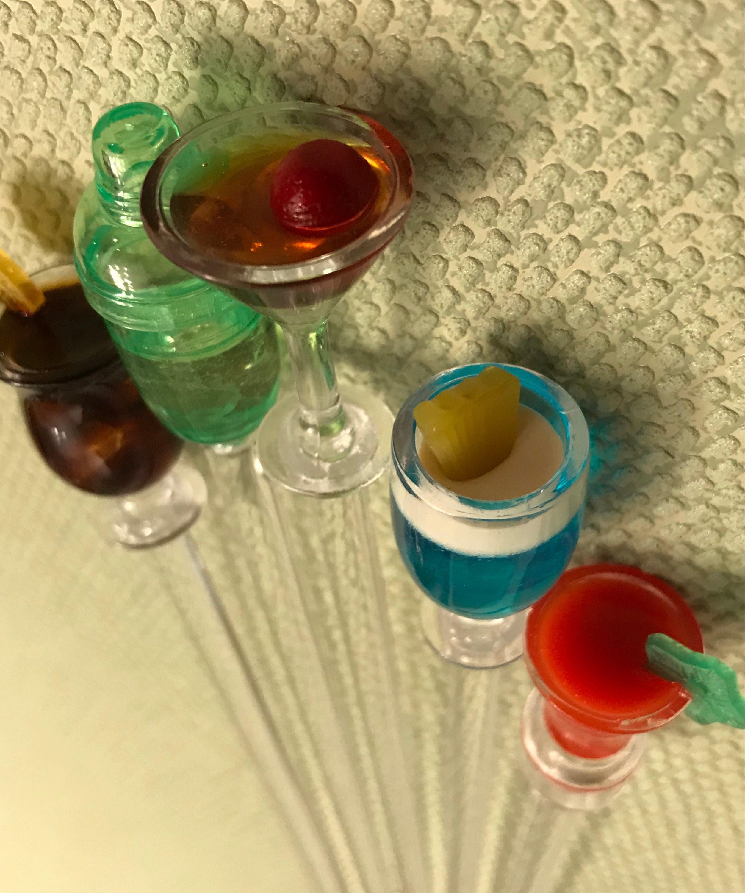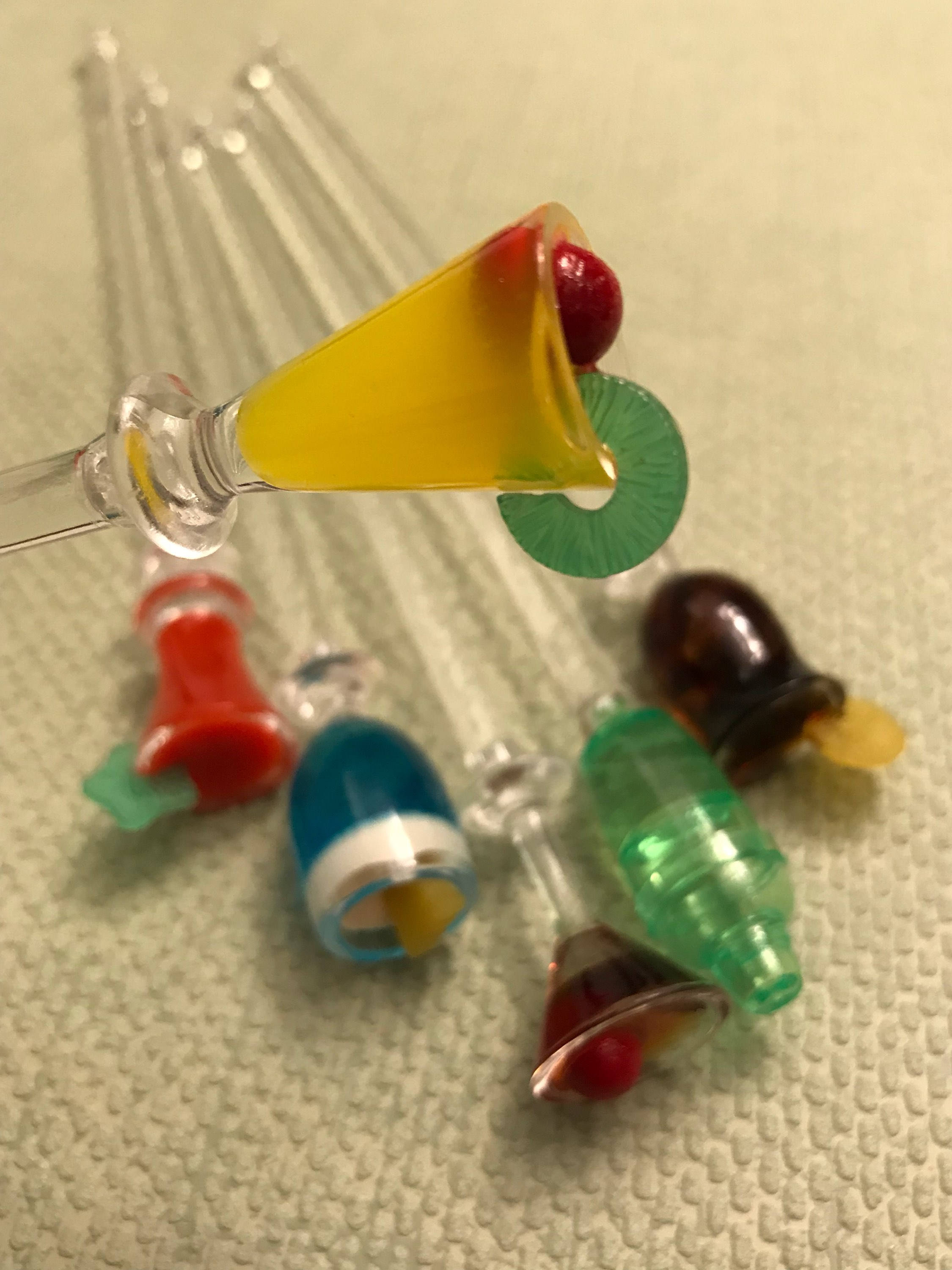Acrylic Party Swizzle Sticks in little drink shapes. This set of 6 swizzle sticks is perfect for a party. While both Decorative and useful they would also make a great hostess gift. I think these pretty stir sticks are charming displayed upright in vase.