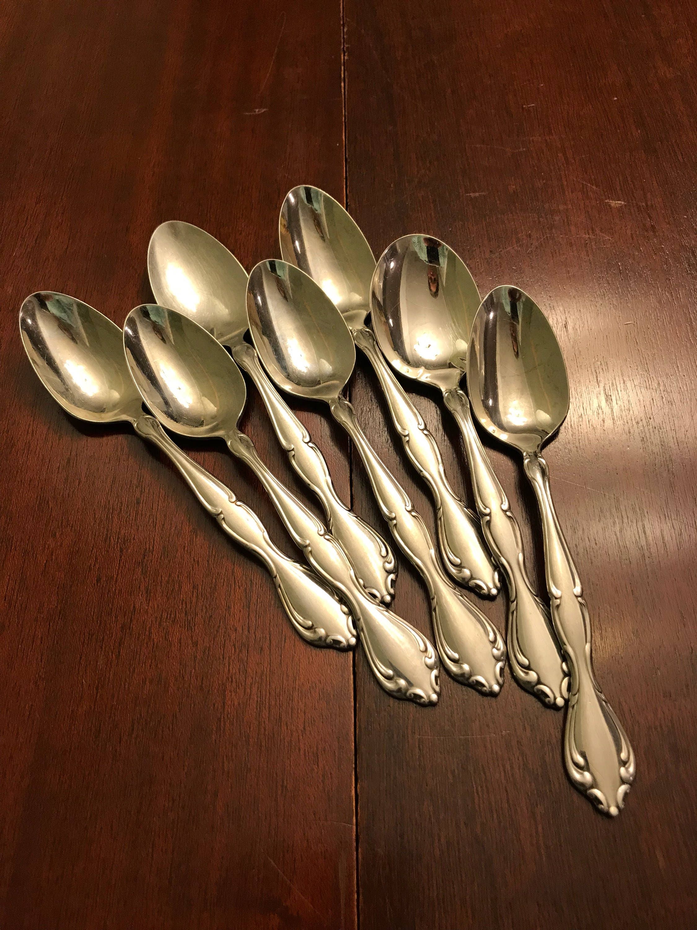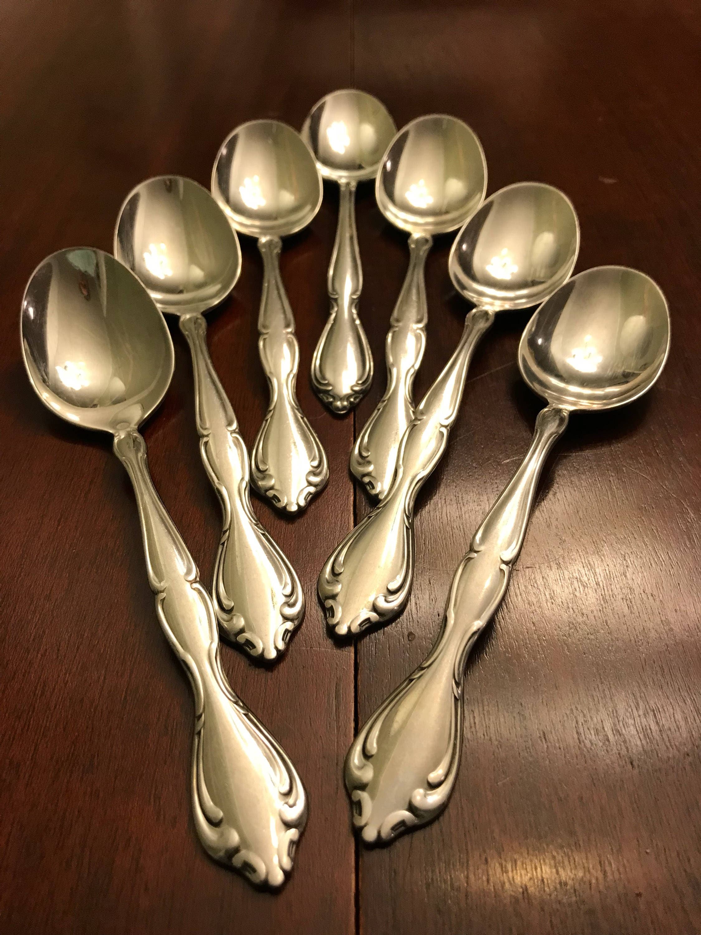 8- oval soup spoons 6 3/4” (1 Soup spoon is slightly different, it is marked Deluxe on the back)
