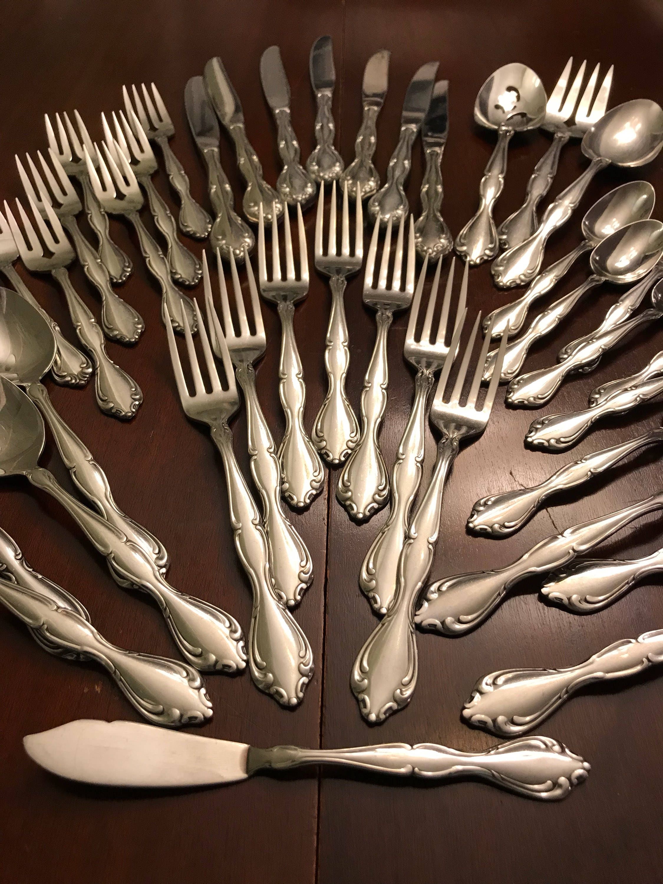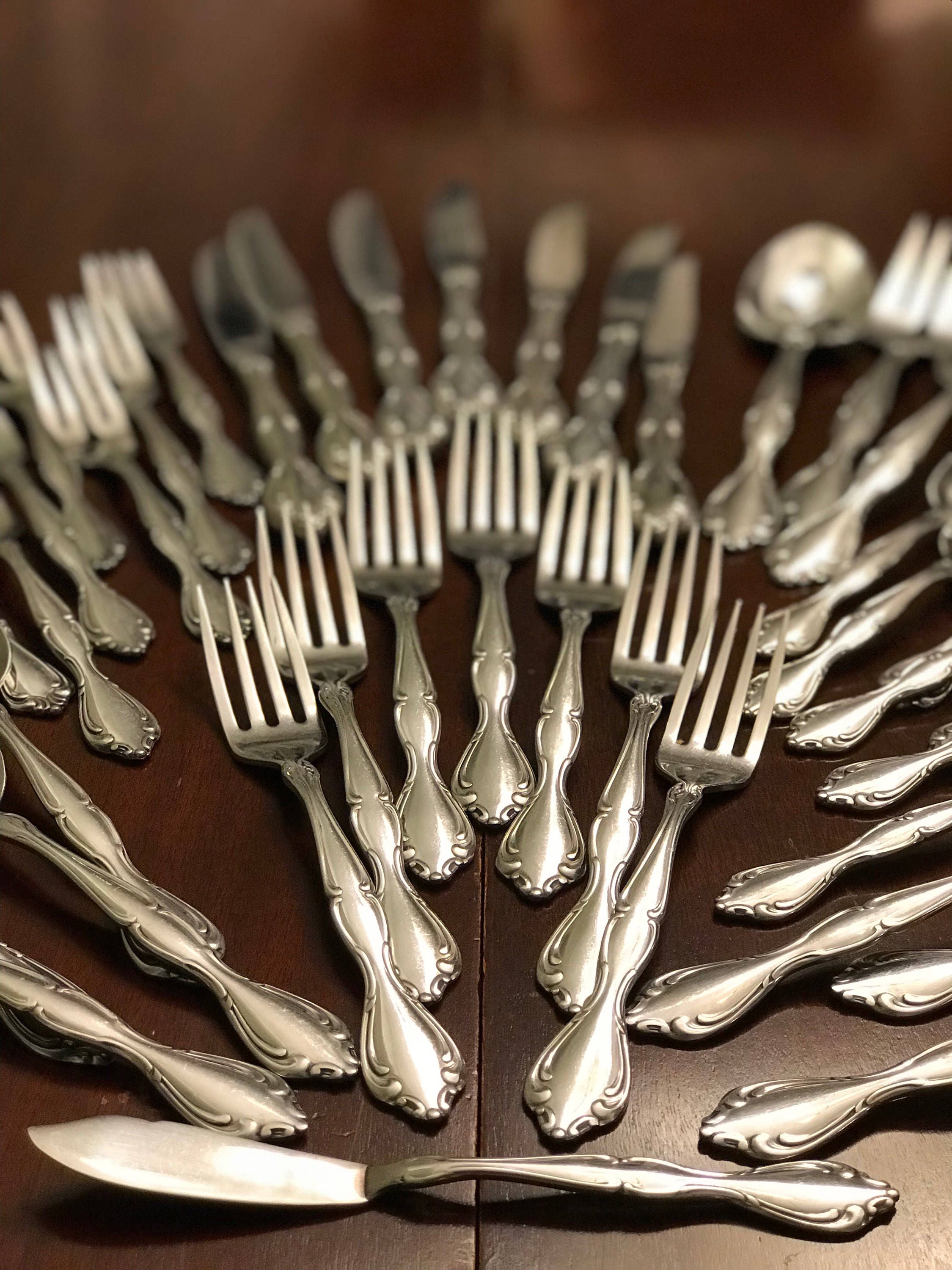 A set of Vintage Cantata Flatware by Oneida Community. This is Elegant Flatware in shining Stainless Steel. This as unusual large collection of this discontinued pattern.