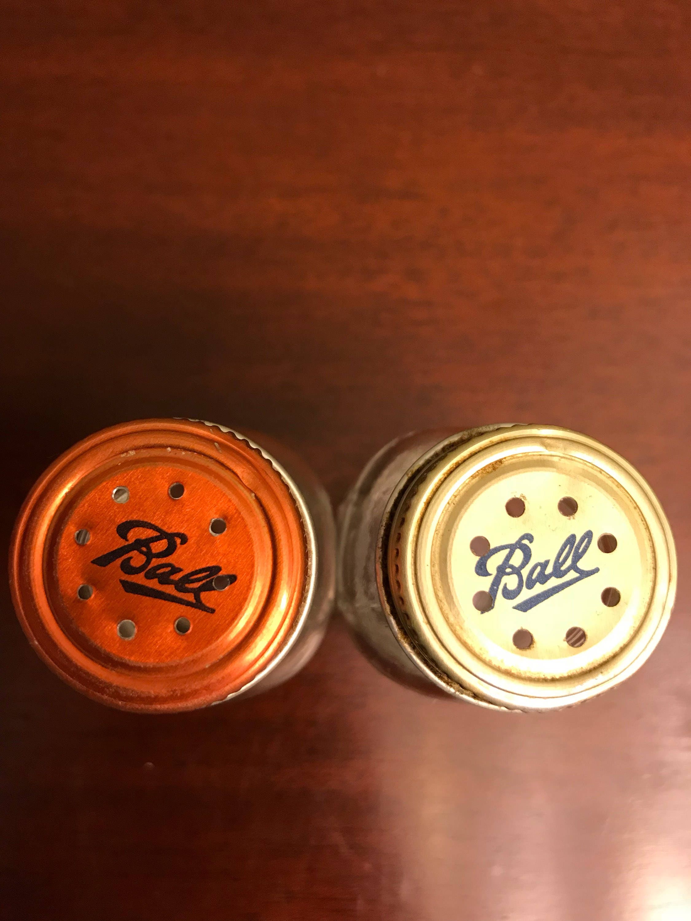 Vintage miniature Ball Jars. Originally used as a Salt and Pepper Shakers set, now this cute set of Miniature Ball canning jars could also be used as decorations. They would be adorable as mini vases. The lids of these shakers are a rose-red and Gold Color. This is a vintage set from an Estate sale. Not a reproduction.