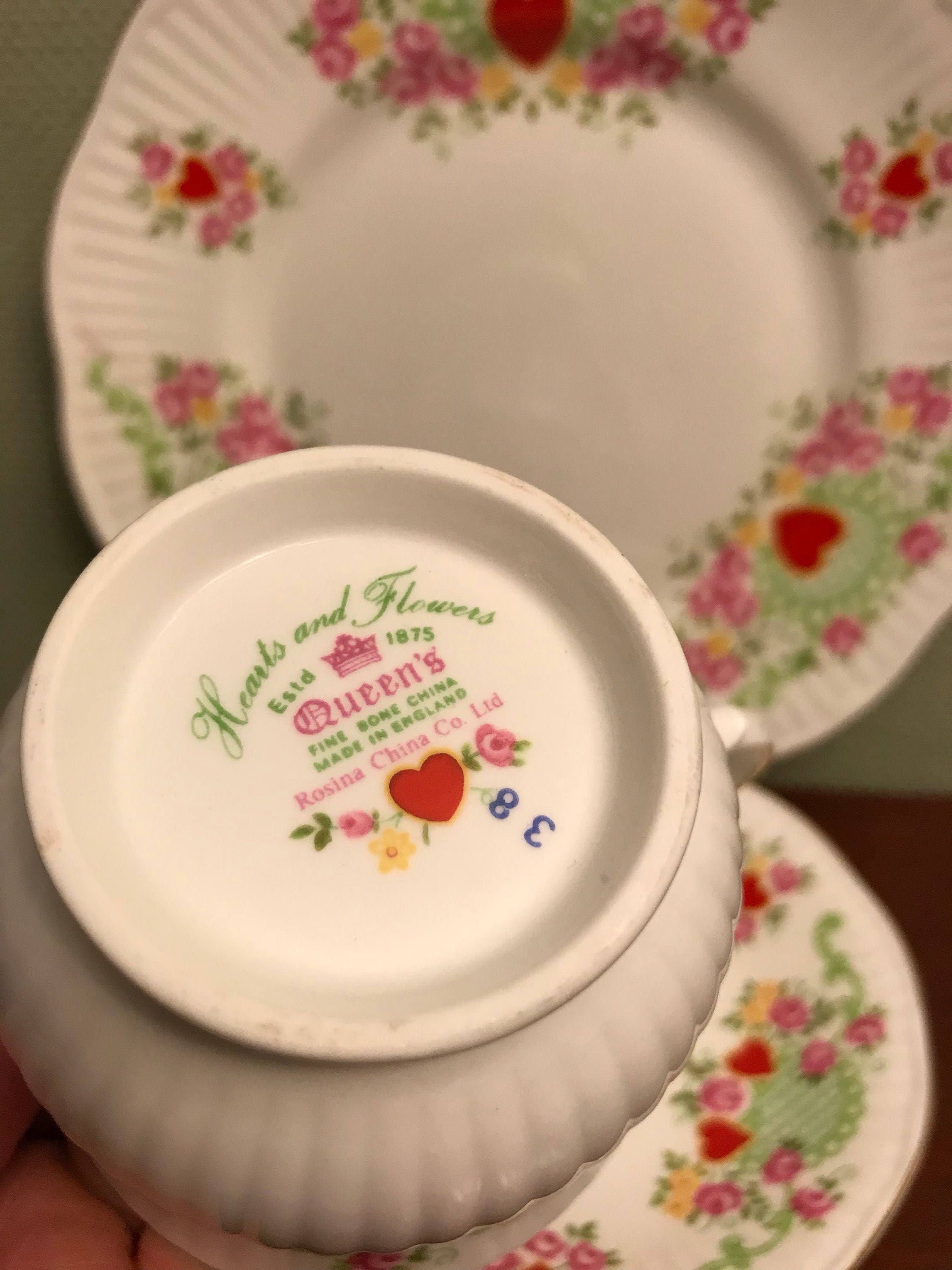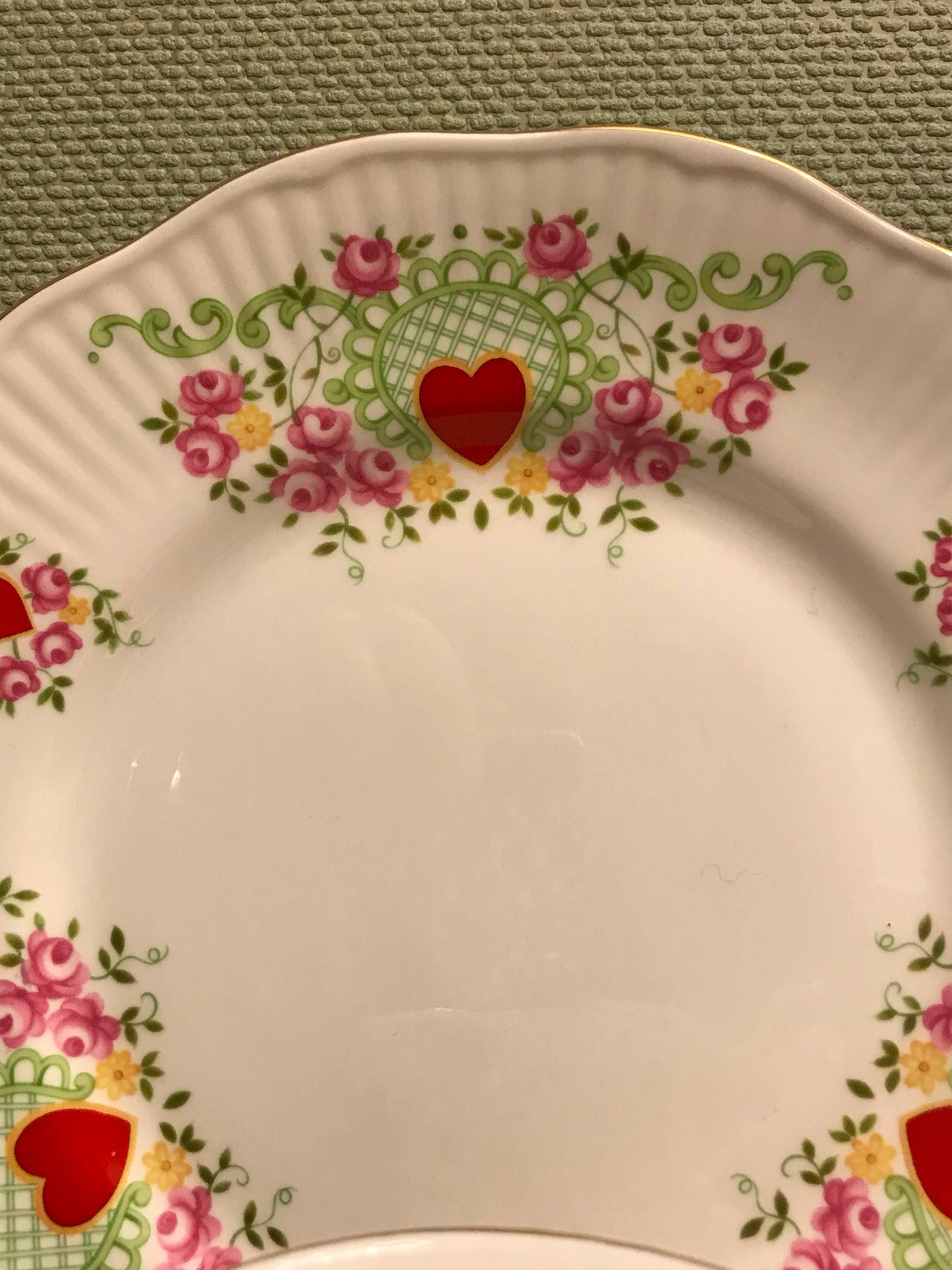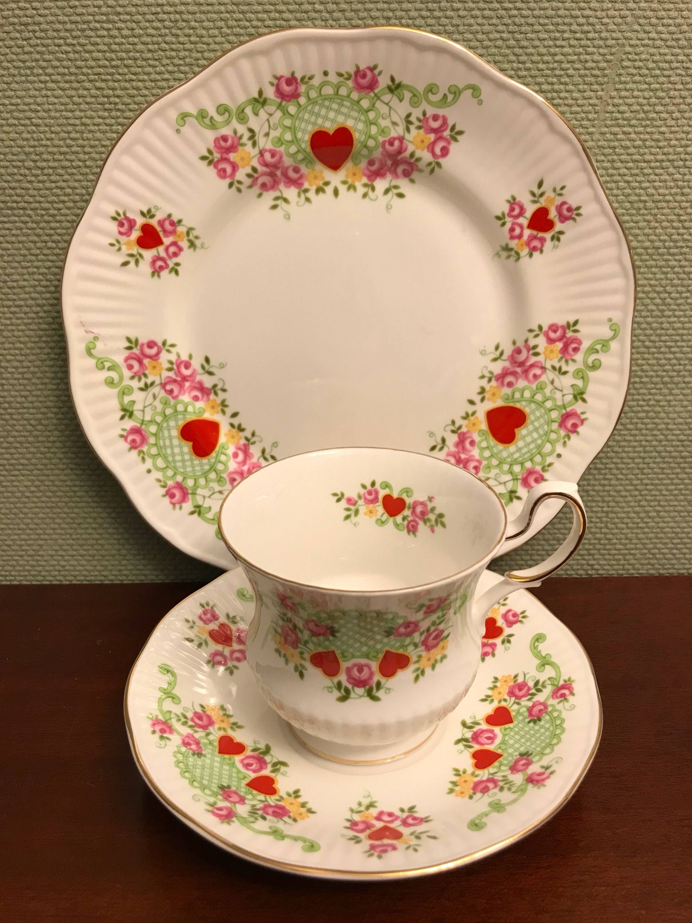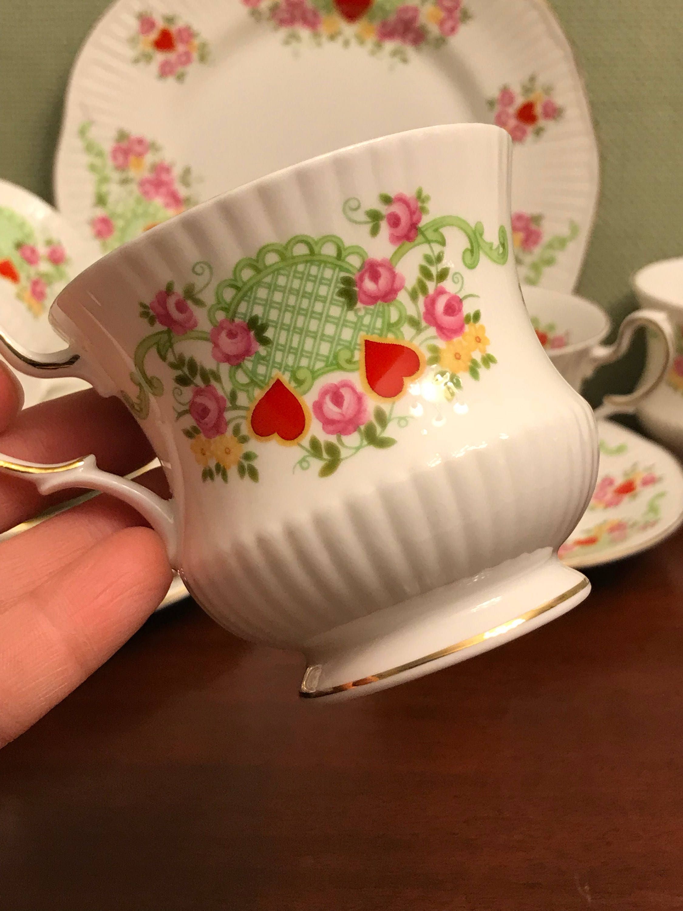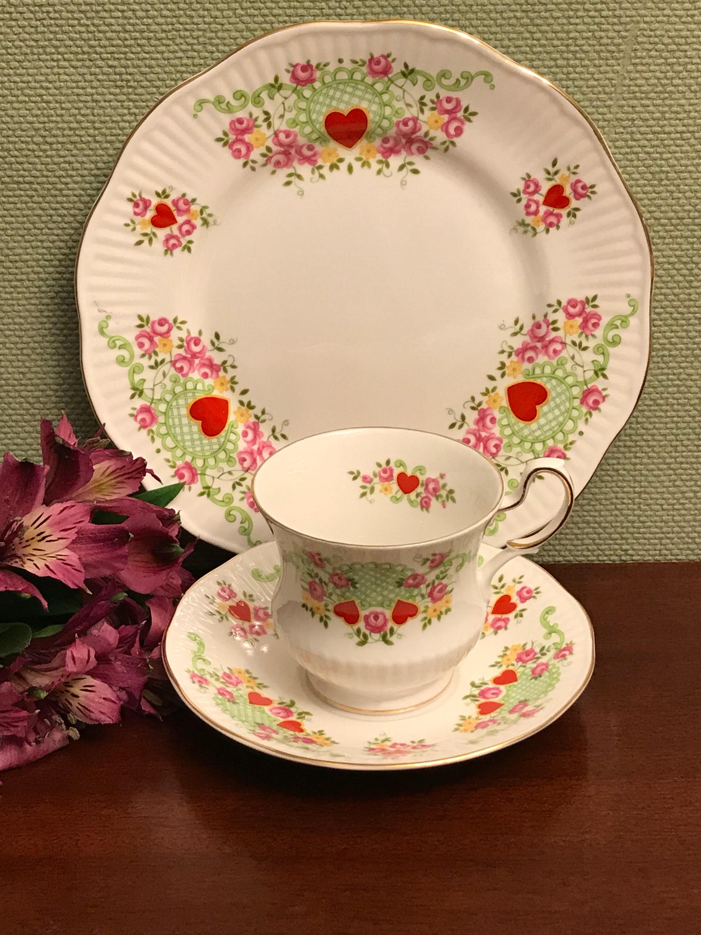 Repeated in the Saucer. The pieces are hand decorated with Gold leaf. They have Gorgeous Pink roses surrounding a red heart. A lovely green lattice pattern accents this unique china. Beautiful.