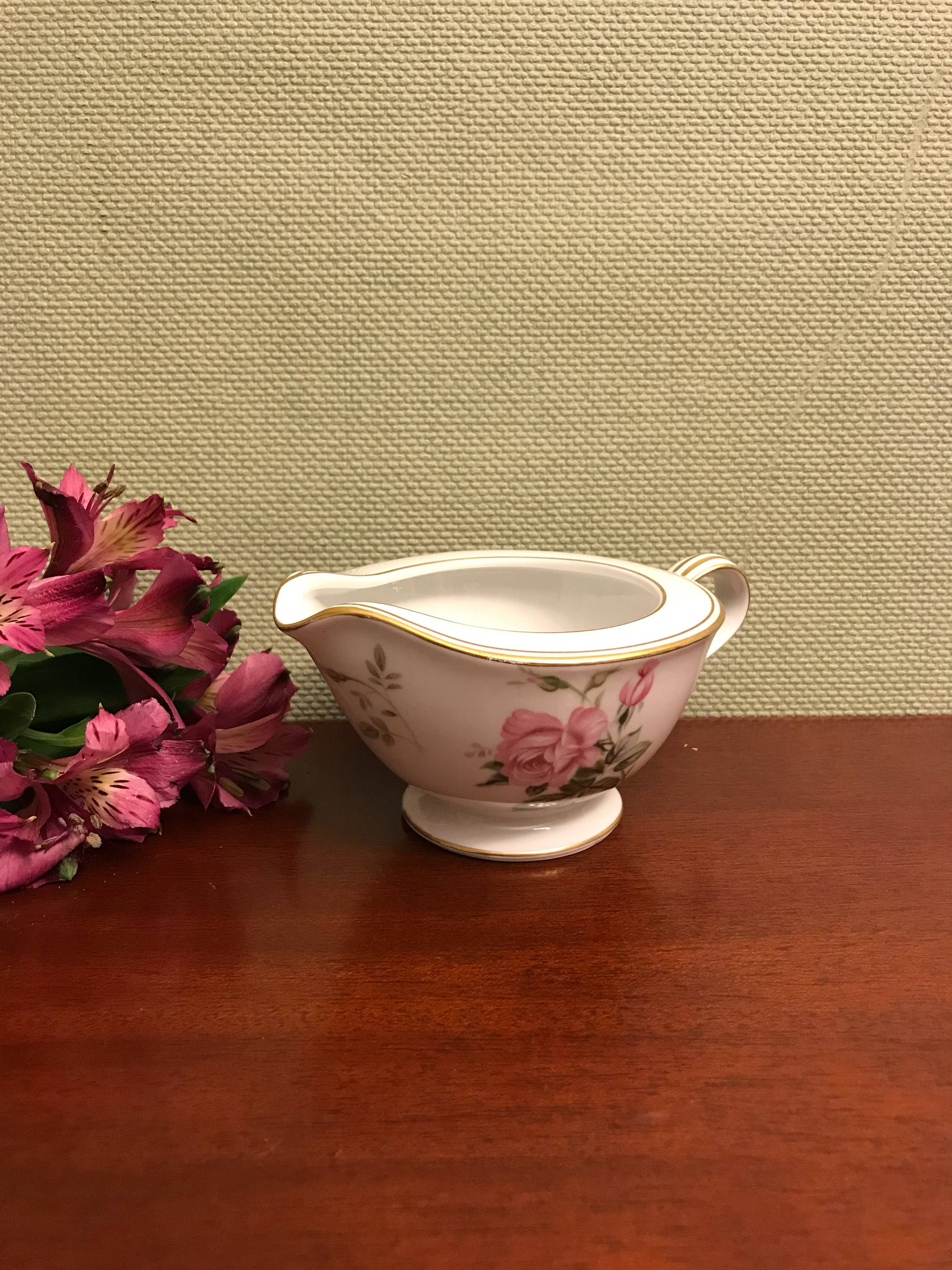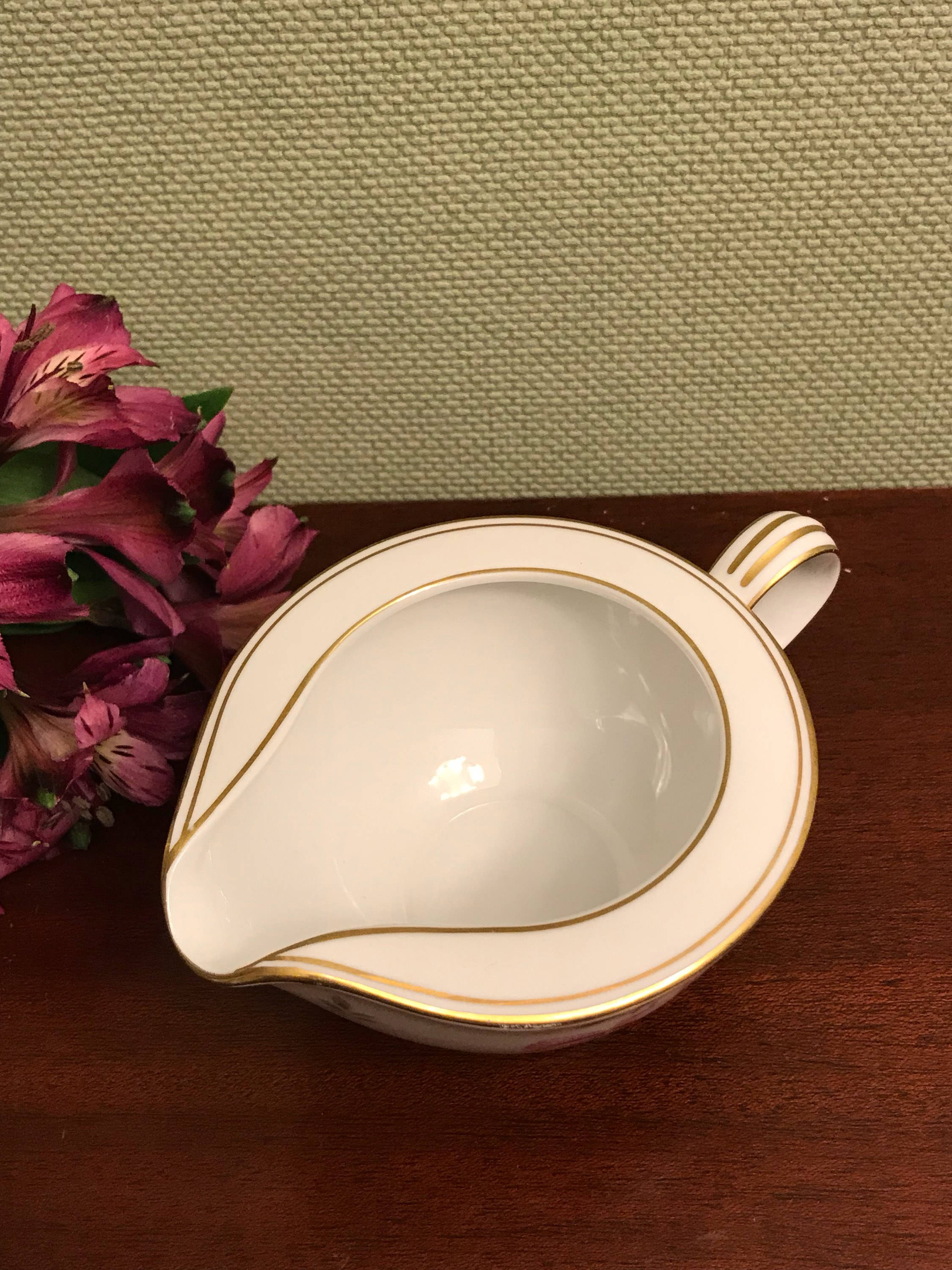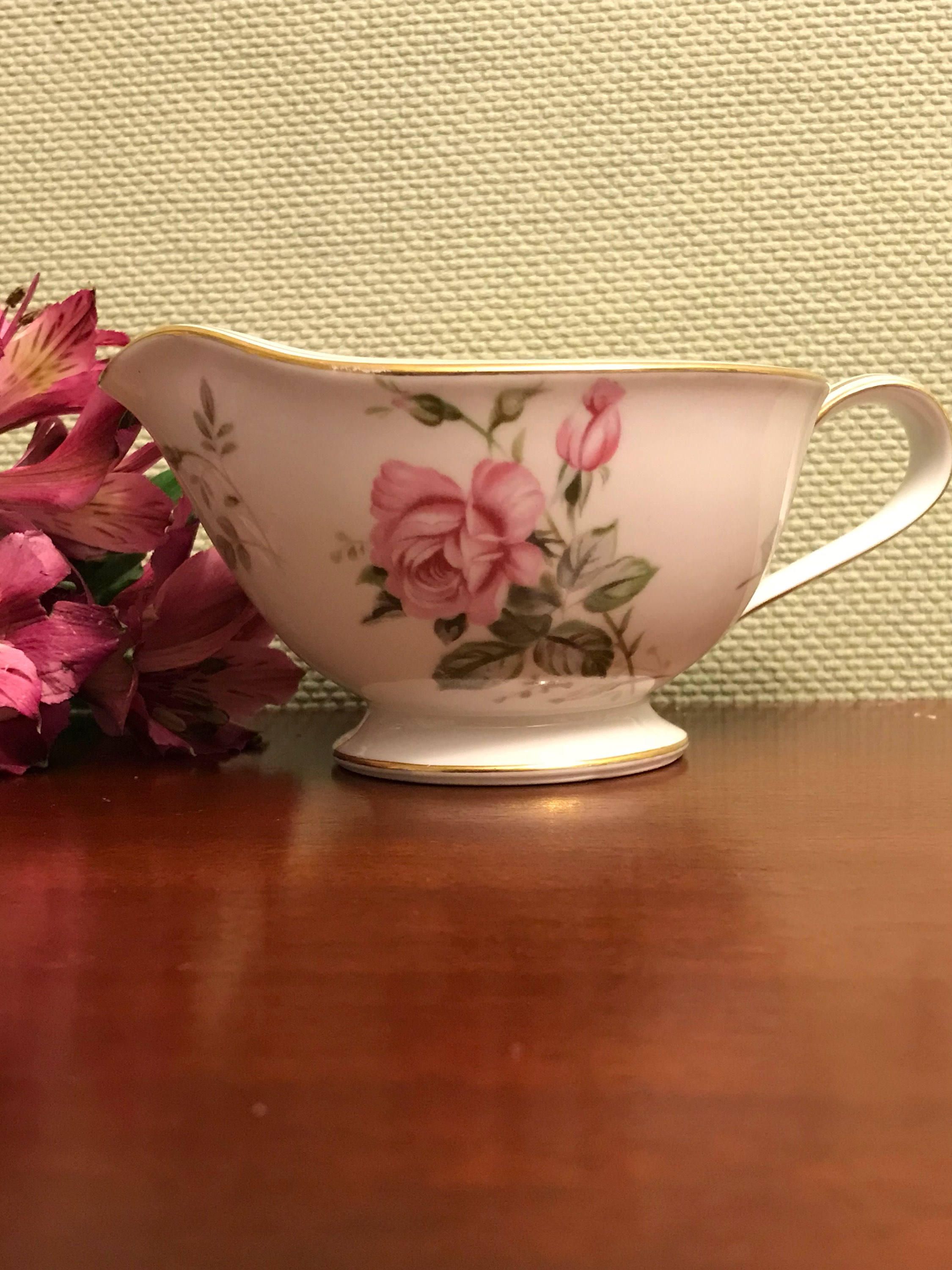 This lovely Noritake Creamer is in the Rosa 5460 pattern. This pattern has beautiful Groupings of Pink Roses & Buds, with Taupe Leaves. It has a graceful design of gold lines accenting the handles. The edges are trimmed in double lines of Gold Leaf. A classic floral rose china pattern. It would be a lovely addition to any Holiday Table.