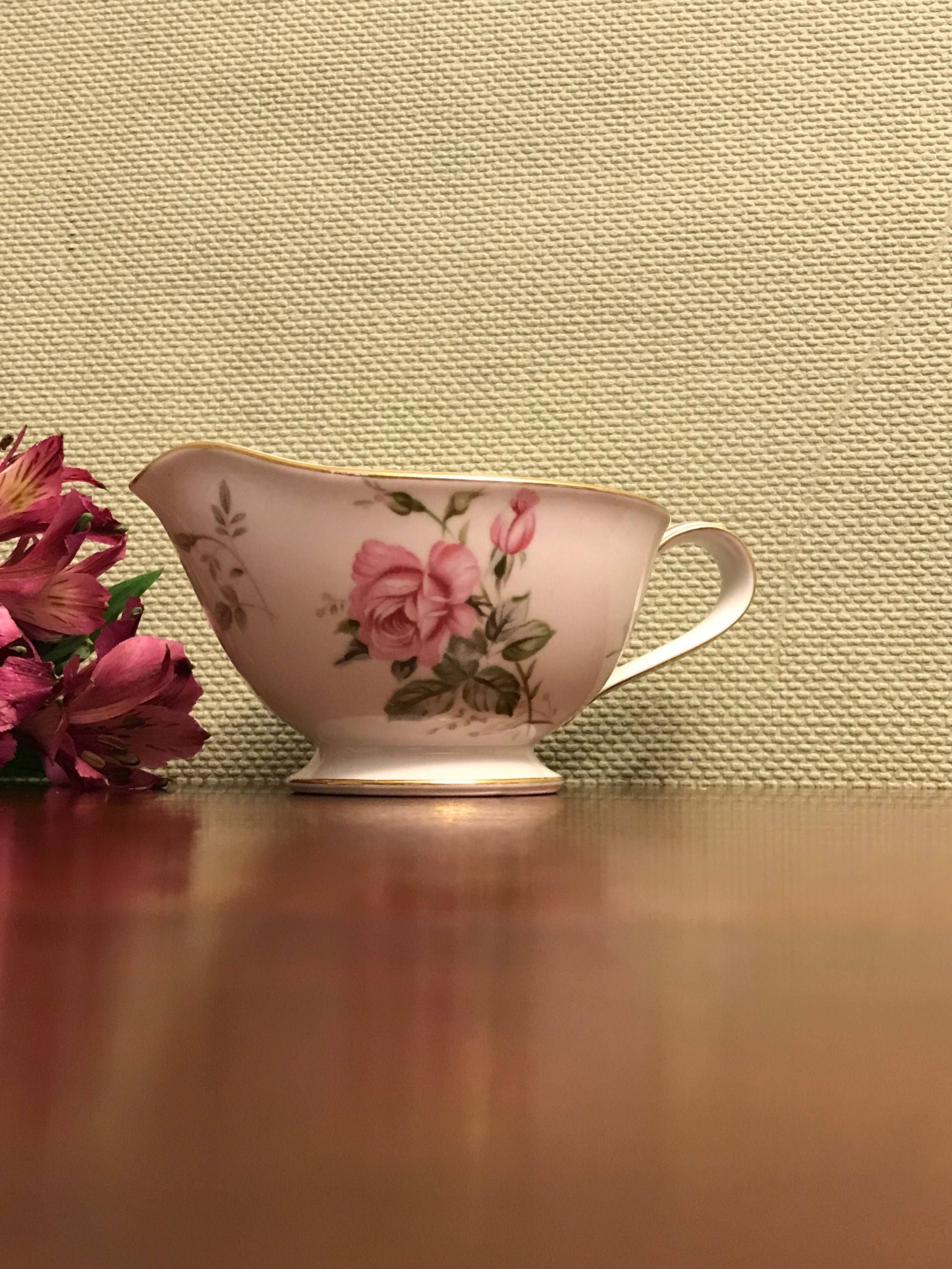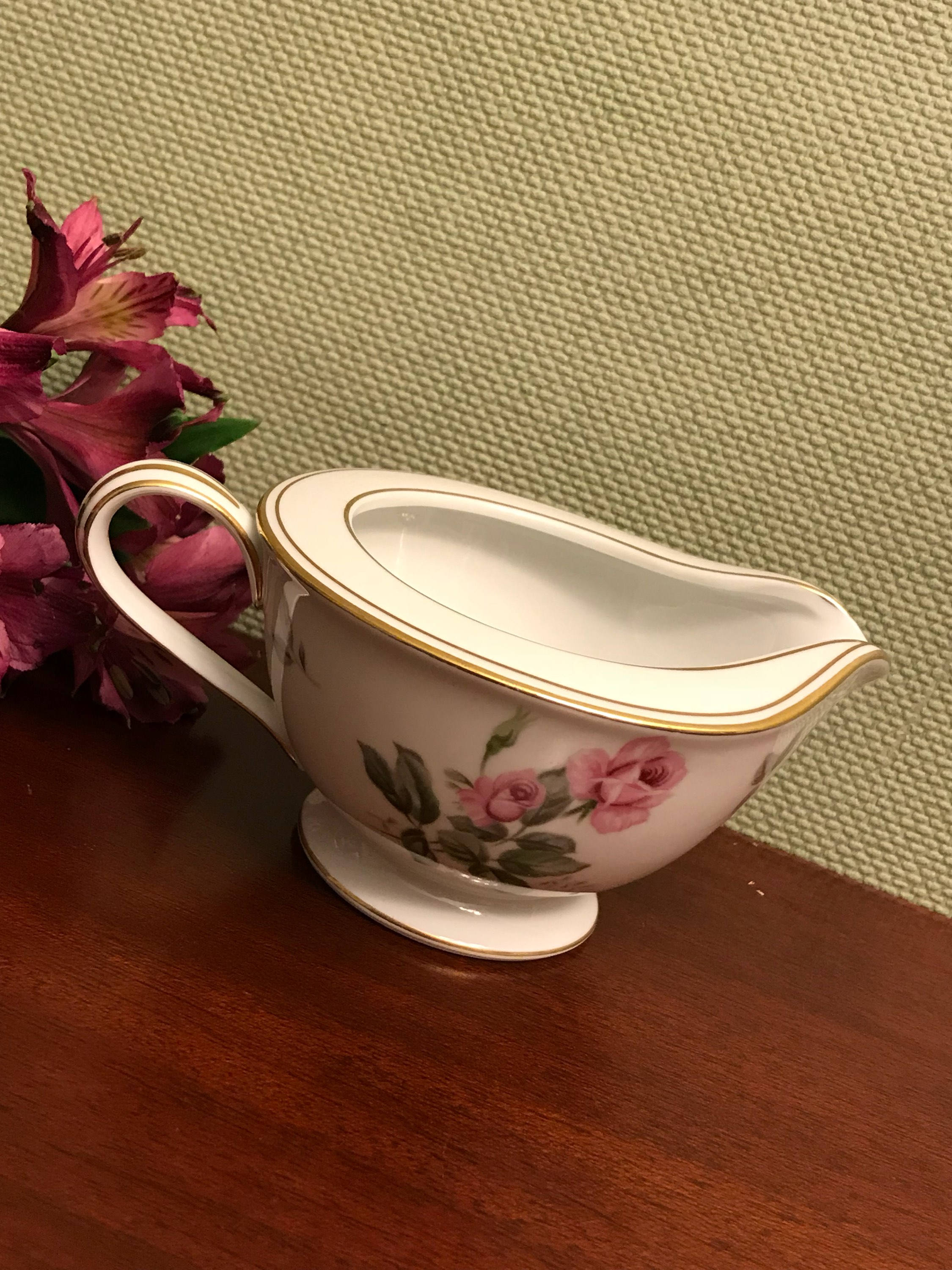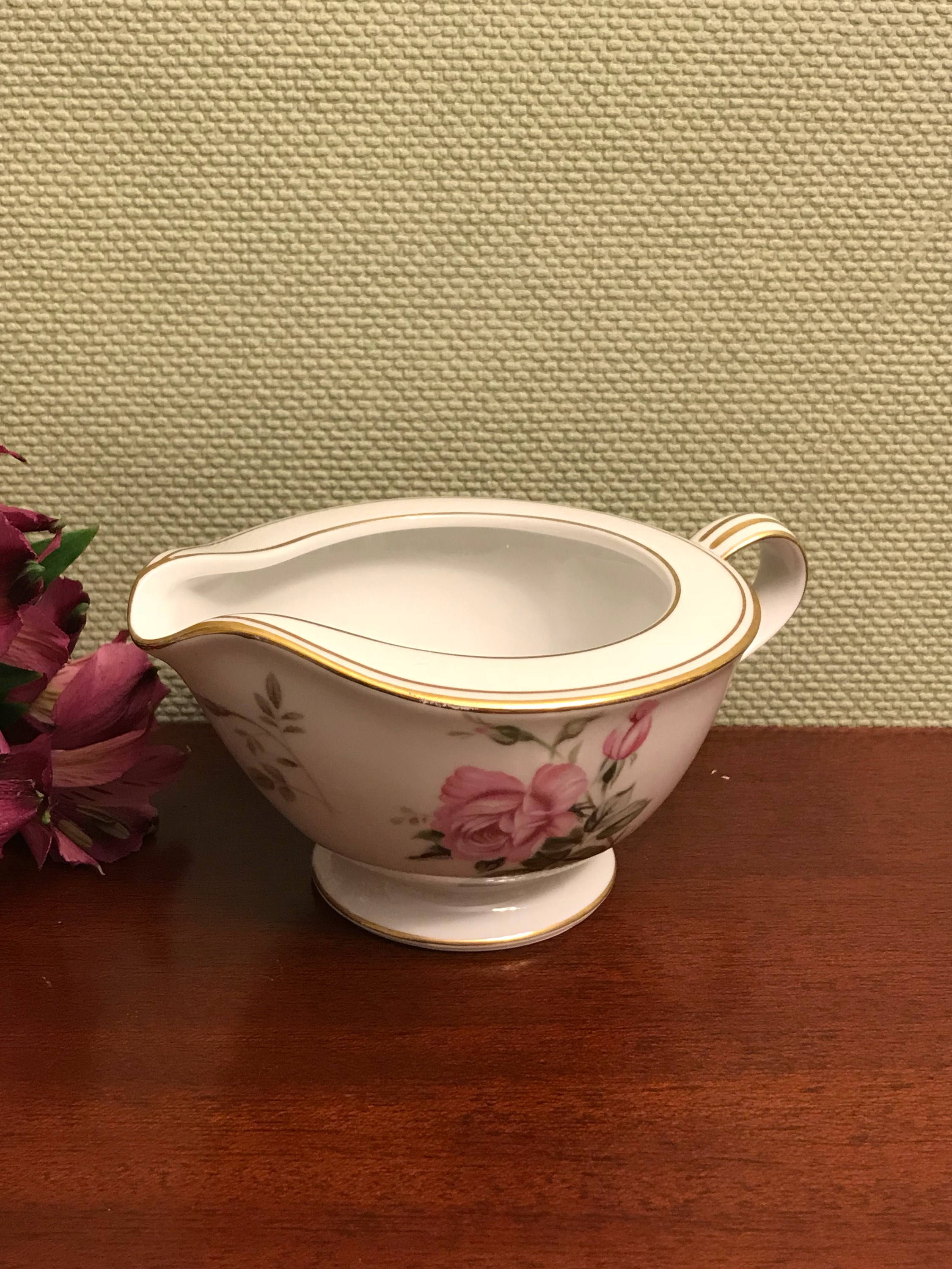 This lovely Noritake Creamer is in the Rosa 5460 pattern. This pattern has beautiful Groupings of Pink Roses & Buds, with Taupe Leaves. It has a graceful design of gold lines accenting the handles. The edges are trimmed in double lines of Gold Leaf. A classic floral rose china pattern. It would be a lovely addition to any Holiday Table.