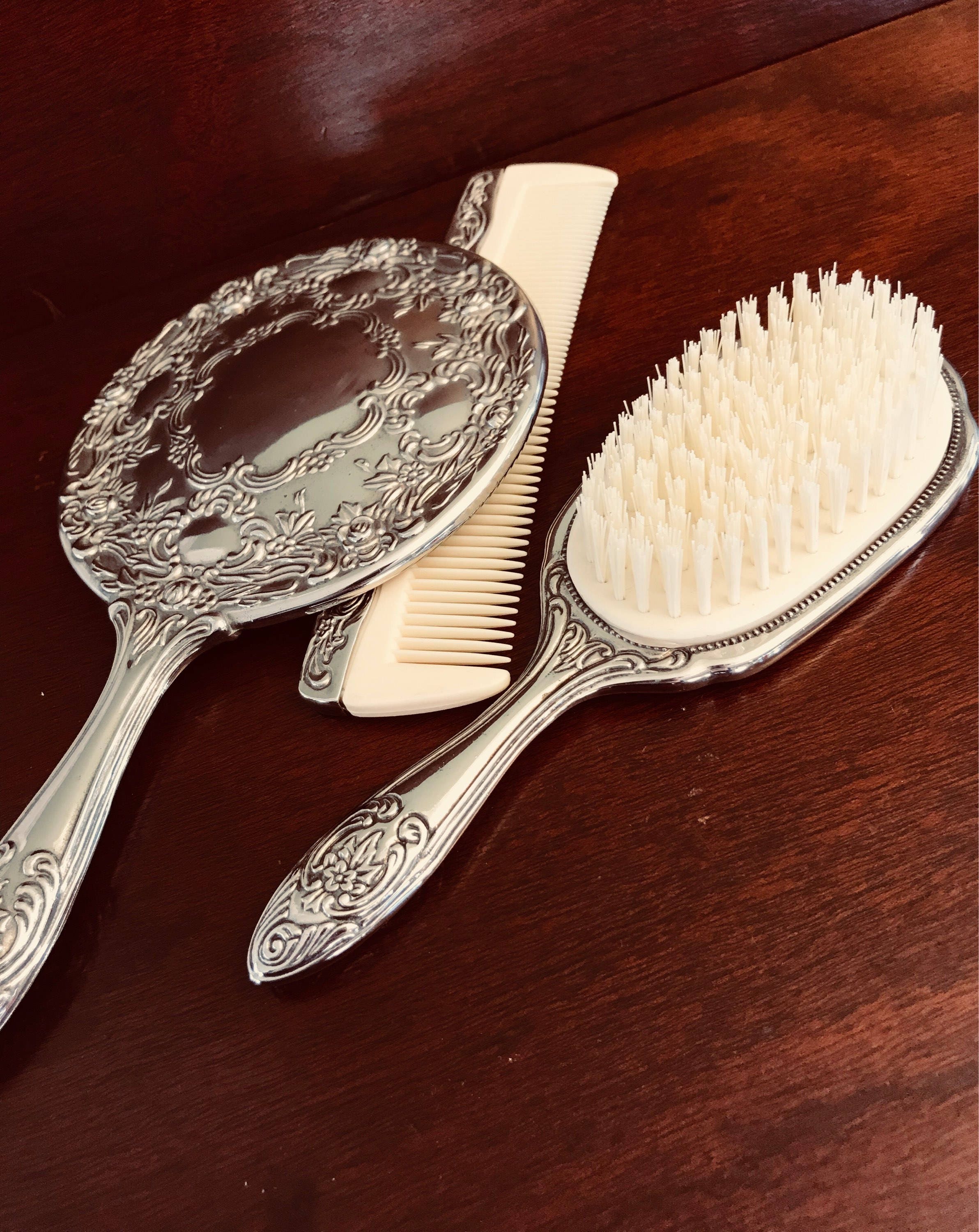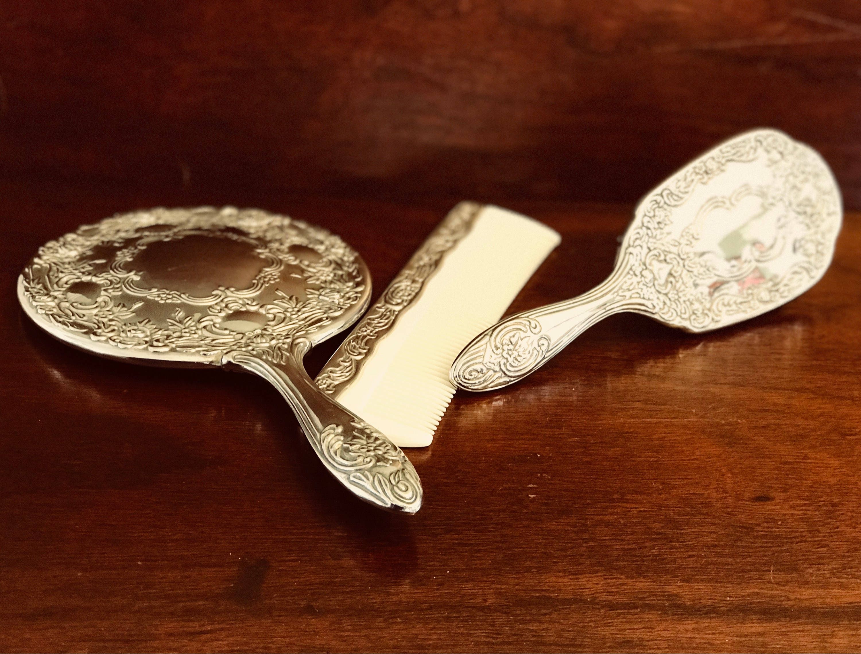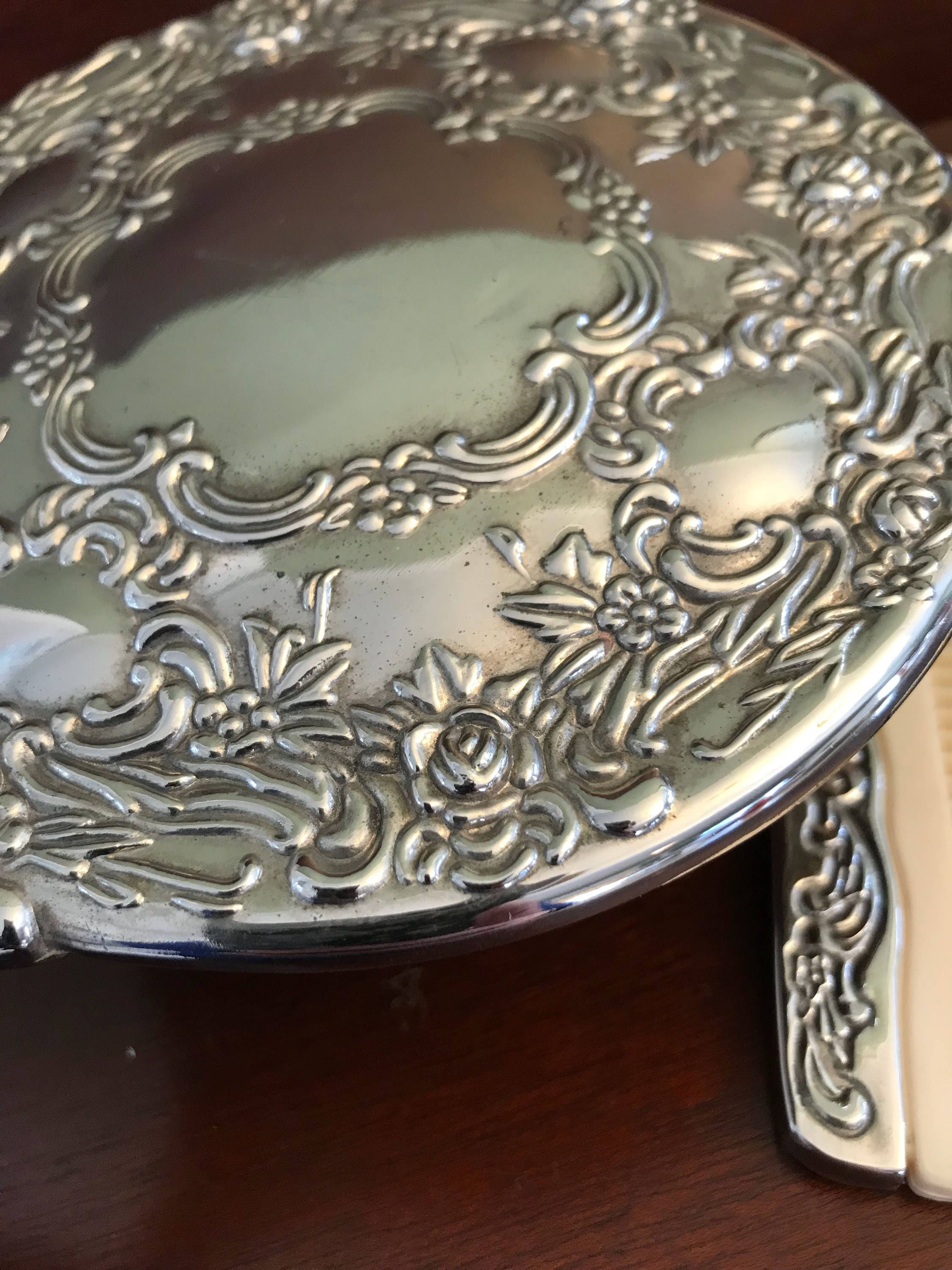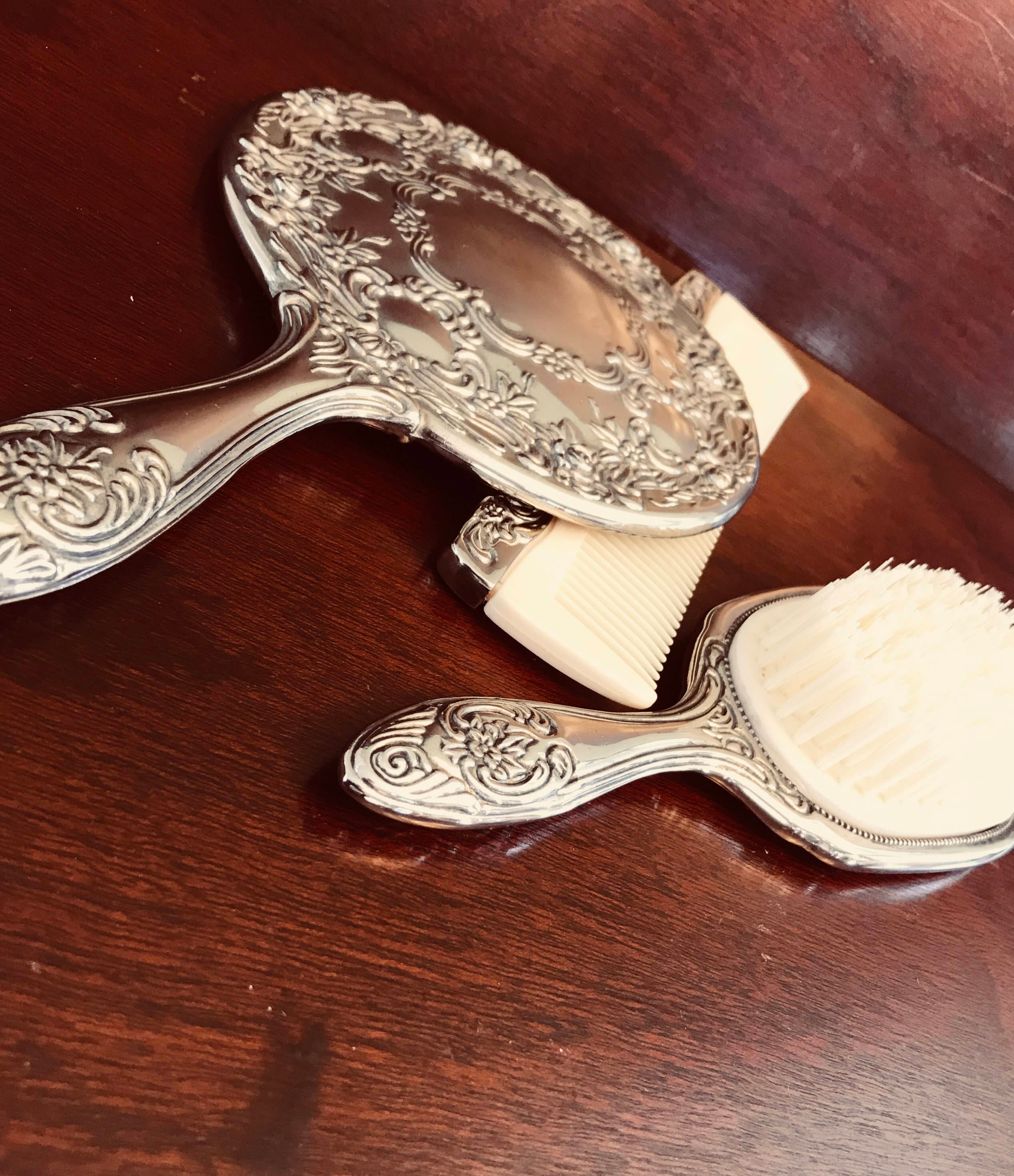 Vintage Vanity Set with Silver Plated Hand Mirror and matching Comb and Brush. This is an elegant Vanity Set with an ornate embossed floral design in elegant Silver Plate.