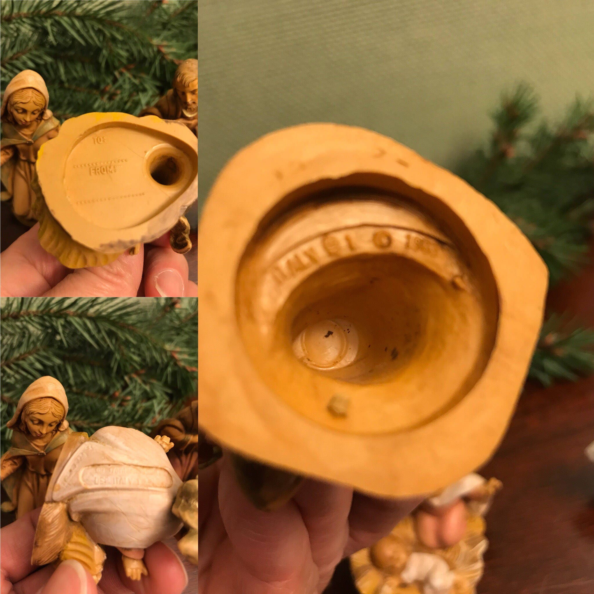 This is a lovely Fontanini nativity set. Fontanini is a renowned producer of gorgeous Nativity sets that have become highly collectible. This set has lovely detailed figurines made of blown plastic and washed with an antique brown, they were then delicately painted soft pastels.
