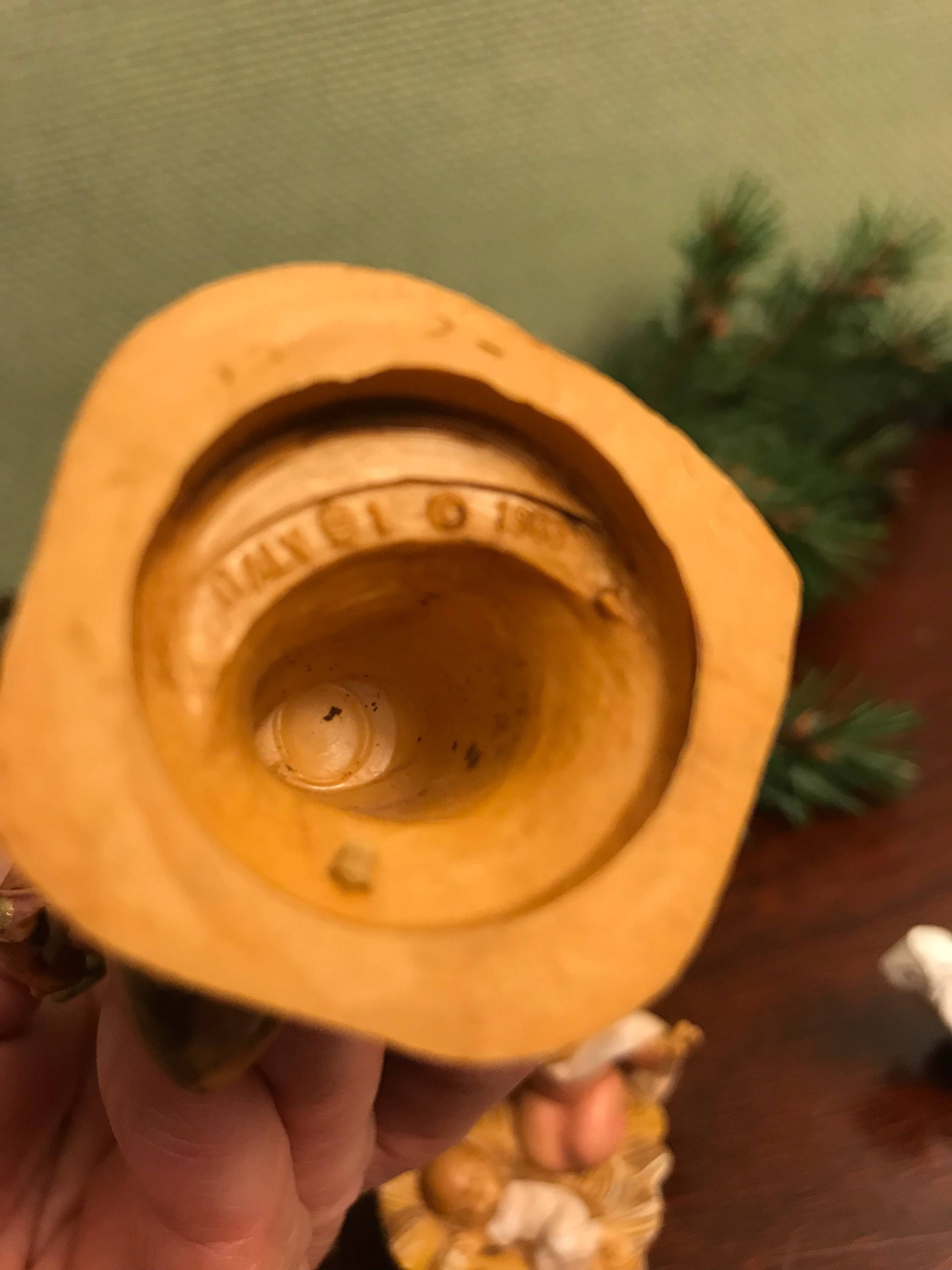 The figurines are all marked Fontanini. Baby Jesus and the Angel are marked Fontanini 1983 Dept Italy 139. There is a place marked To:—— From:——. The sheep are just marked Italy.