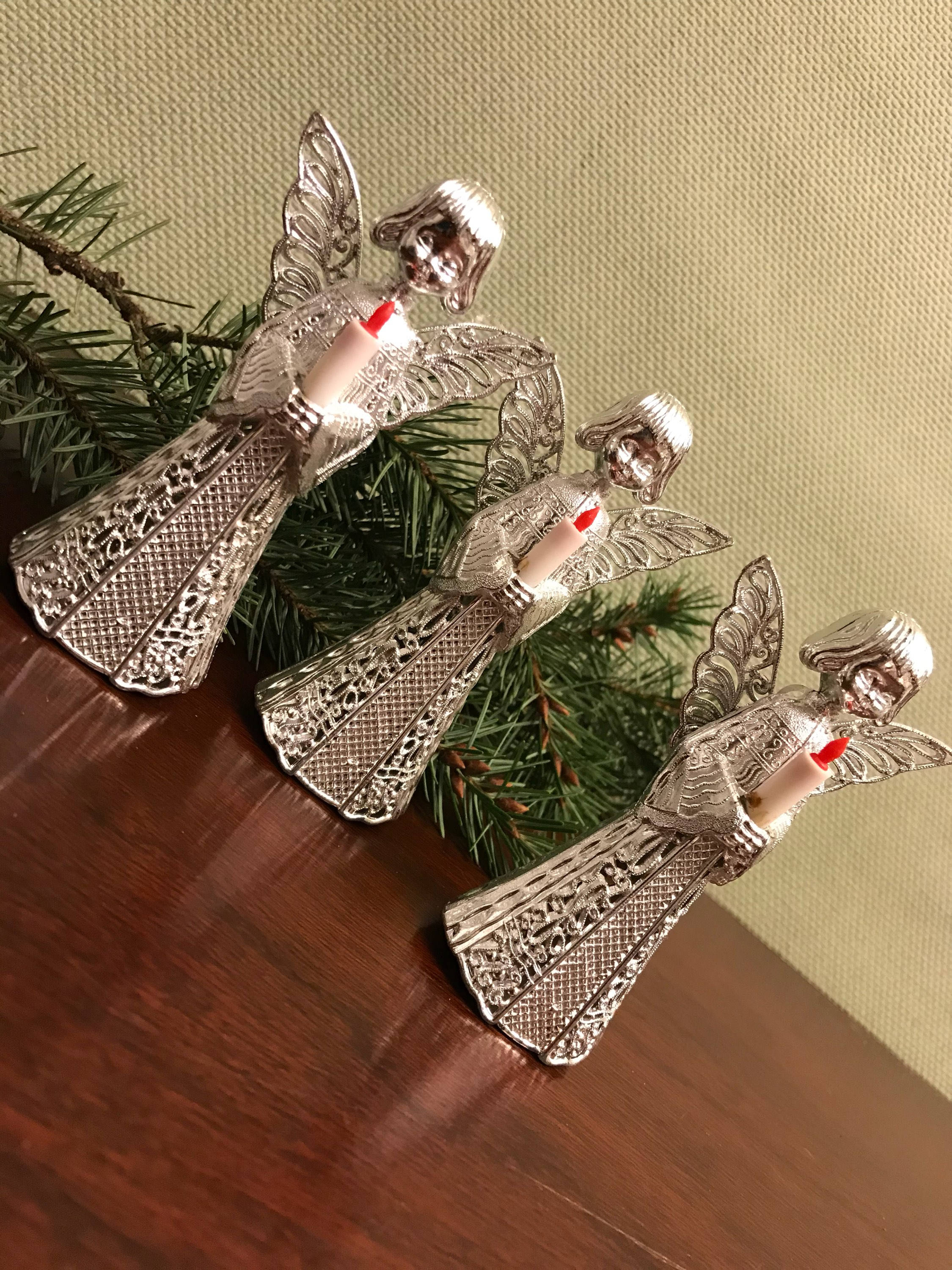 This is a beautiful vintage set of little Metalic Silver filigree Plastic angels. Each Angel is holding a tiny little candle. The dresses are very Ornate with the Pierced filigree design.