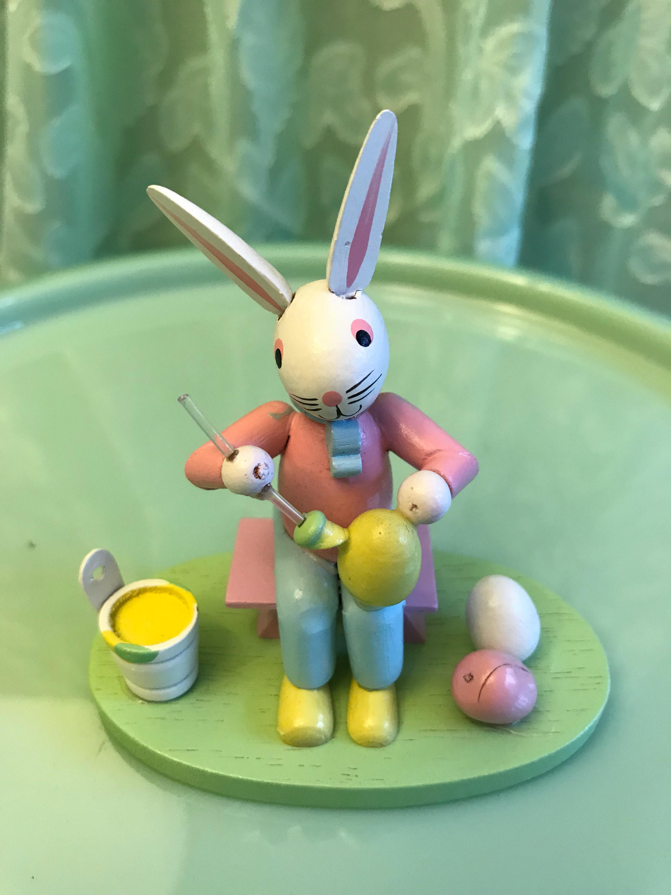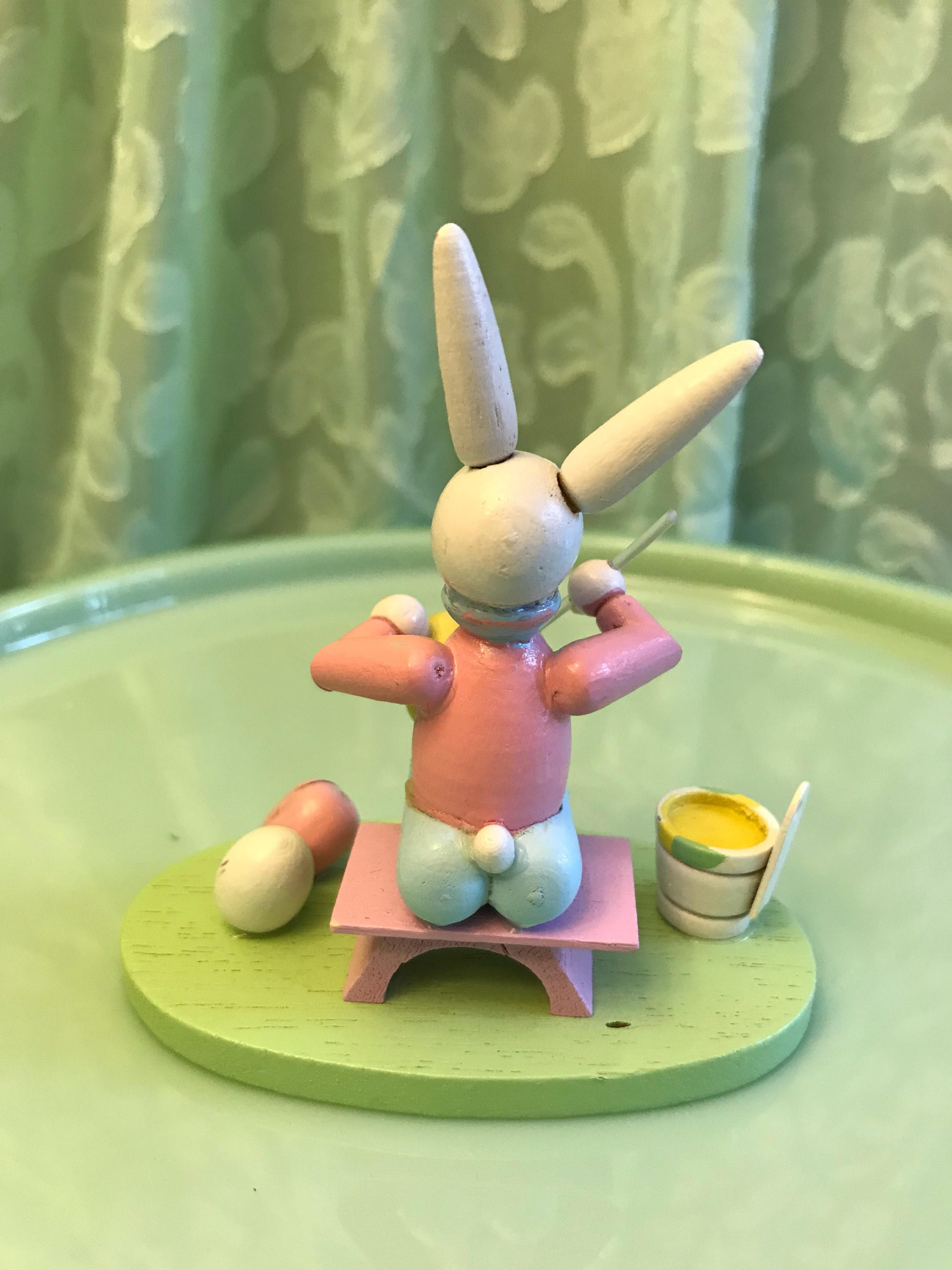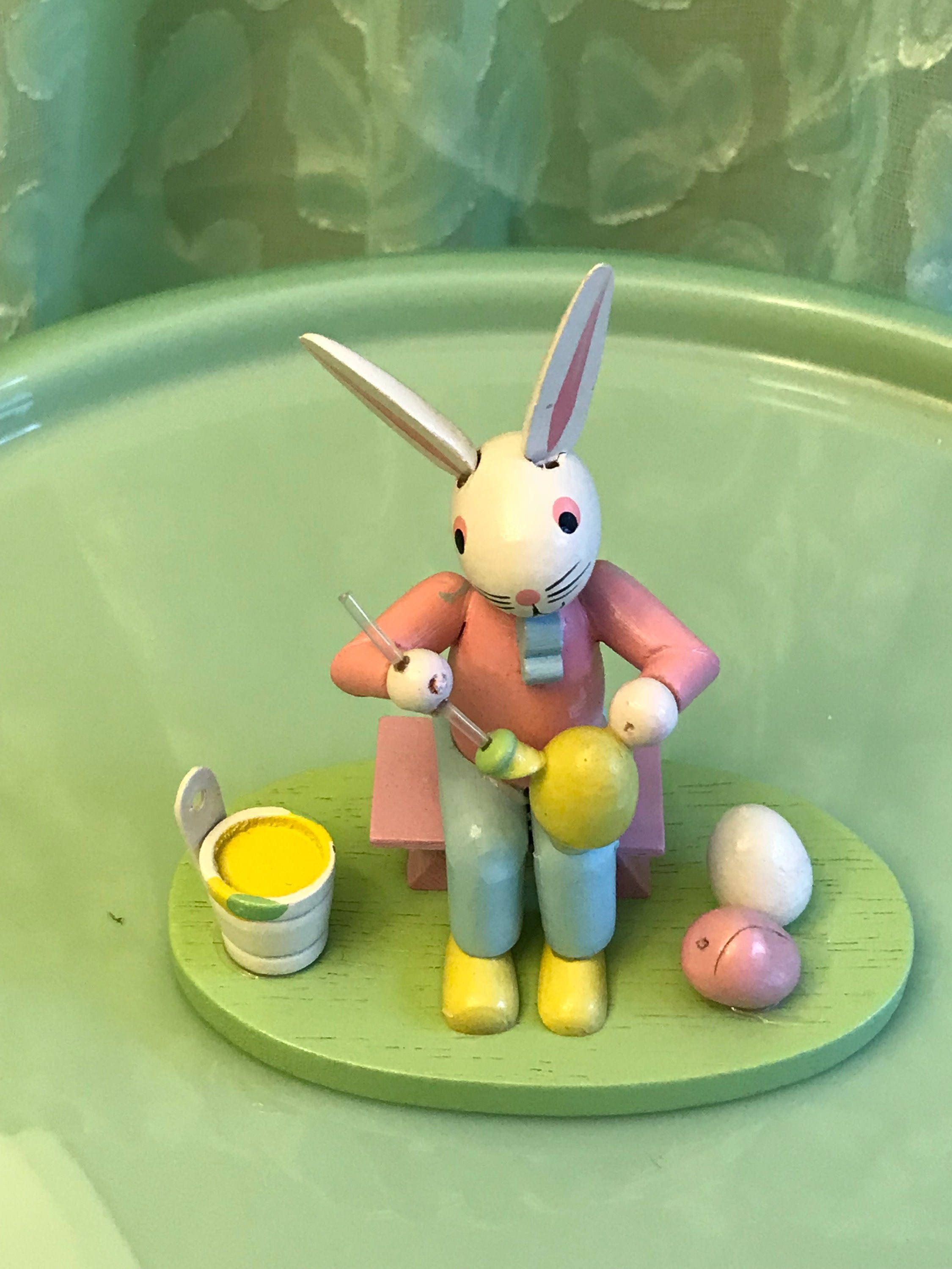 I believe this is a Vintage Erzgebirge Expertic Miniature Easter Bunny decorating Easter eggs. The Sticker is missing from the bottom. It is like other bunny miniatures made in German Democratic Republic in the 1980s. This is a Tiny handmade and hand painted Easter Bunny. Intricately handmade these miniatures are highly collectible. The Handpainted Enamel is expertly applied.