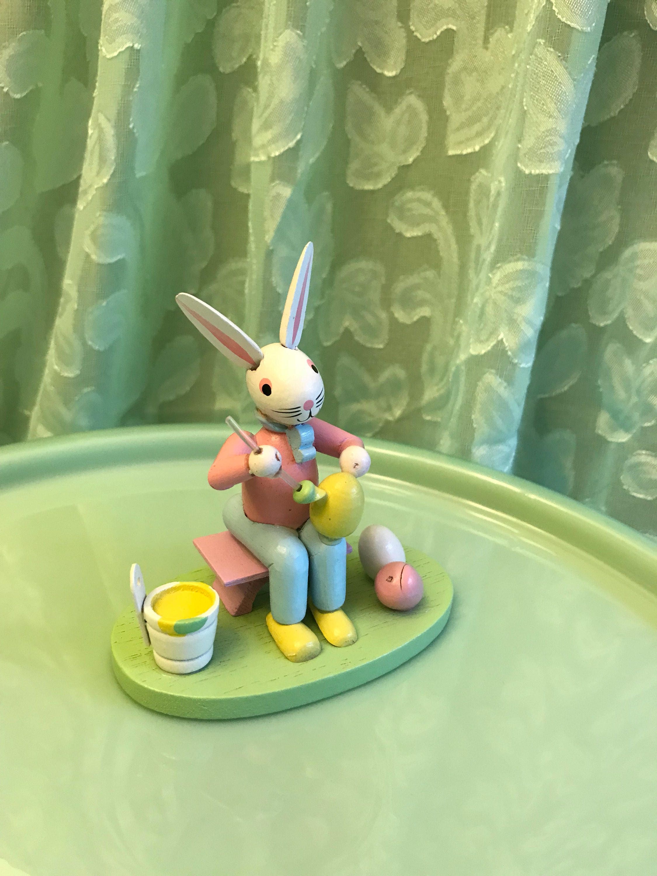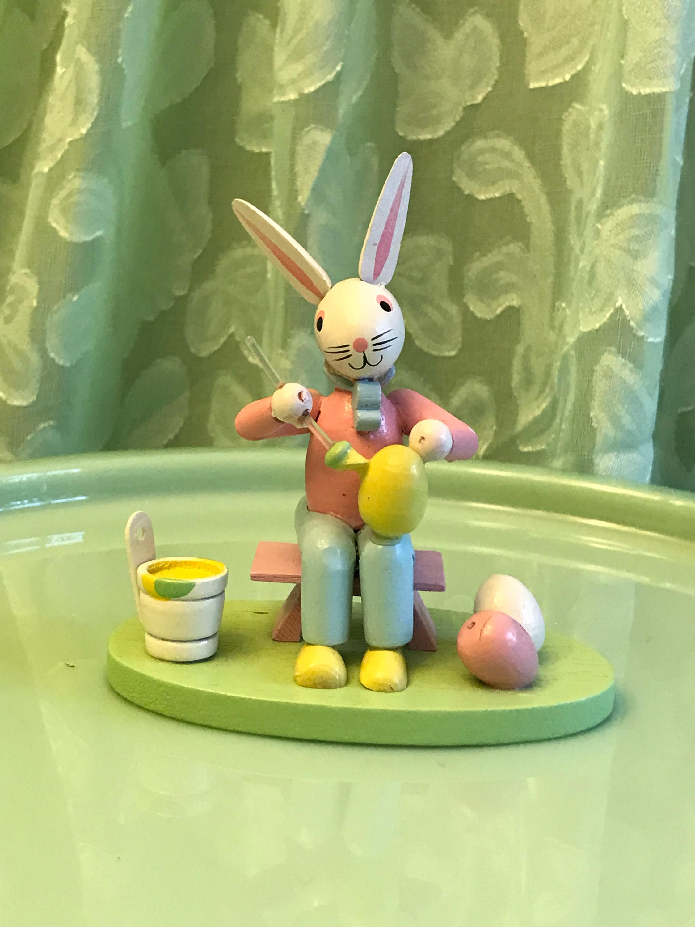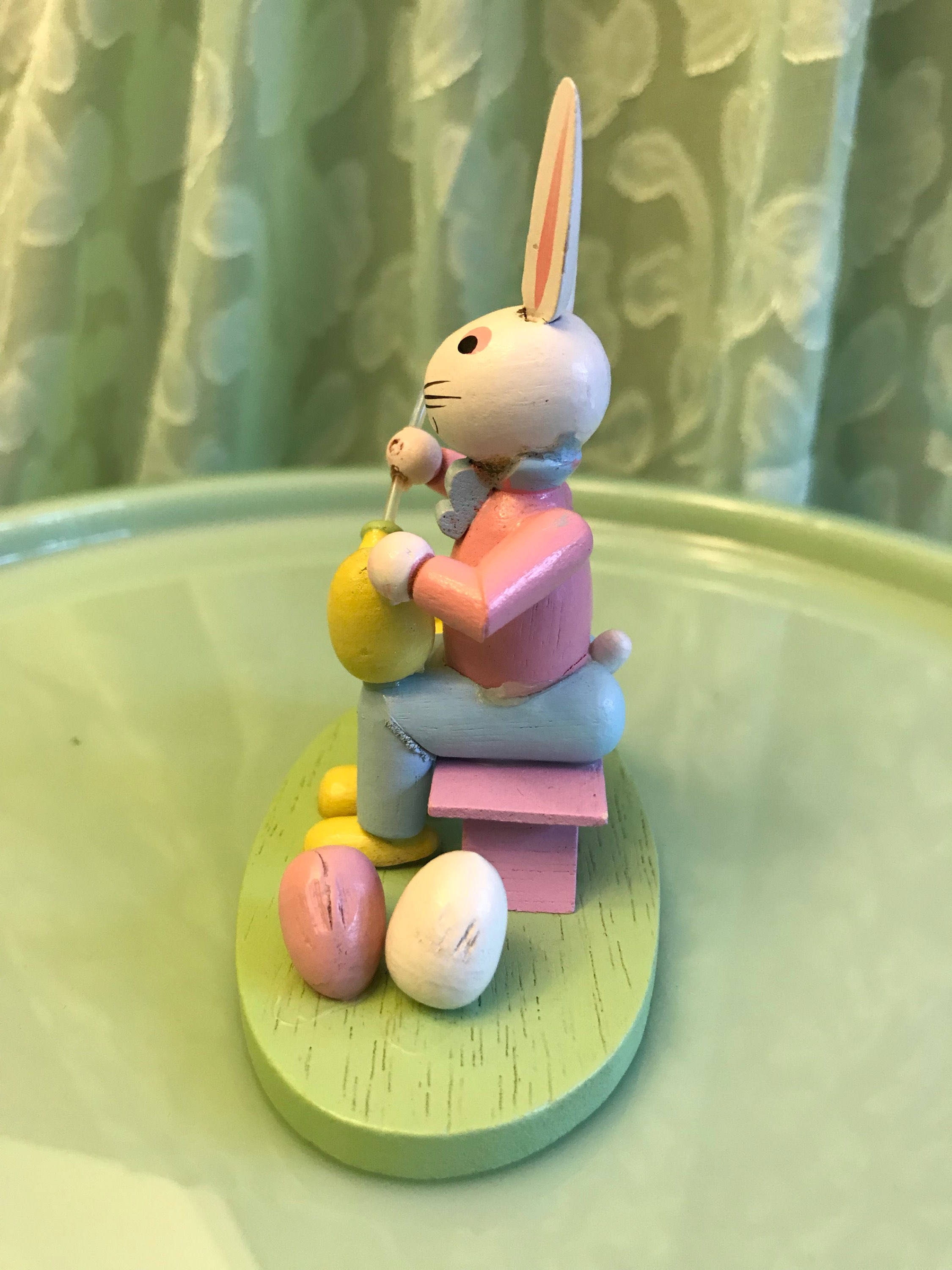 I believe this is a Vintage Erzgebirge Expertic Miniature Easter Bunny decorating Easter eggs. The Sticker is missing from the bottom. It is like other bunny miniatures made in German Democratic Republic in the 1980s. This is a Tiny handmade and hand painted Easter Bunny. Intricately handmade these miniatures are highly collectible. The Handpainted Enamel is expertly applied.