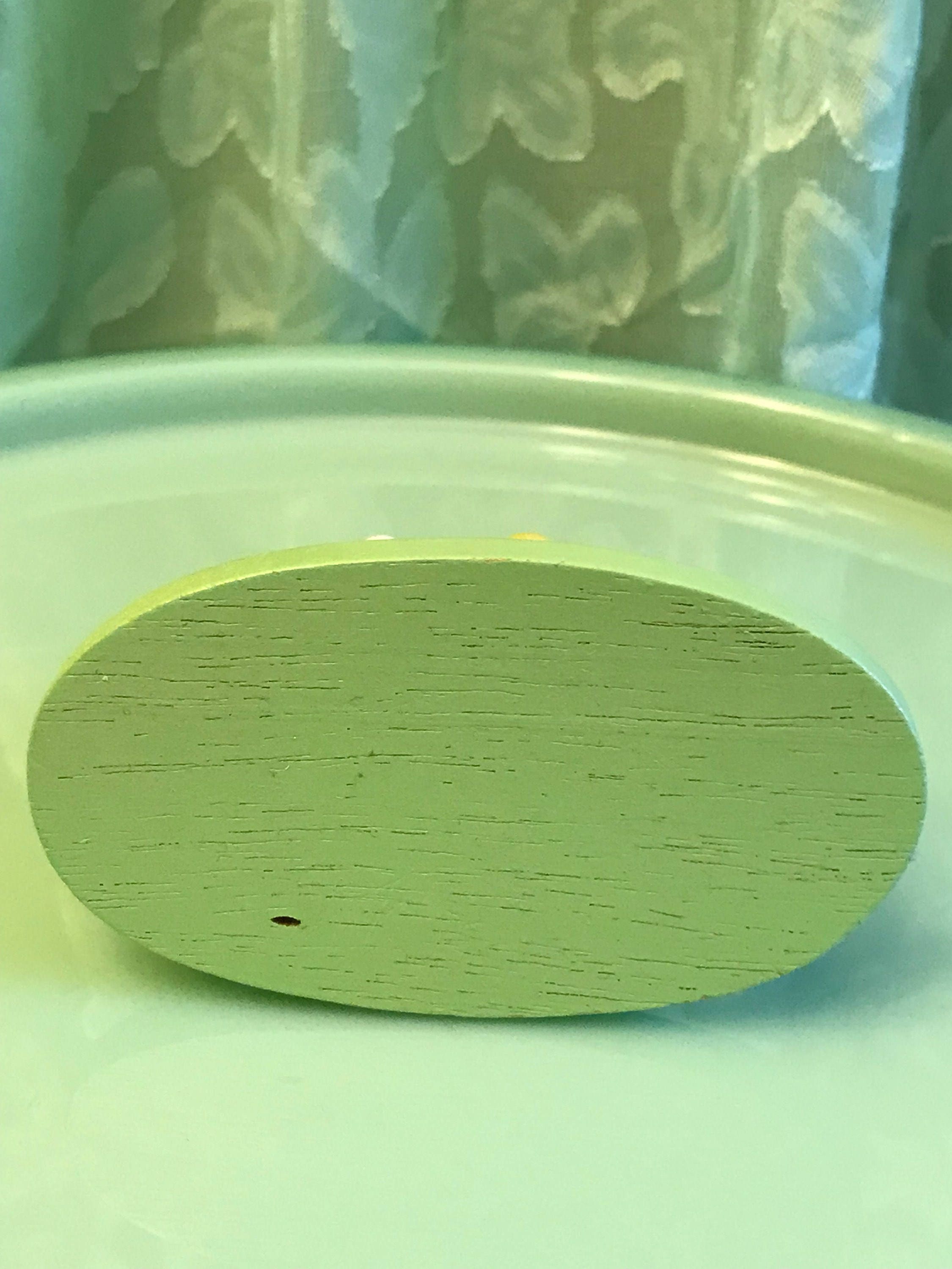 The tiny little base that the bunny sits on is grass green, he is sitting on a little lavender bench. Next to the Bunny is his paint bucket and little eggs. So cute!