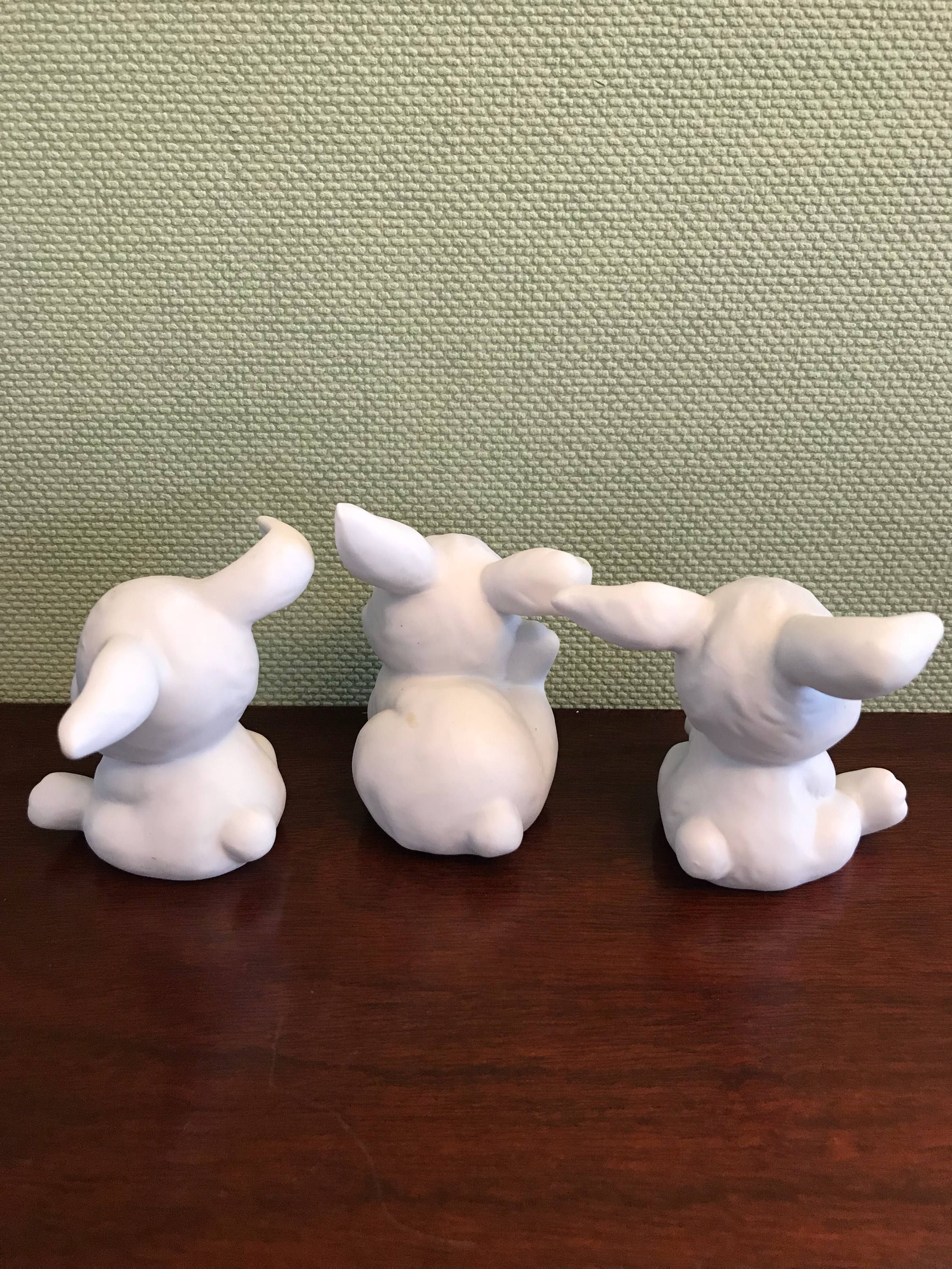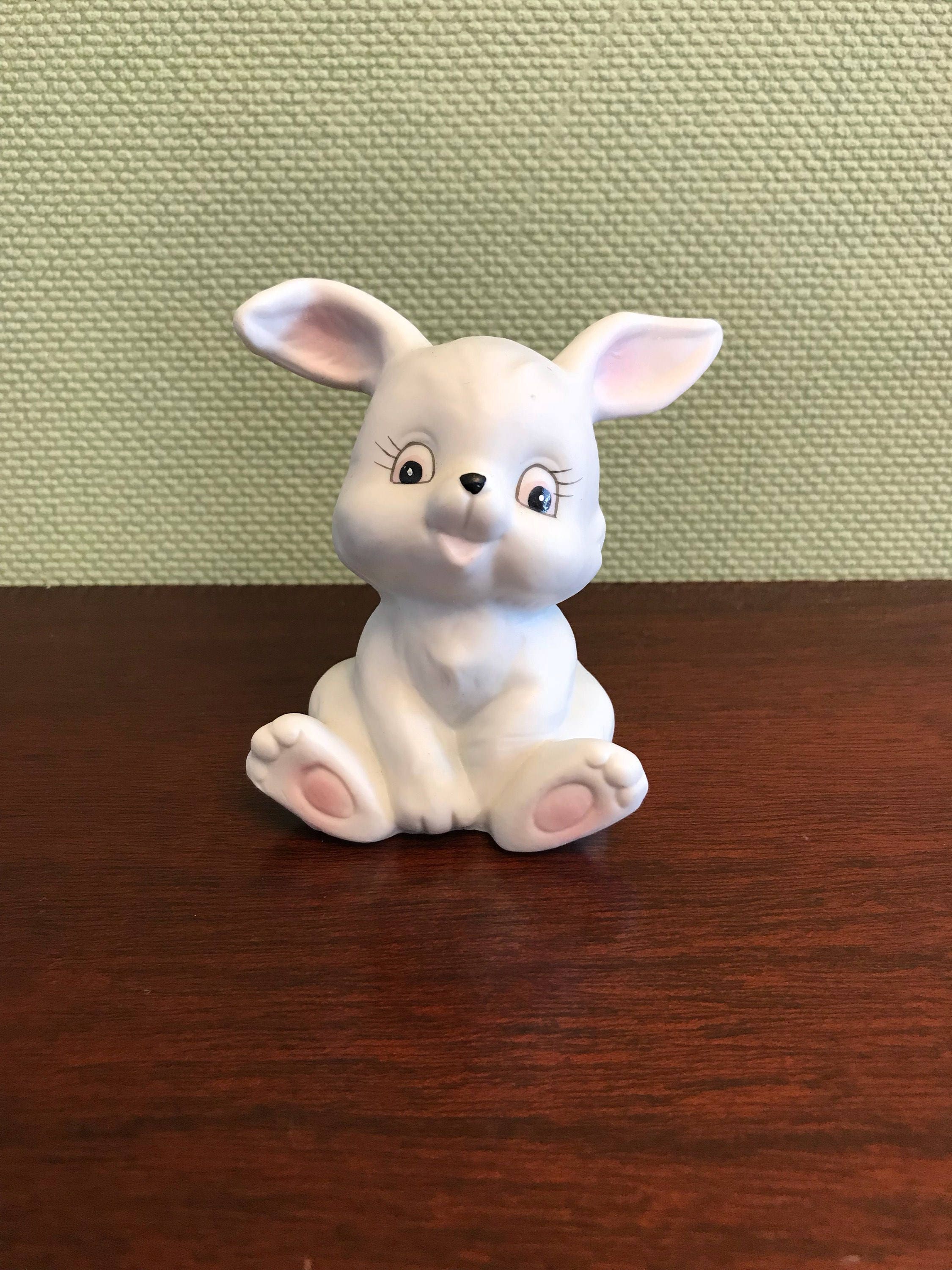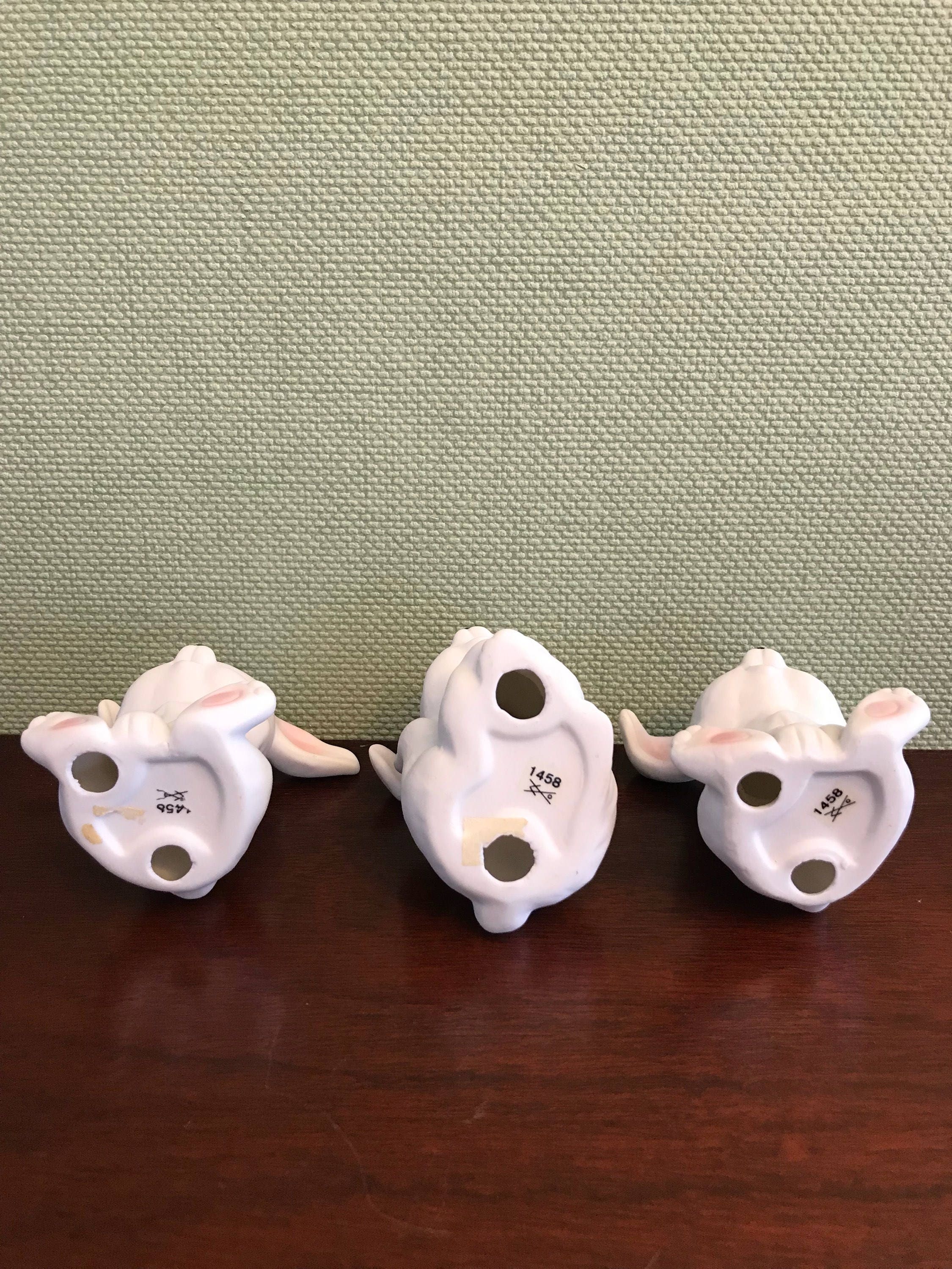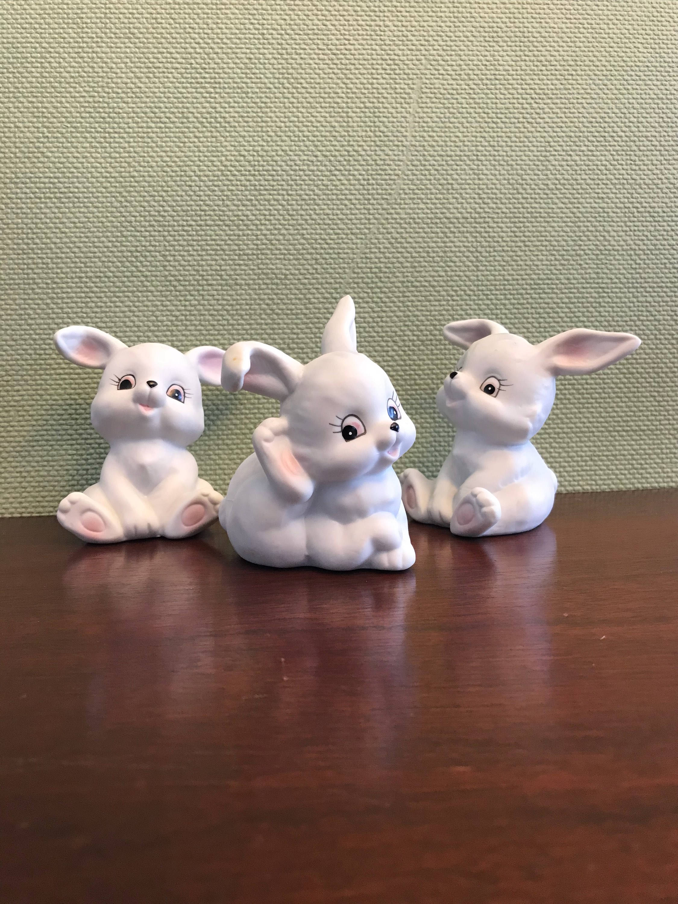 Vintage white porcelain Bunnies. This is a darling little set of bunnies. These bunnies are beautifully detailed and lightly colored. The bunnies are posing prettily, with adorable expressions on their little faces They would make a lovely gift or nursery display. The figurines measure just over 3.5" tall.