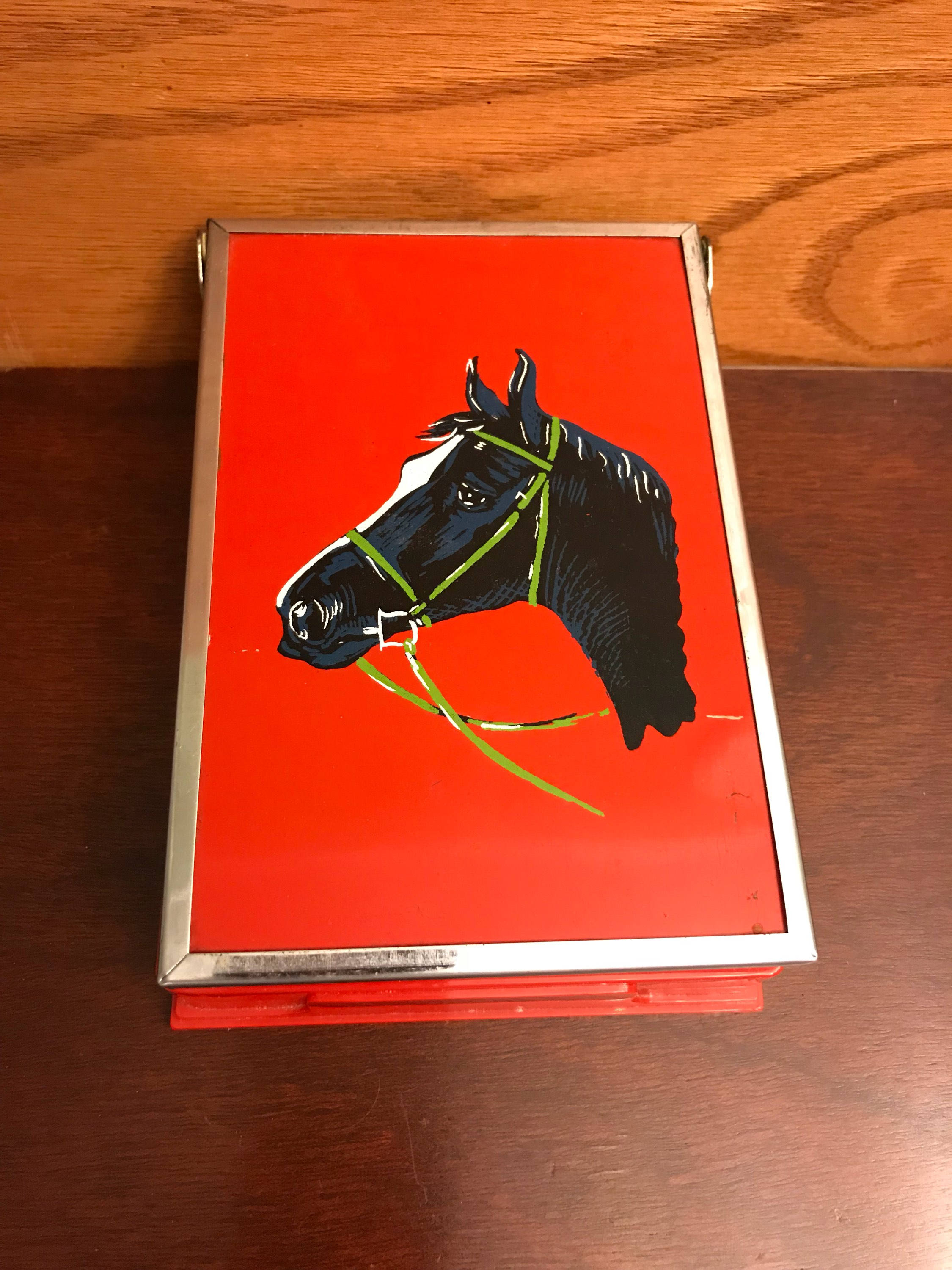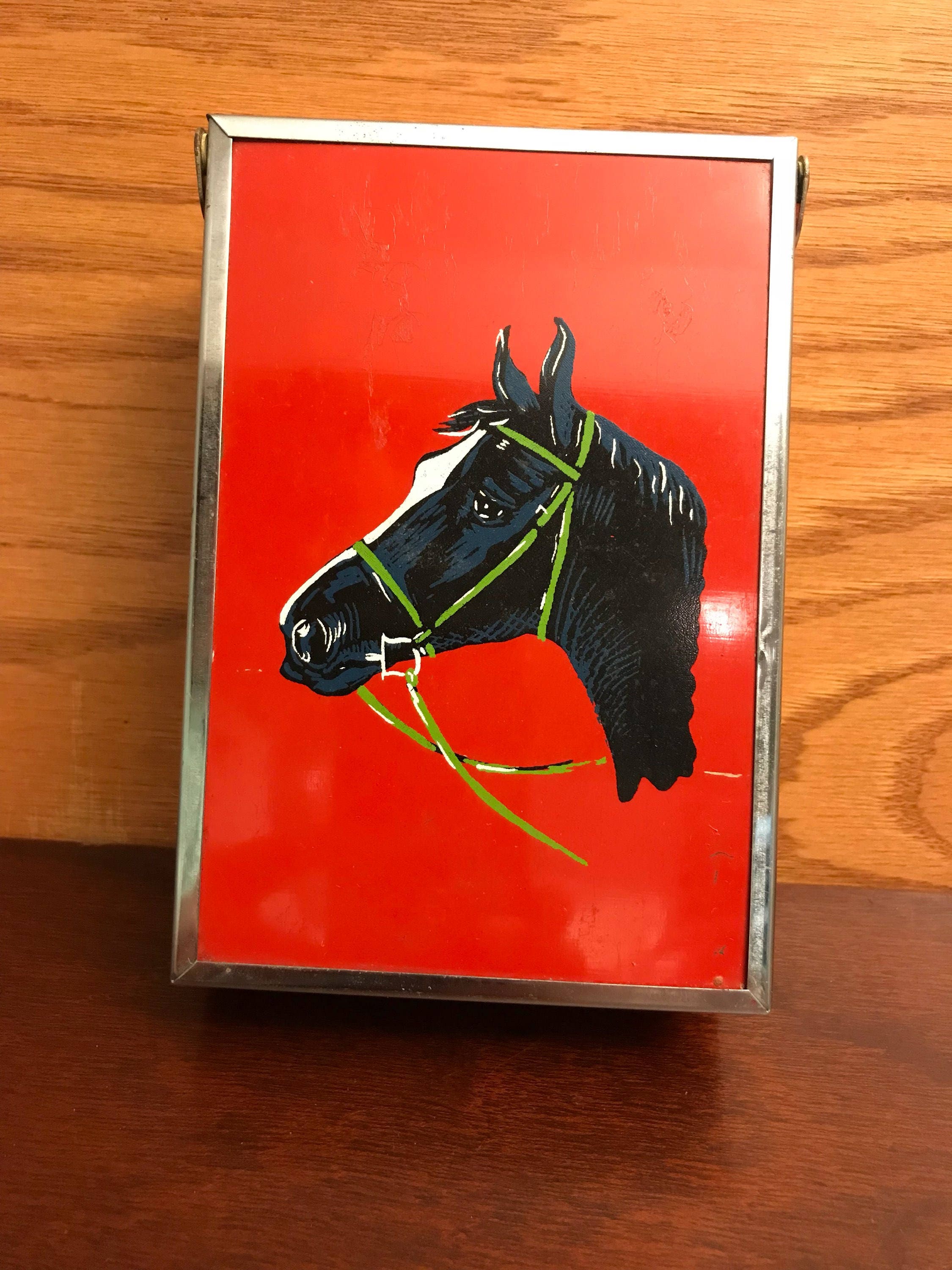 This is a wonderful 1950’s era collectible shaving kit with Black horse Head on the cover. This Gorgeous portable shaving kit opens to show mirror on the top half for use while shaving. The kit includes a real hair shaving brush and a removable plastic bowl.