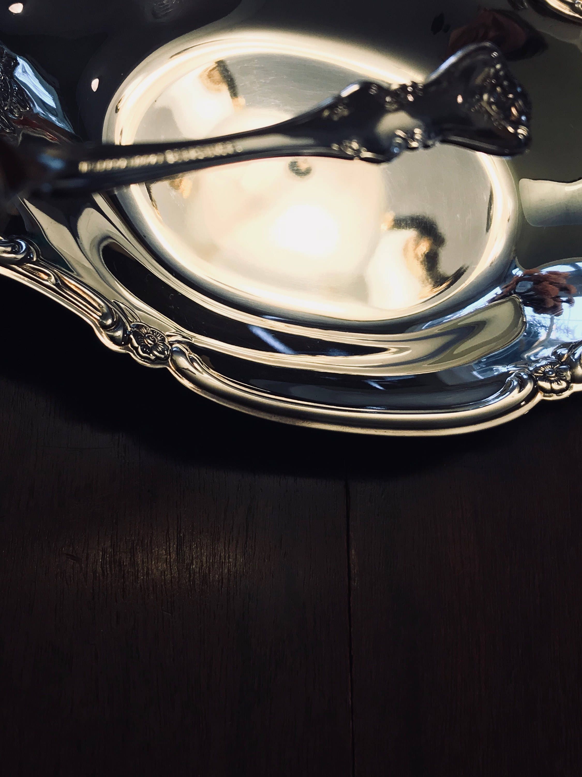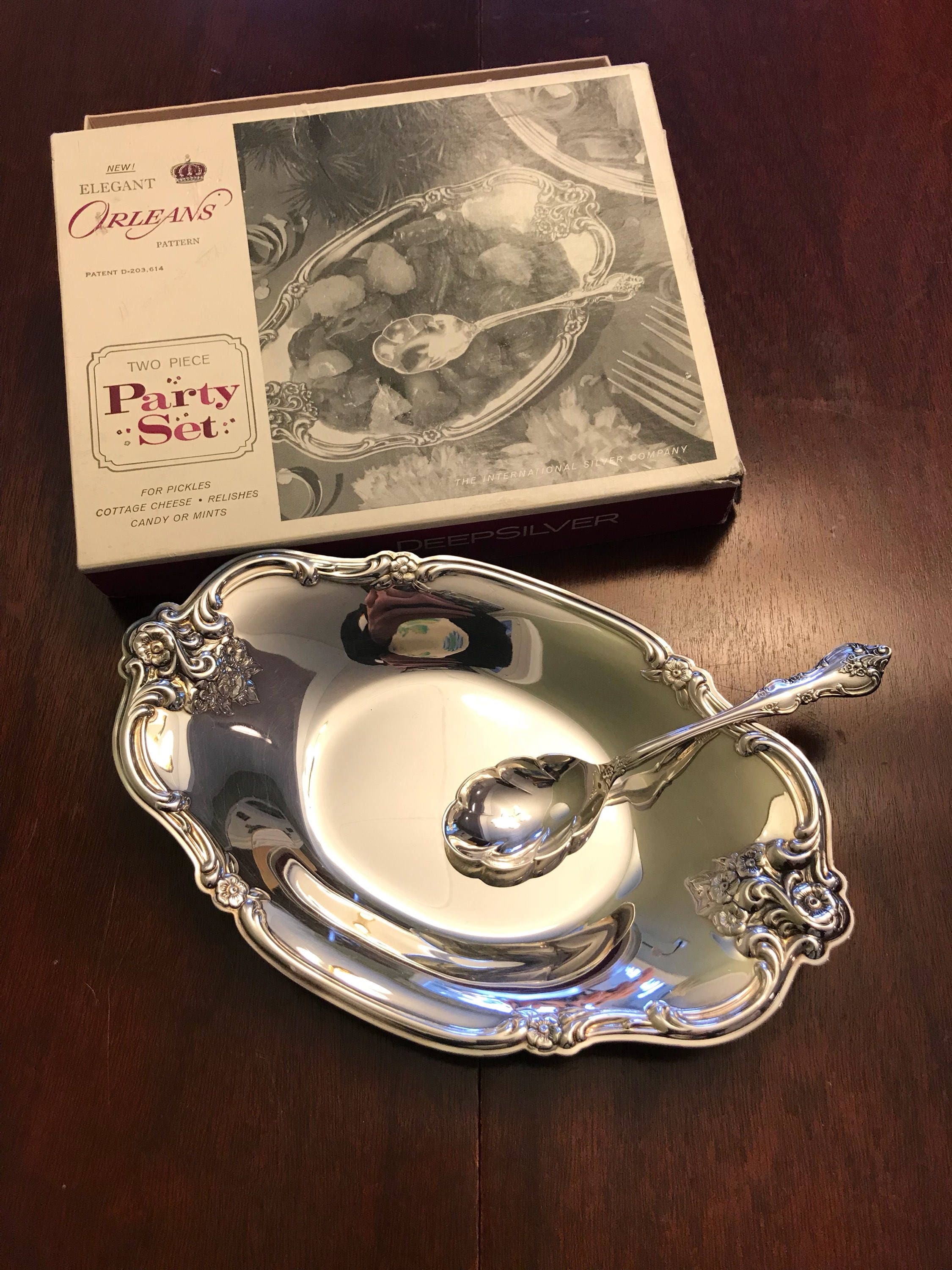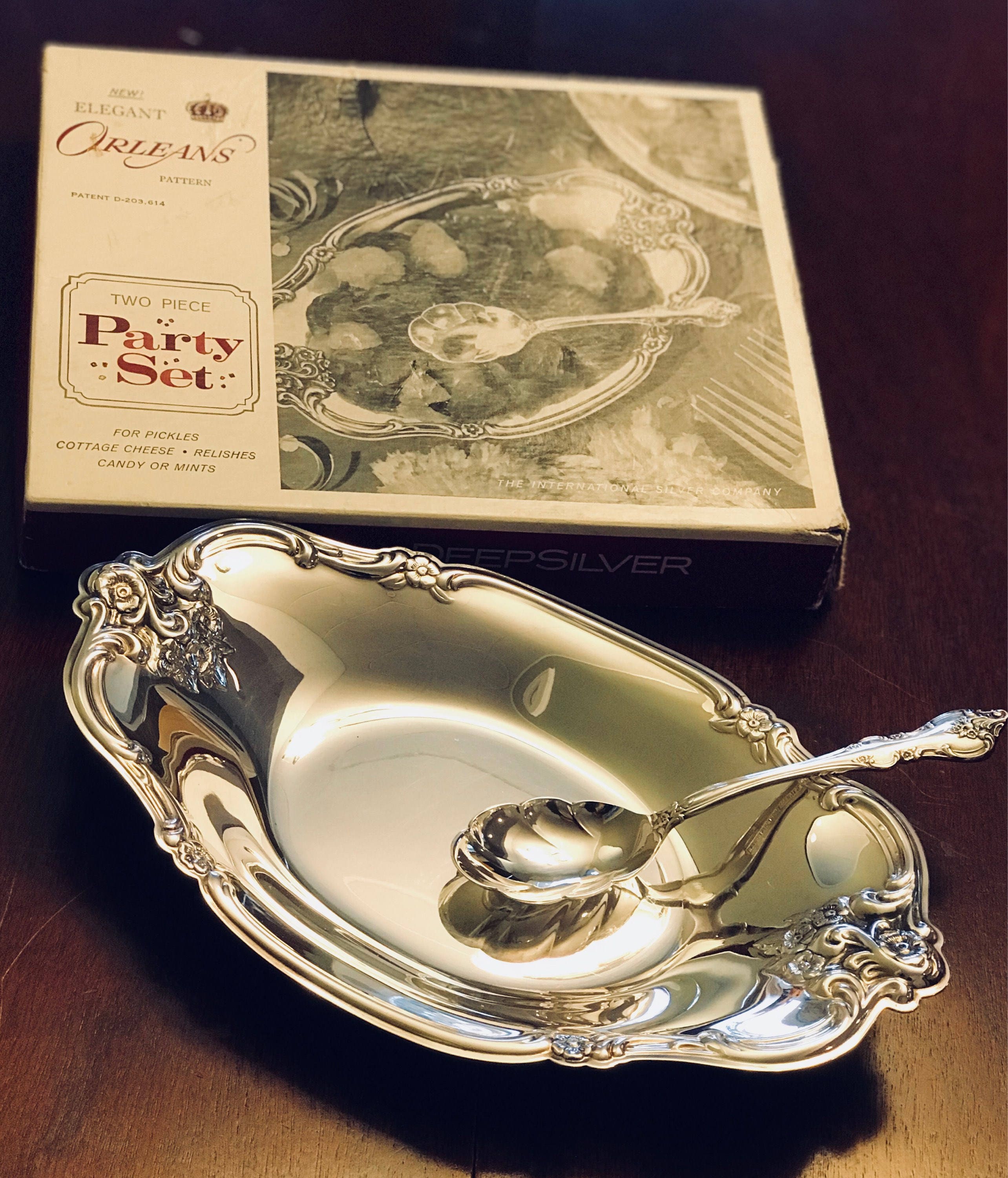 This is a lovely vintage silverplated Dish by International Silver Co. It is from their Elegant Orleans collection which is a grouping of silver plated Hollowware and Silverware. The lovely Bowl is in an Oval shape with Scrolls and Flowers on the top edge. It also has a matching shell sugar silver spoon. This elegant little Dish is perfect for candy, mints, nuts or even relishes. This pretty bowl would look beautiful in almost any room in your house. It is new in its original box and would make a lovely wedding or anniversary gift. This bowl is Silver-plated and inlaid with pure silver.