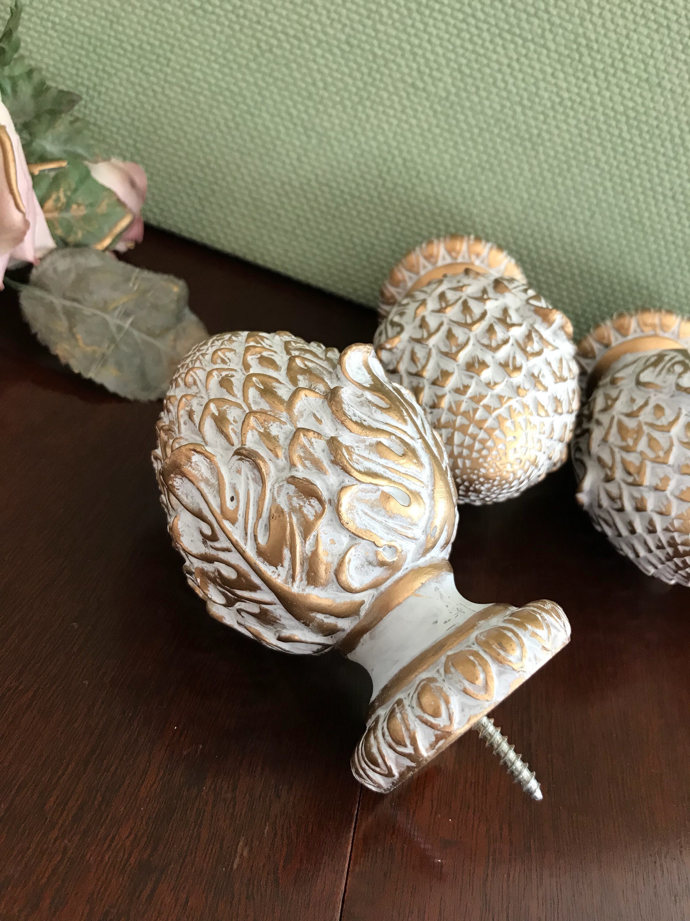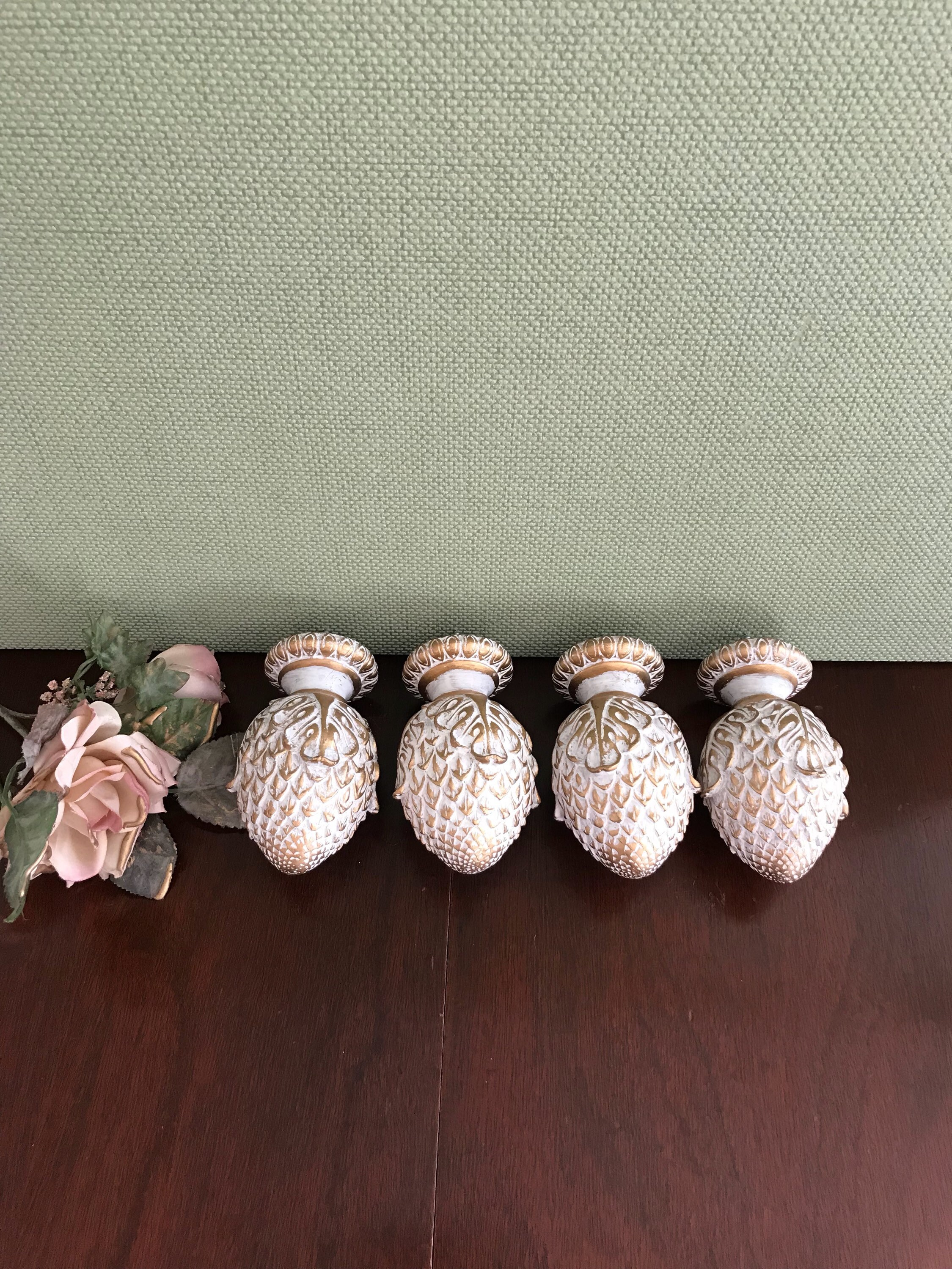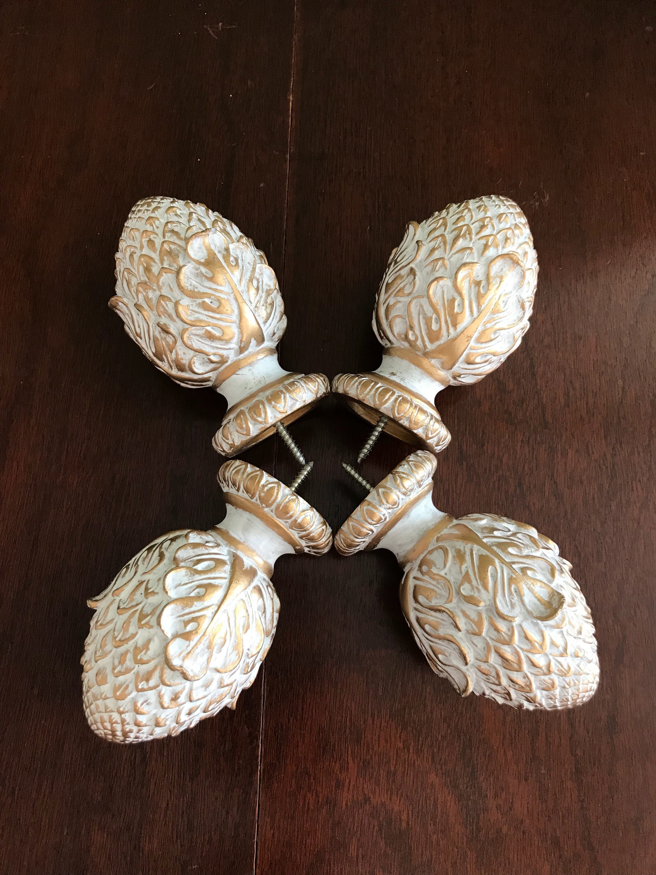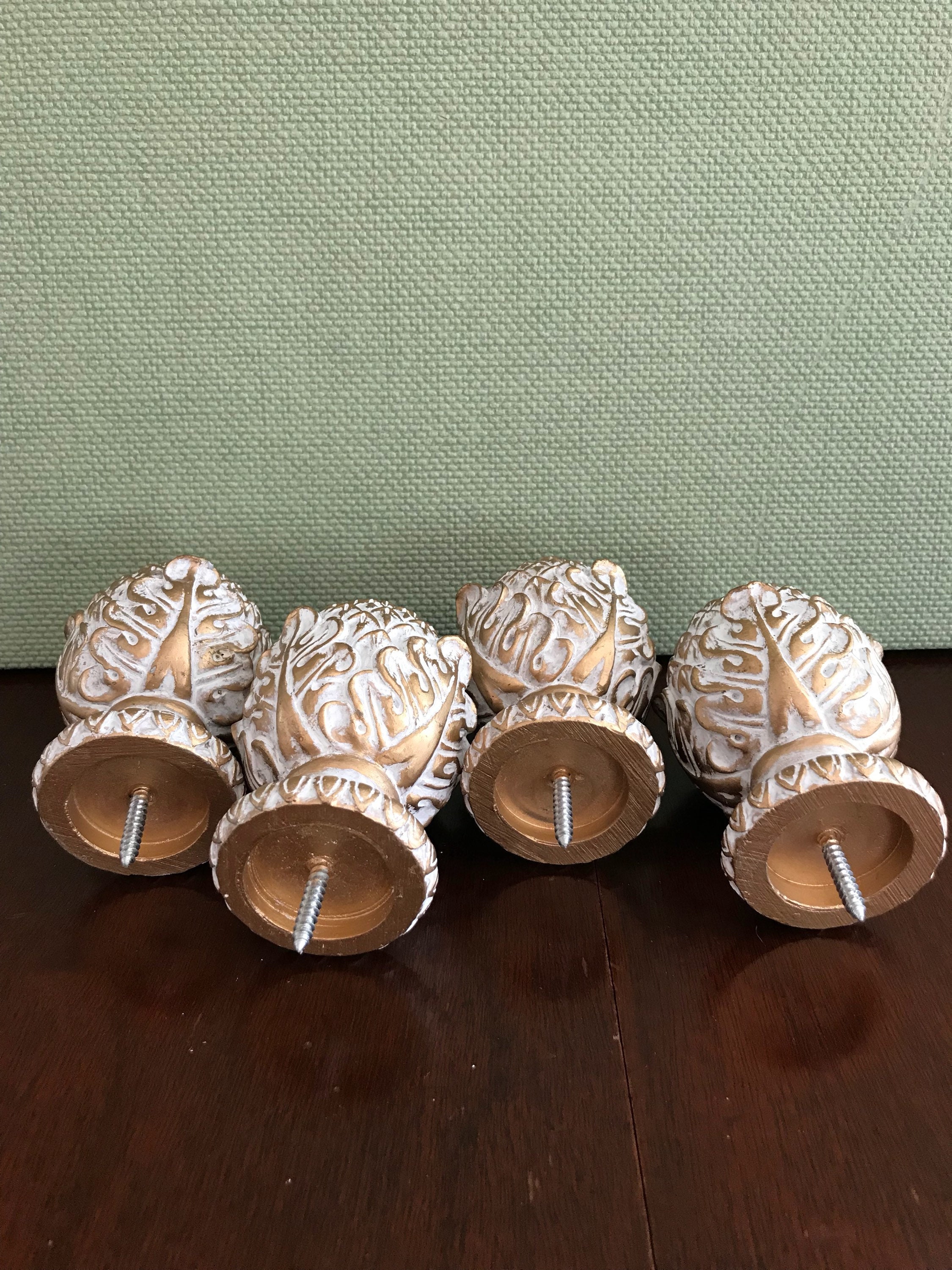 This is a lovely set of 4 artichoke shaped project finials, or end caps. These beautiful finials are made of a resin type product and are finished in an antique gold with a white wash. Each finial has a screw imbedded, and would look gorgeous on the end of a drapery rod, capping furniture posts, or in the making of a unique set of bookends. These are the perfect project finials. They are heavy and well-made. Each finial measures approximately 4 1/2 inches high. The bottom diameter is 2 inches with an inset of 1 1/2 inches. The screws are set at 1 inch centers.