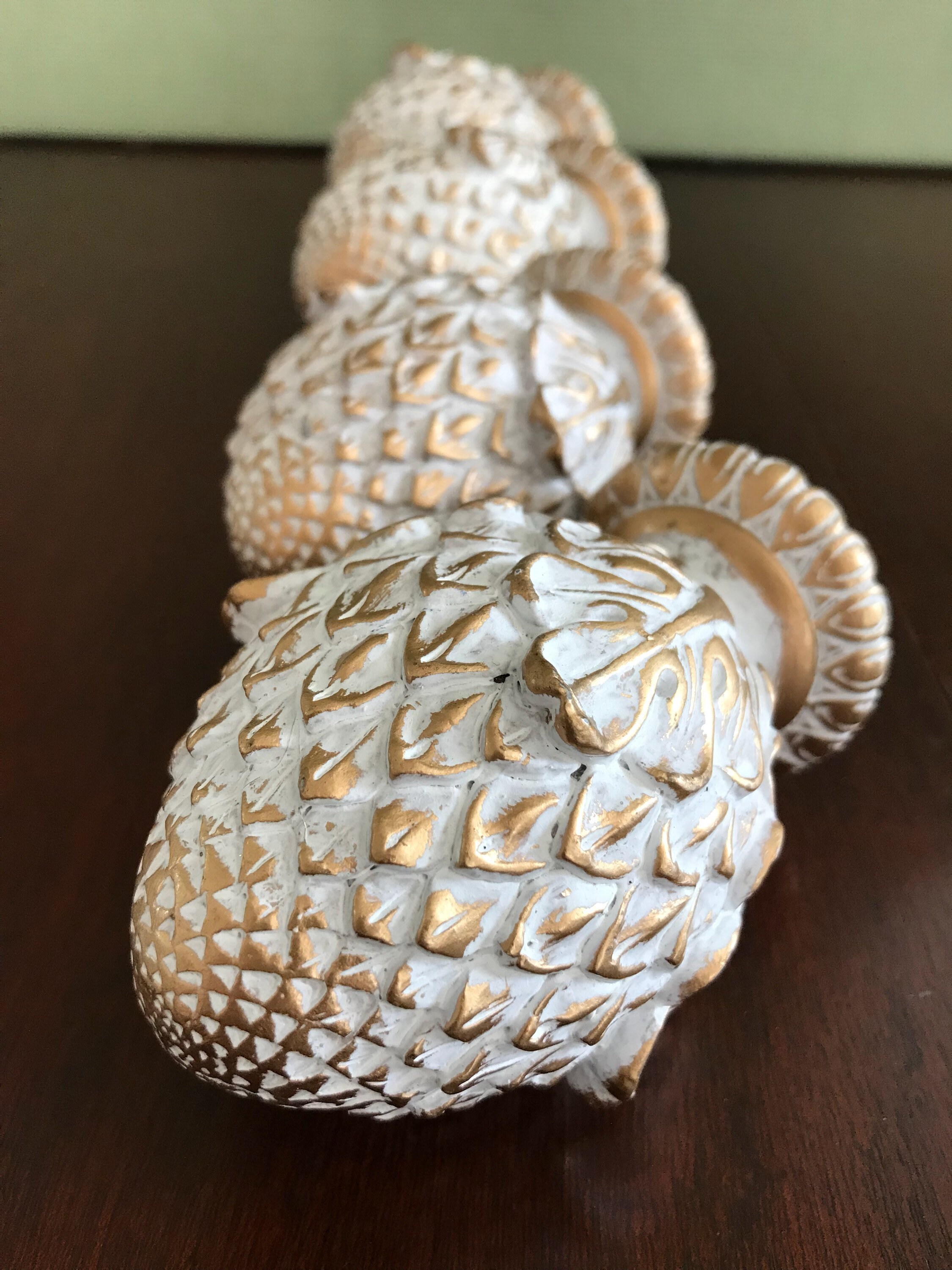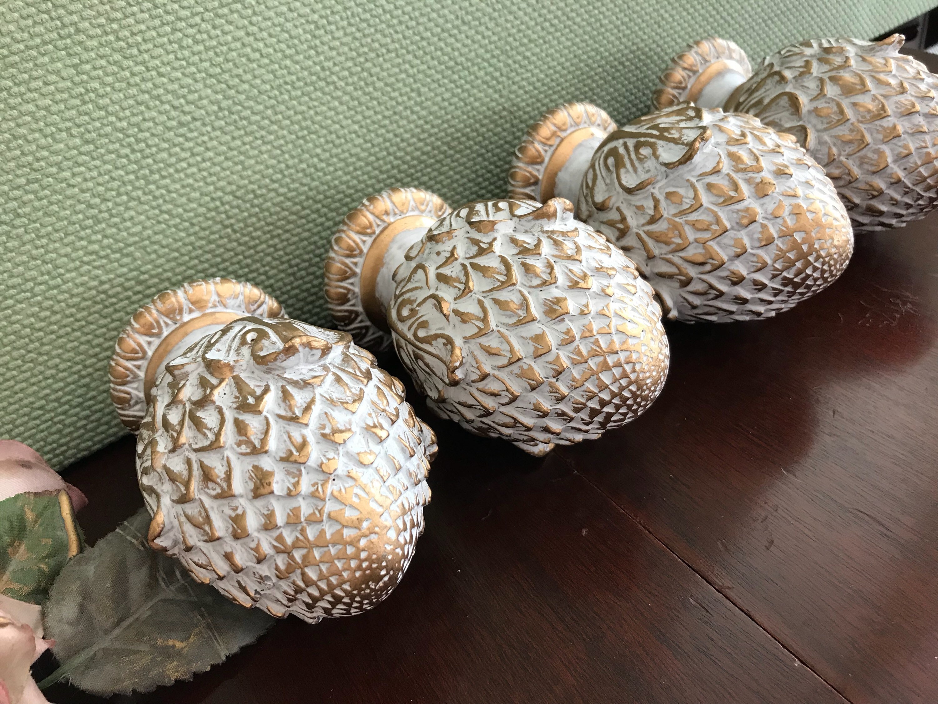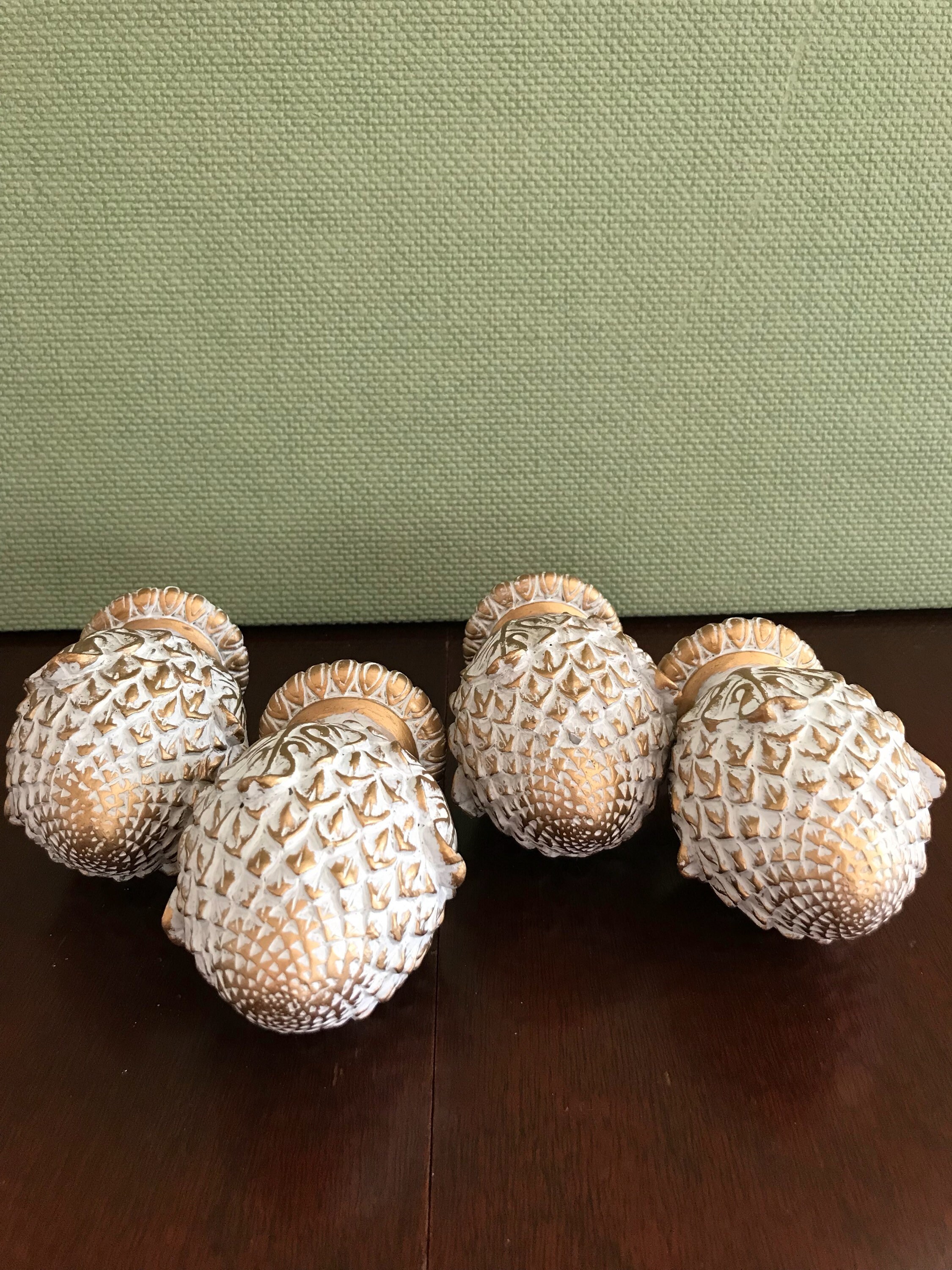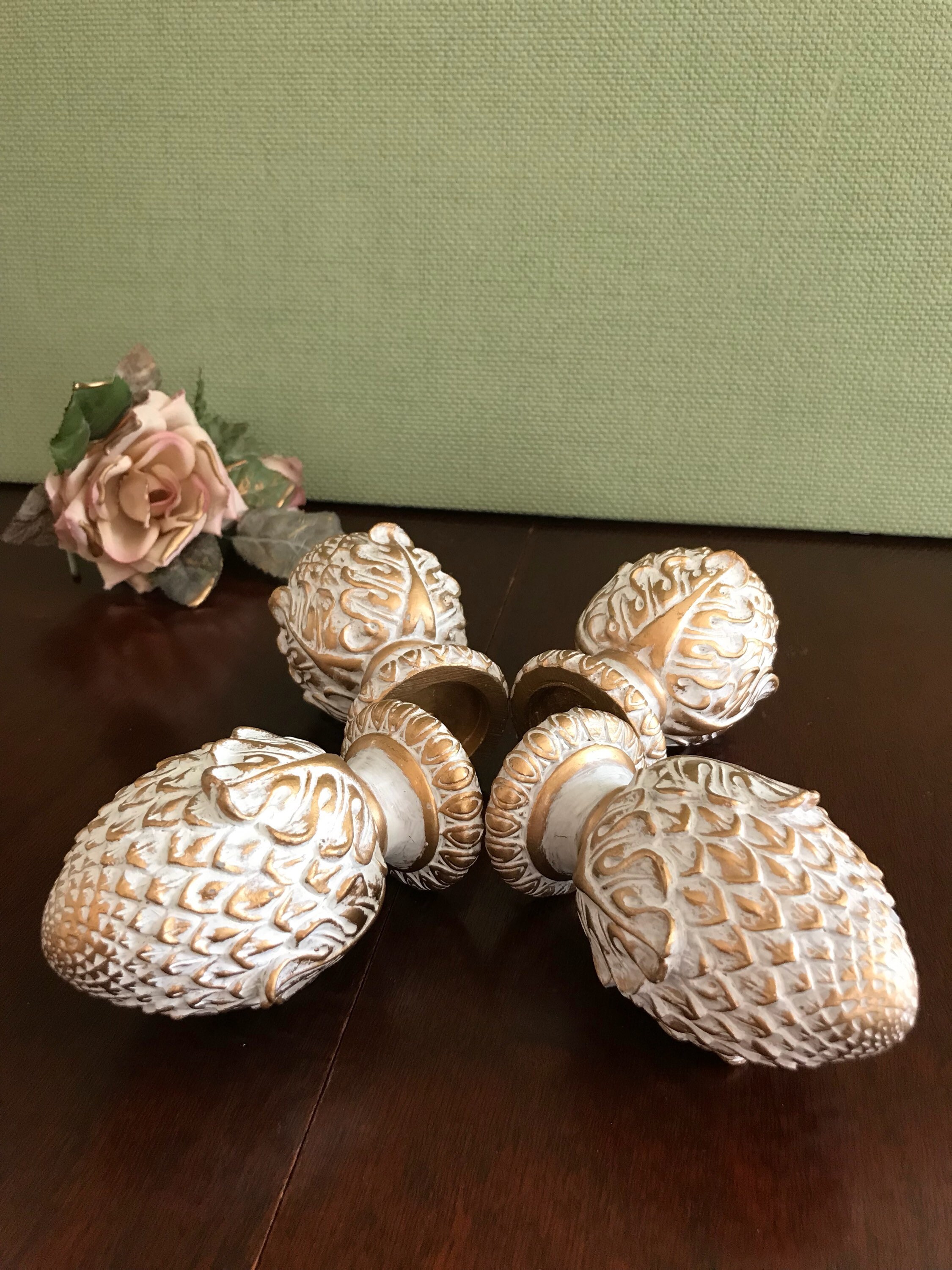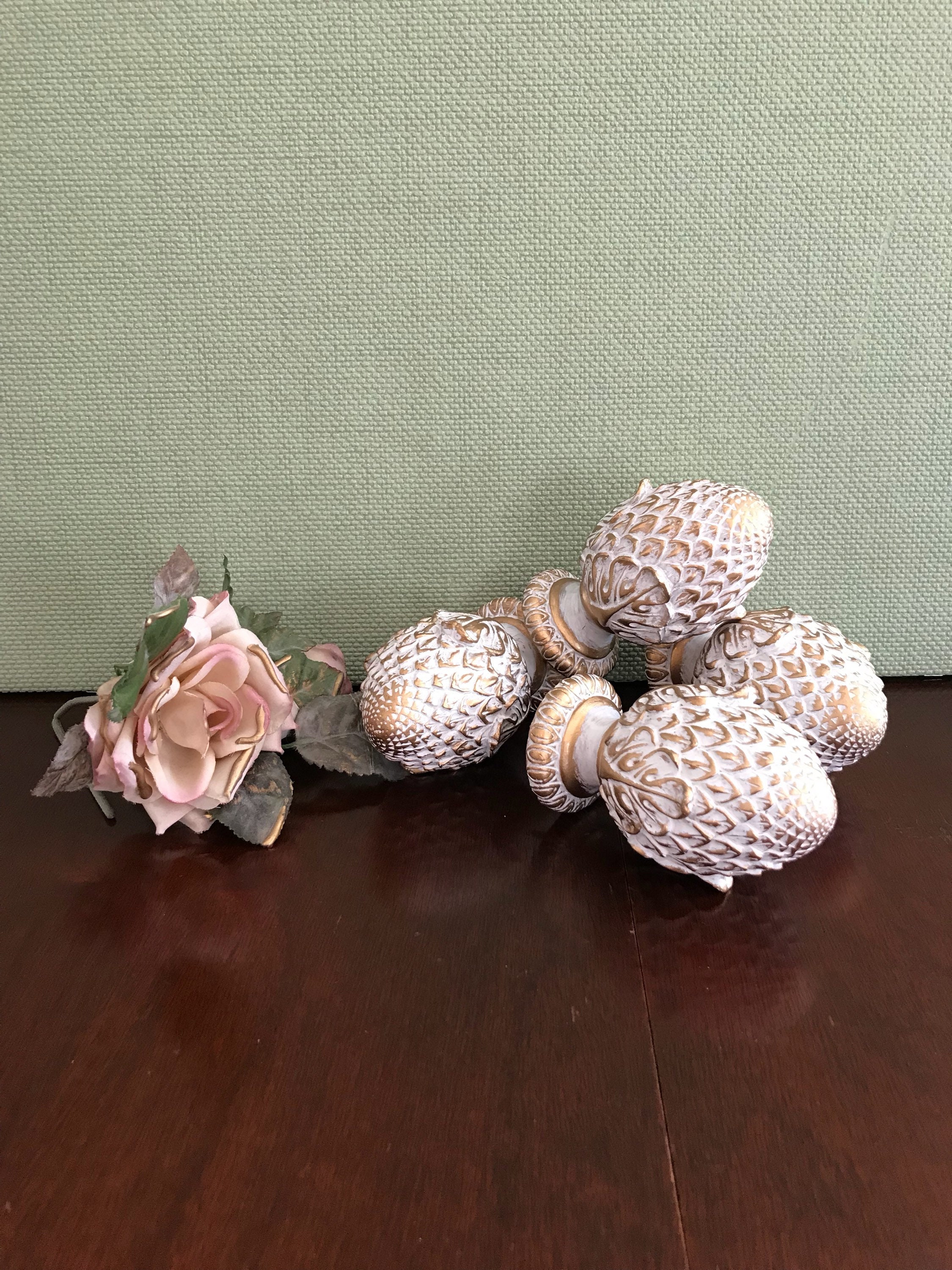This is a lovely set of 4 artichoke shaped project finials, or end caps. These beautiful finials are made of a resin type product and are finished in an antique gold with a white wash. Each finial has a screw imbedded, and would look gorgeous on the end of a drapery rod, capping furniture posts, or in the making of a unique set of bookends. These are the perfect project finials. They are heavy and well-made. Each finial measures approximately 4 1/2 inches high. The bottom diameter is 2 inches with an inset of 1 1/2 inches. The screws are set at 1 inch centers.