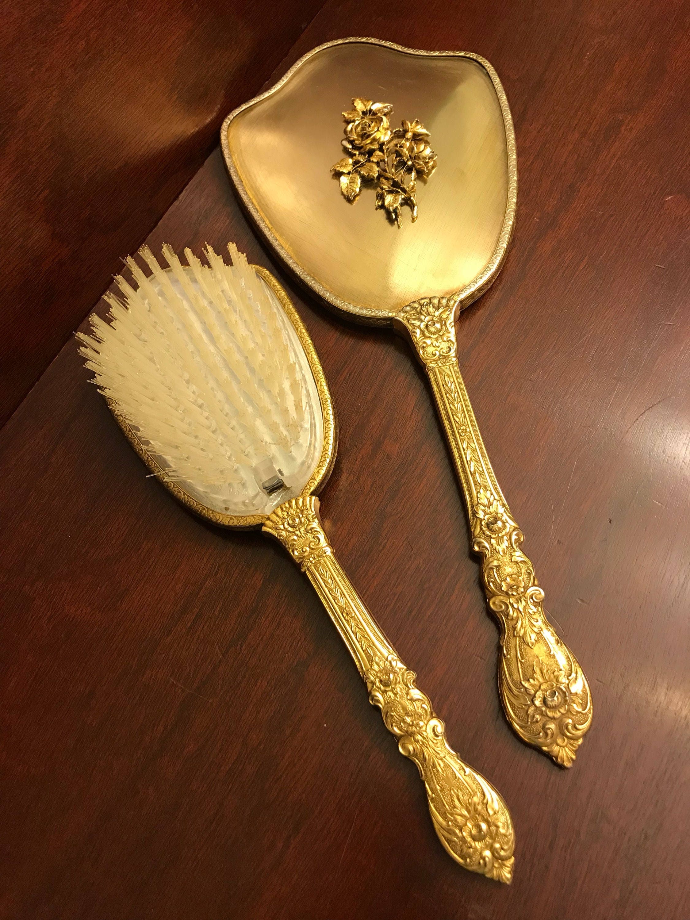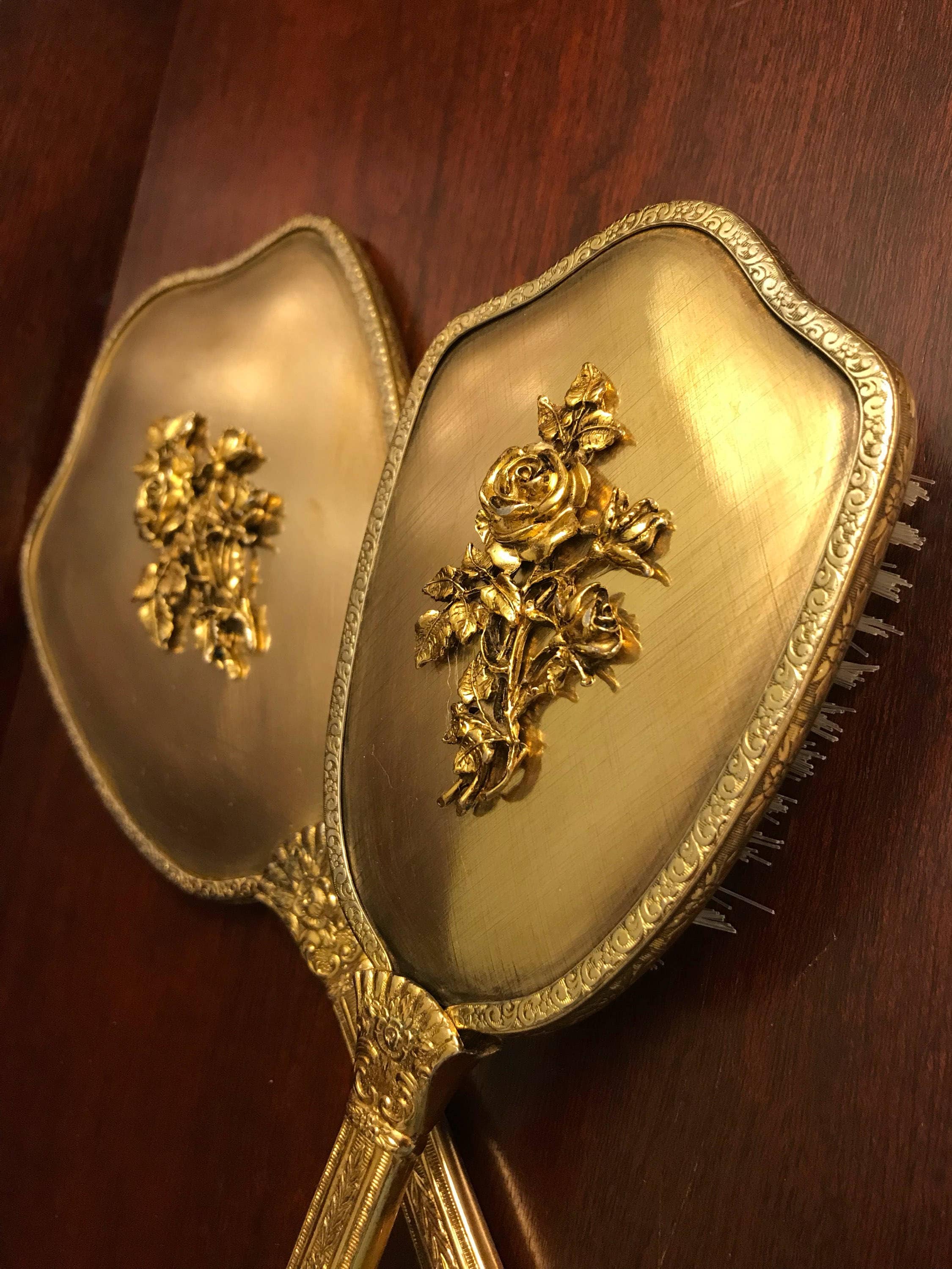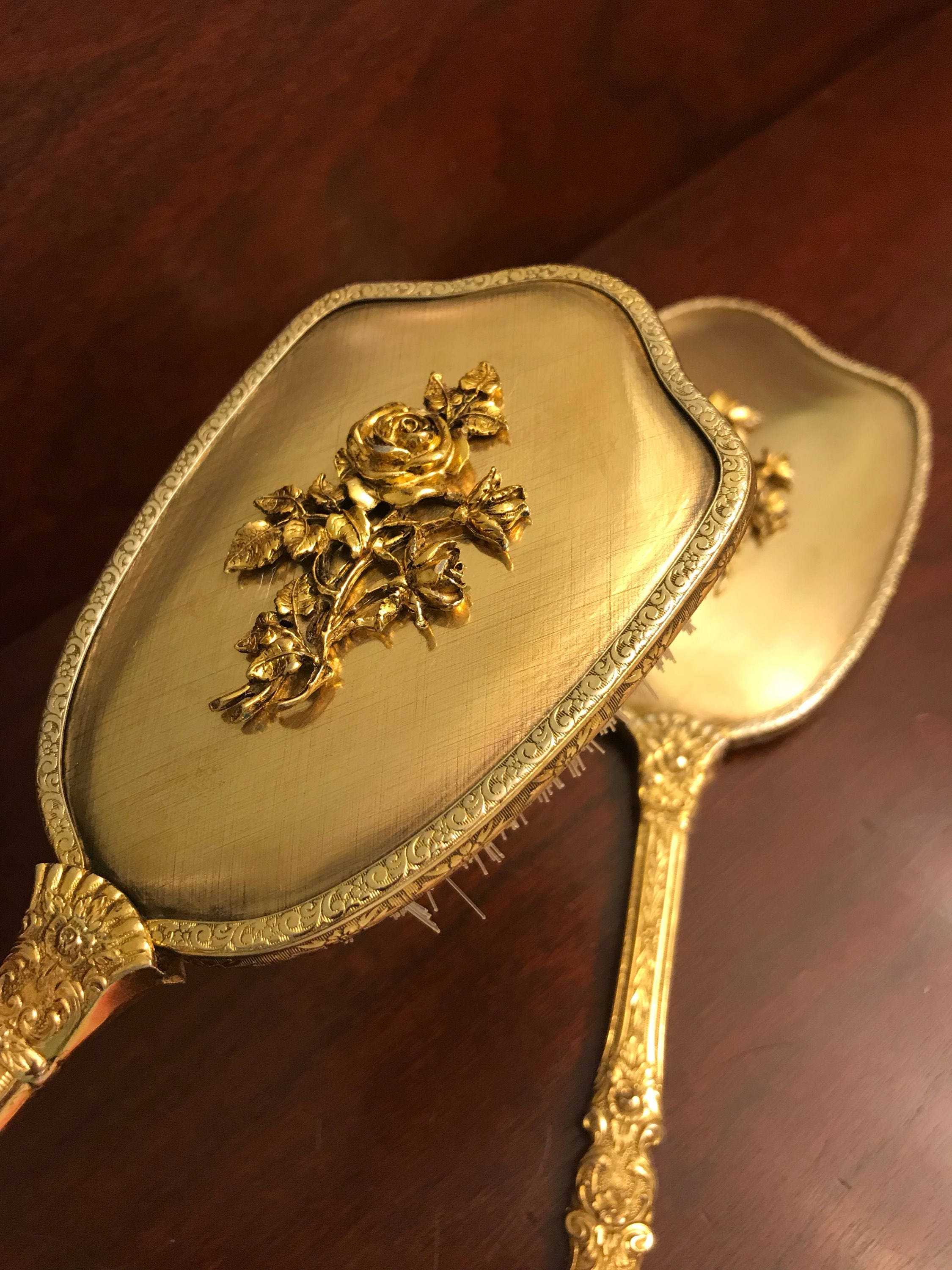 The brush and the mirror have a gold filigree raised ornament of Roses in the center. The edges of the brush and mirror are decorated with etched scrolls and Flowers. The lovely gold decorative piece is on a brushed metal design.