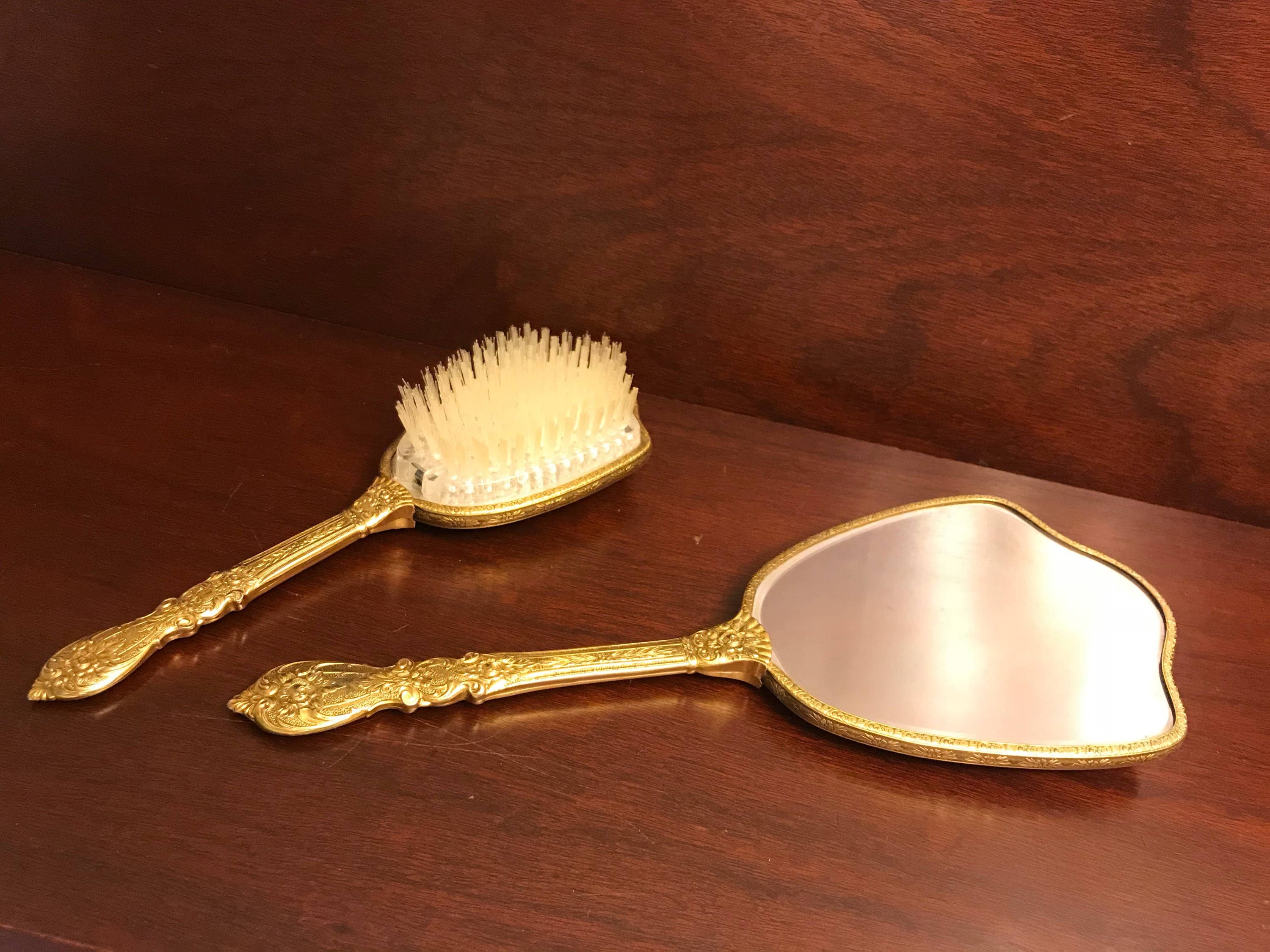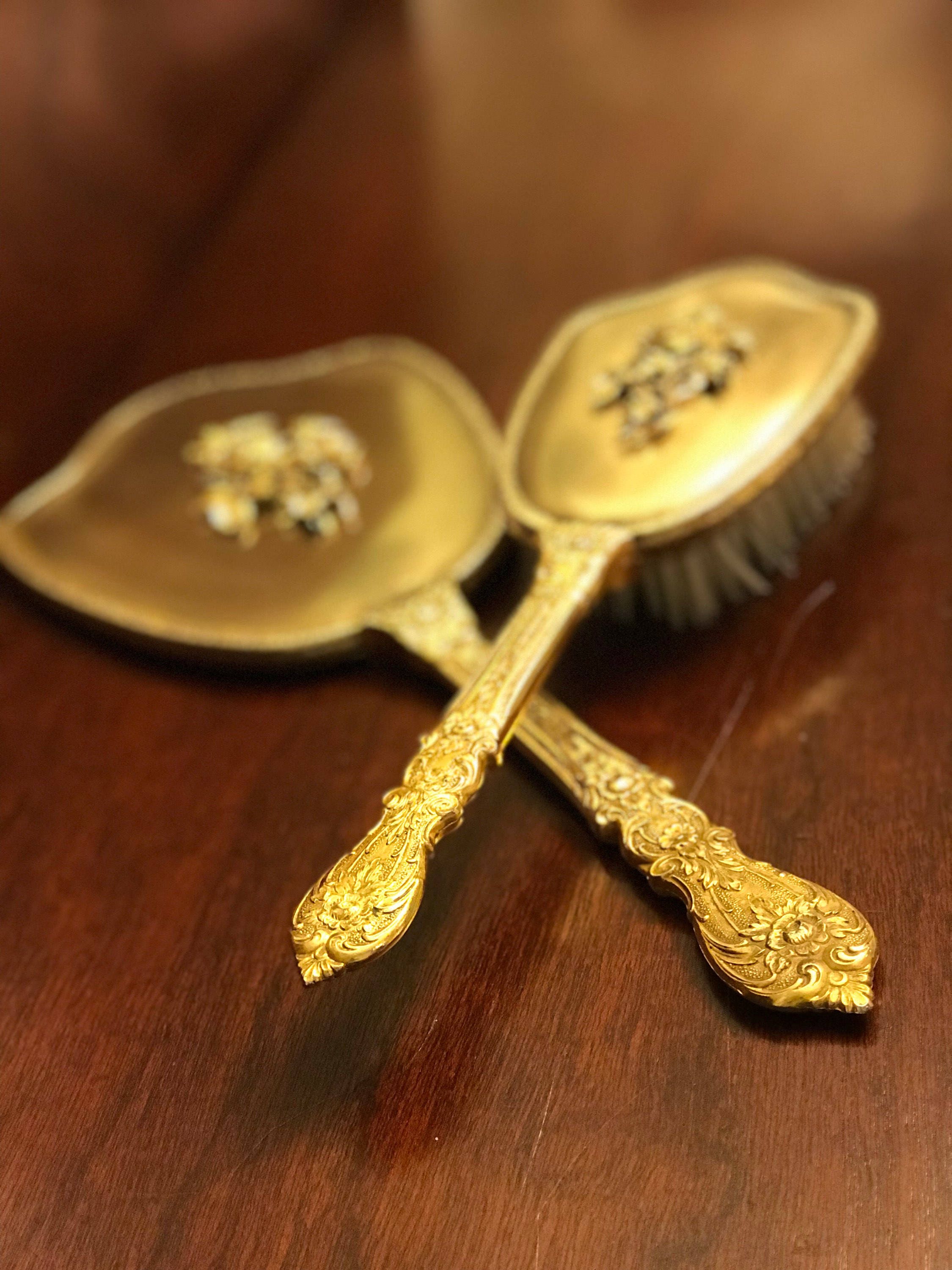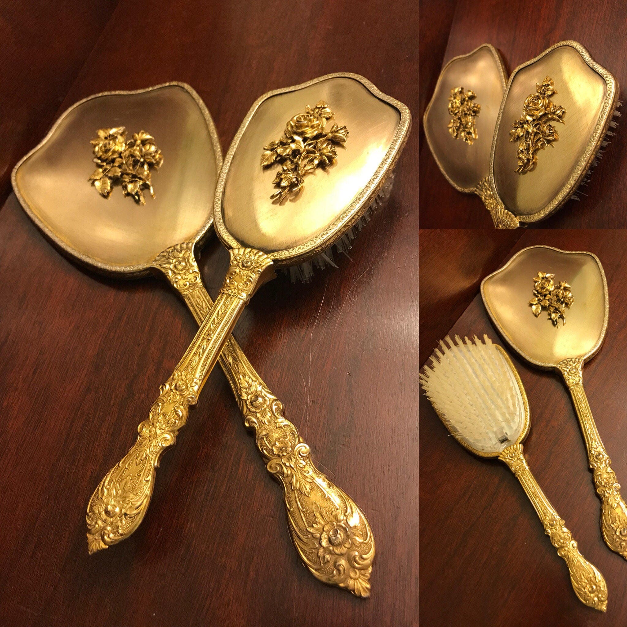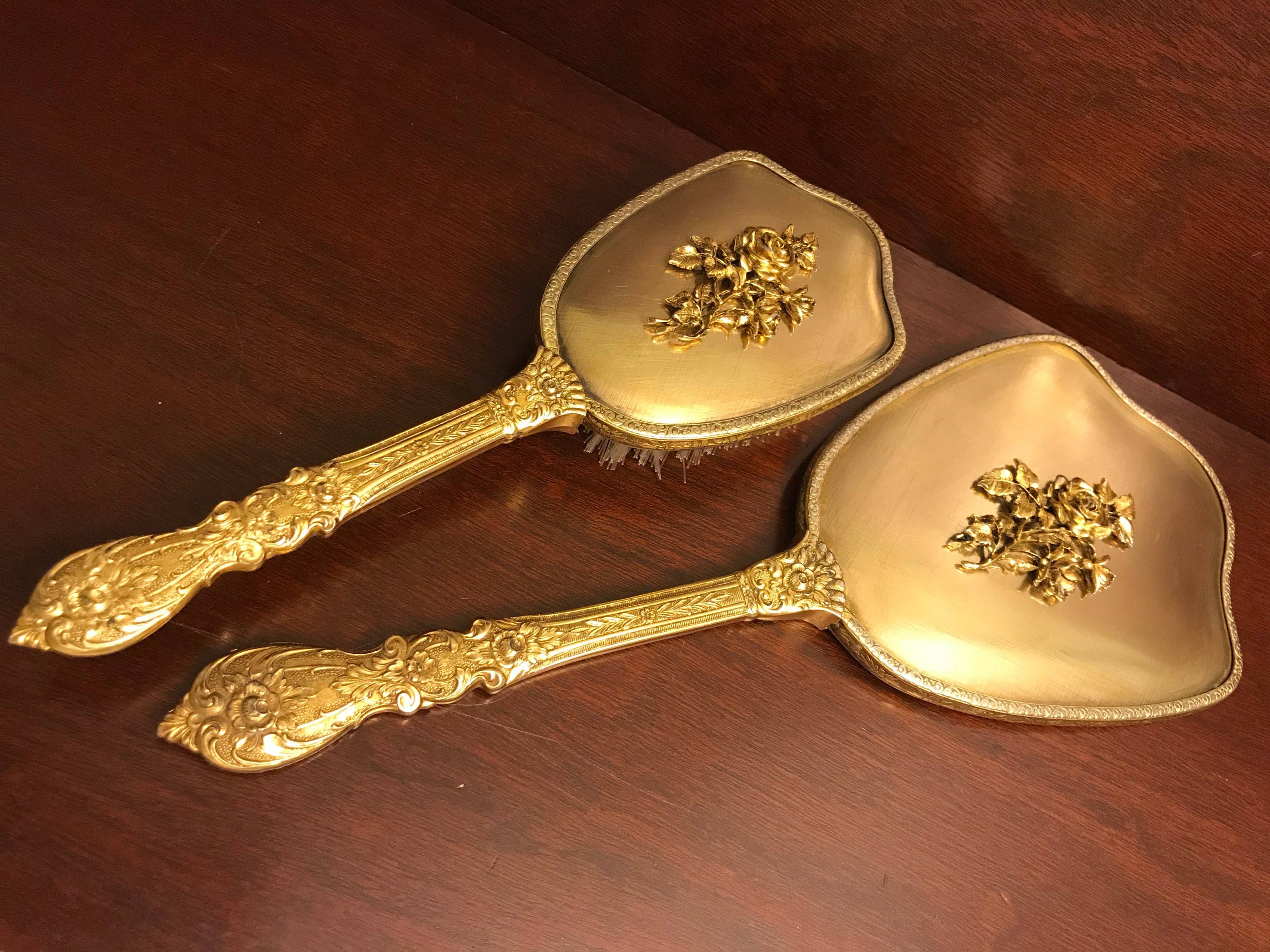 The brush and the mirror have a gold filigree raised ornament of Roses in the center. The edges of the brush and mirror are decorated with etched scrolls and Flowers. The lovely gold decorative piece is on a brushed metal design.