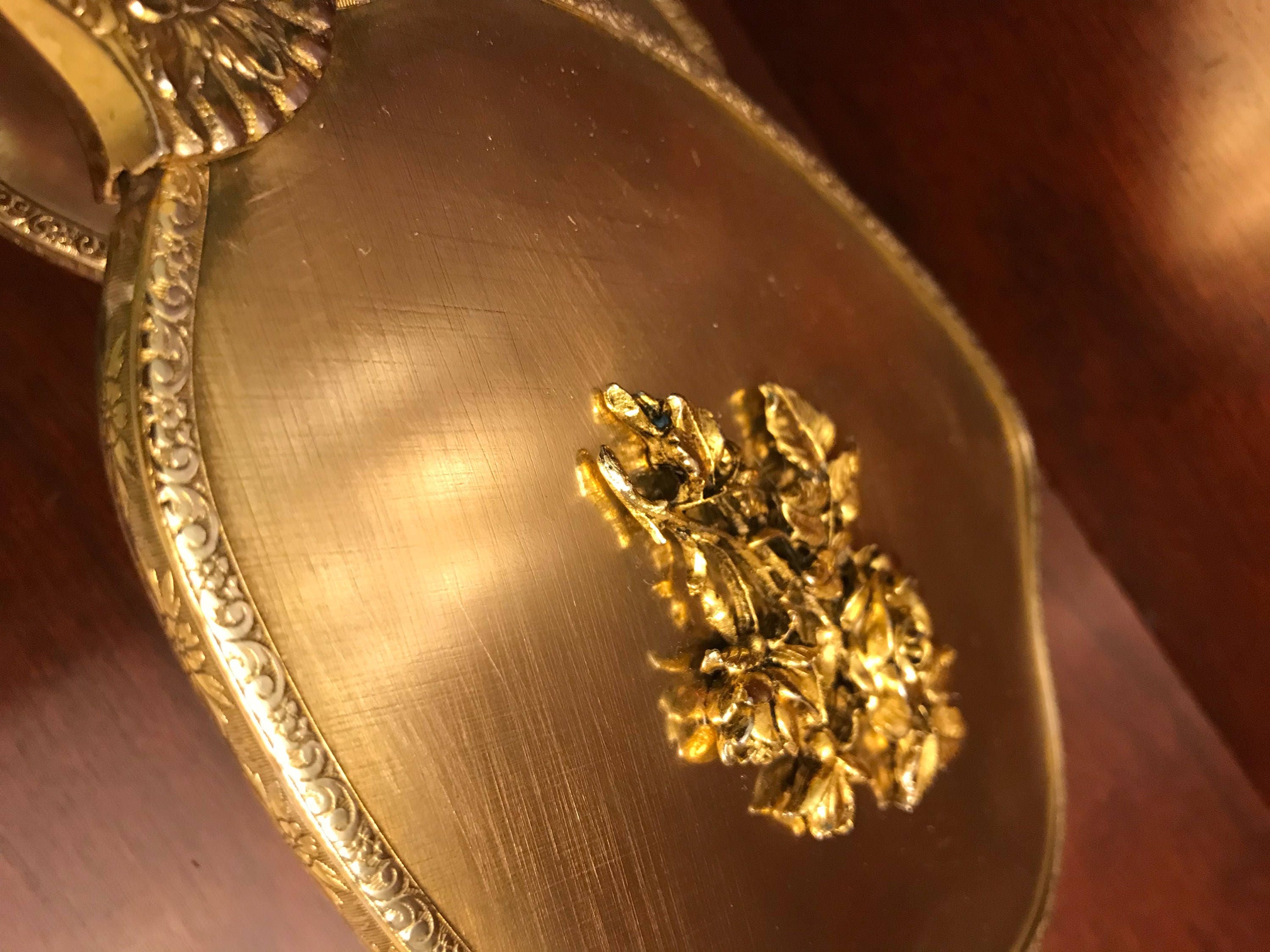 The beveled hand mirror, and brush frame and handles are in excellent condition with only little age related patina to the ormolu. The mirror is clear. The bristles are all intact in the brush. The pieces are substantial in weight, and very lovely.