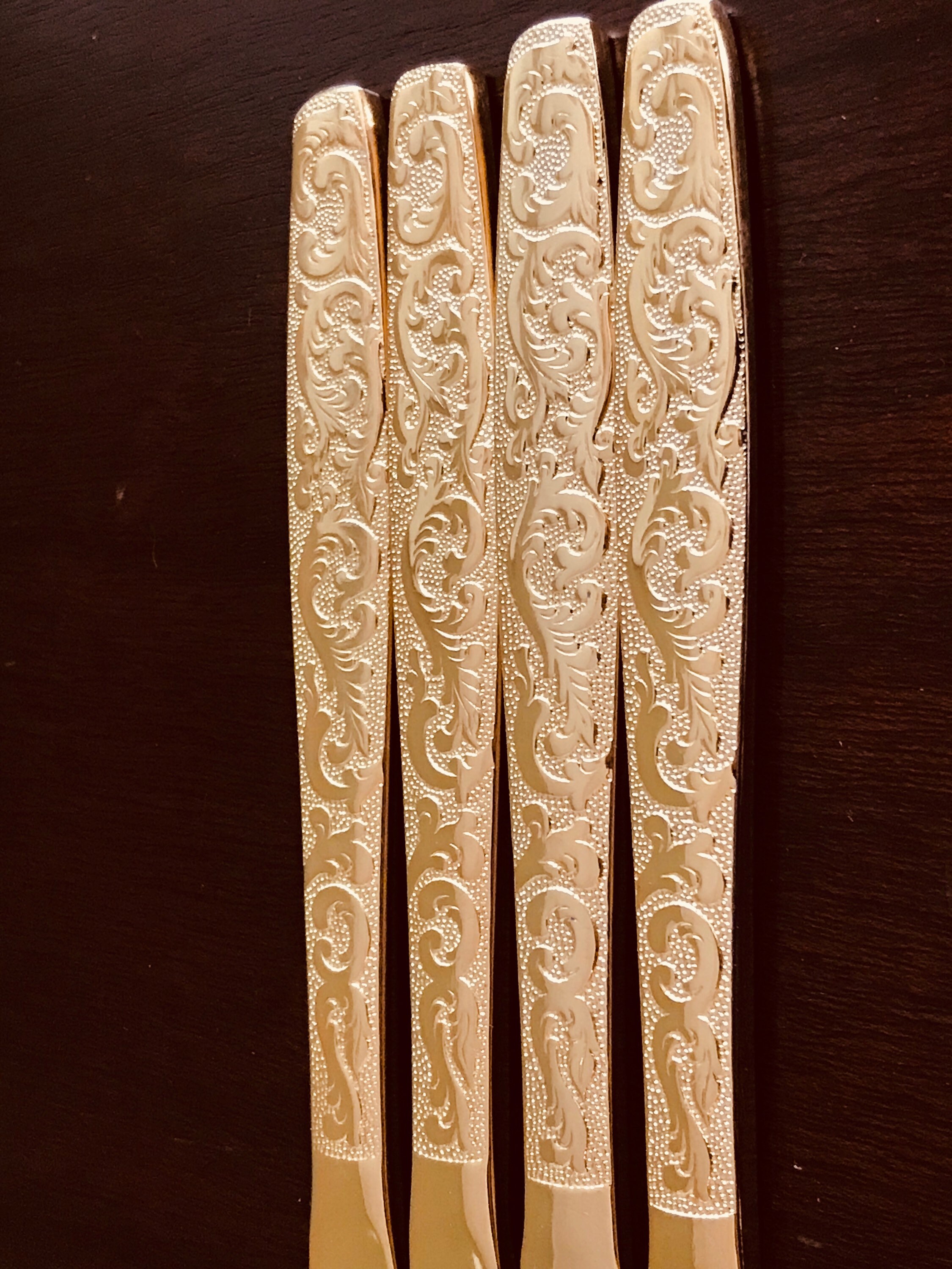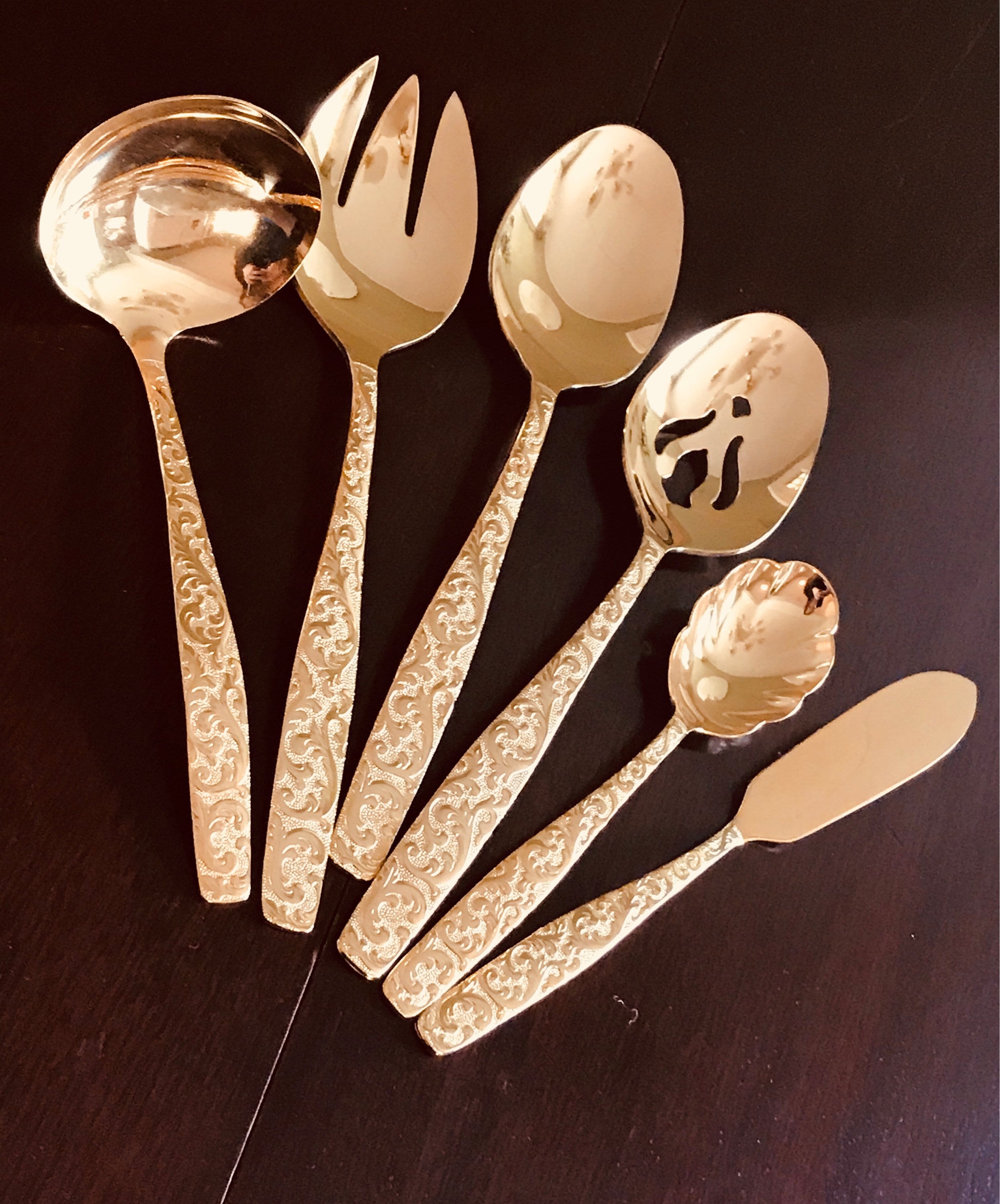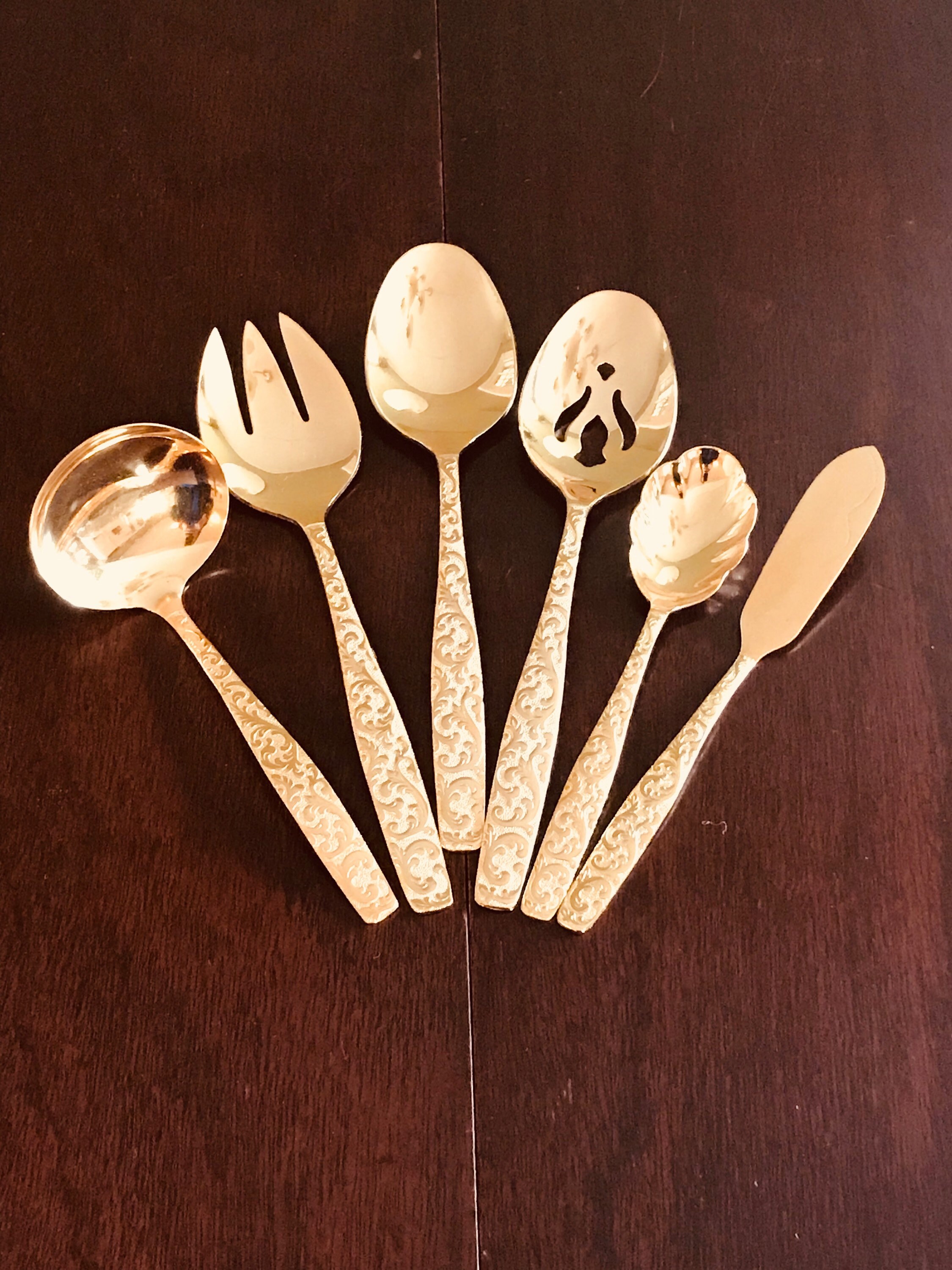 Gold Electroplate Flatware. This Gorgeous flatware is electroplated with Gold on Stainless in an elegant all over scroll pattern on the handle. Made by International Silver.