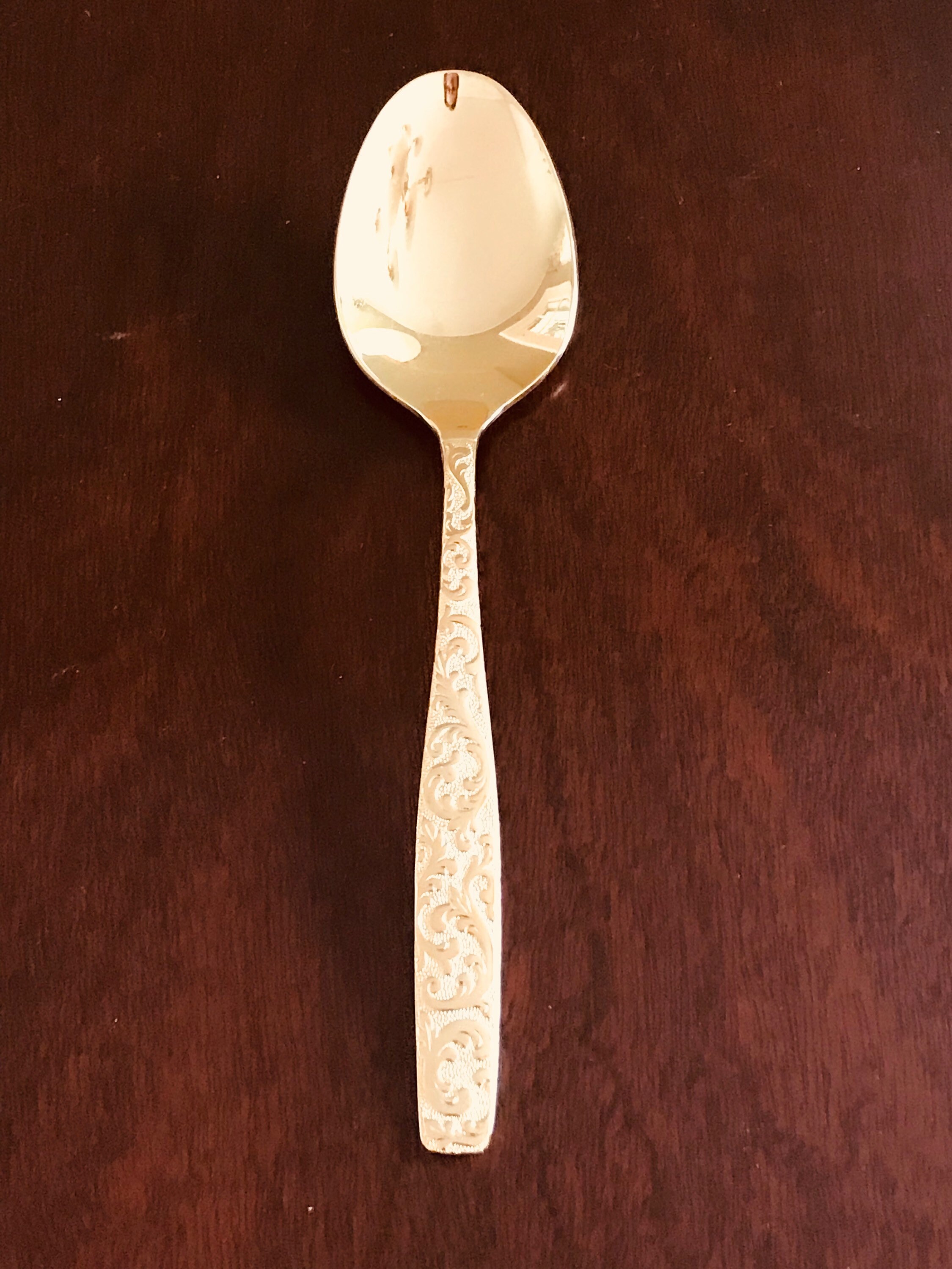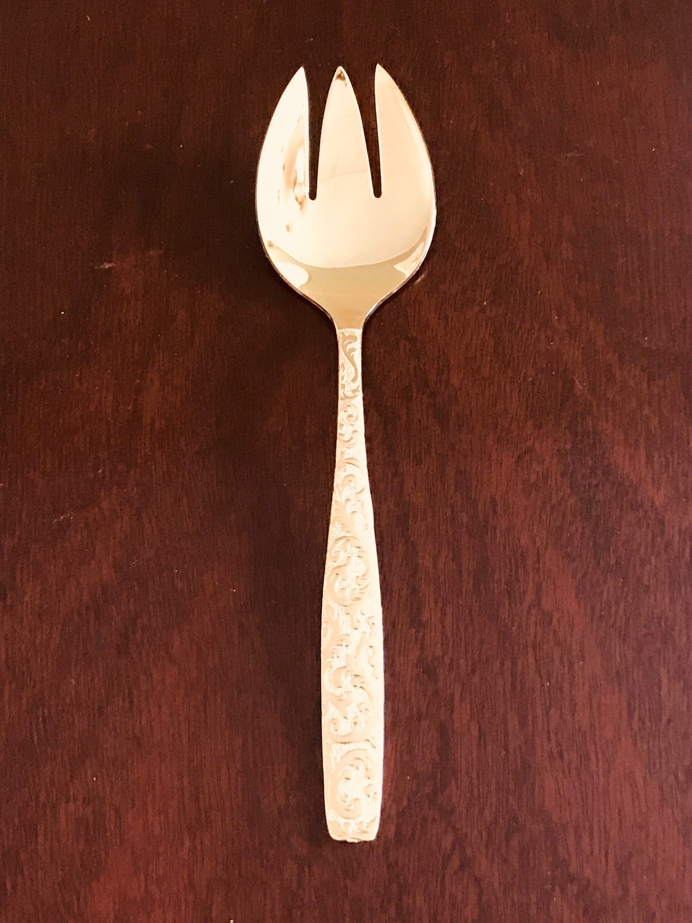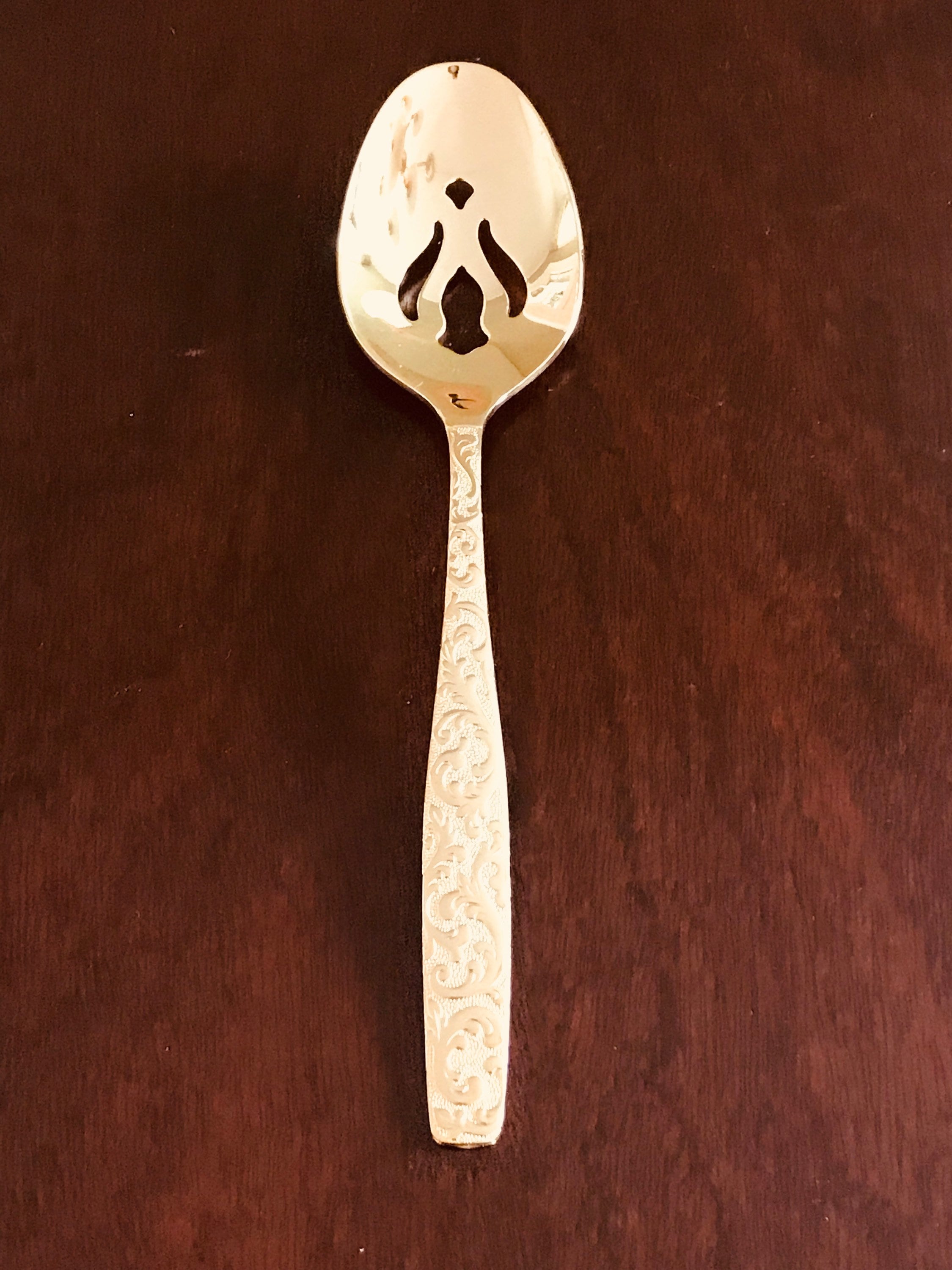 Gold Electroplate Flatware. This Gorgeous flatware is electroplated with Gold on Stainless in an elegant all over scroll pattern on the handle. Made by International Silver.