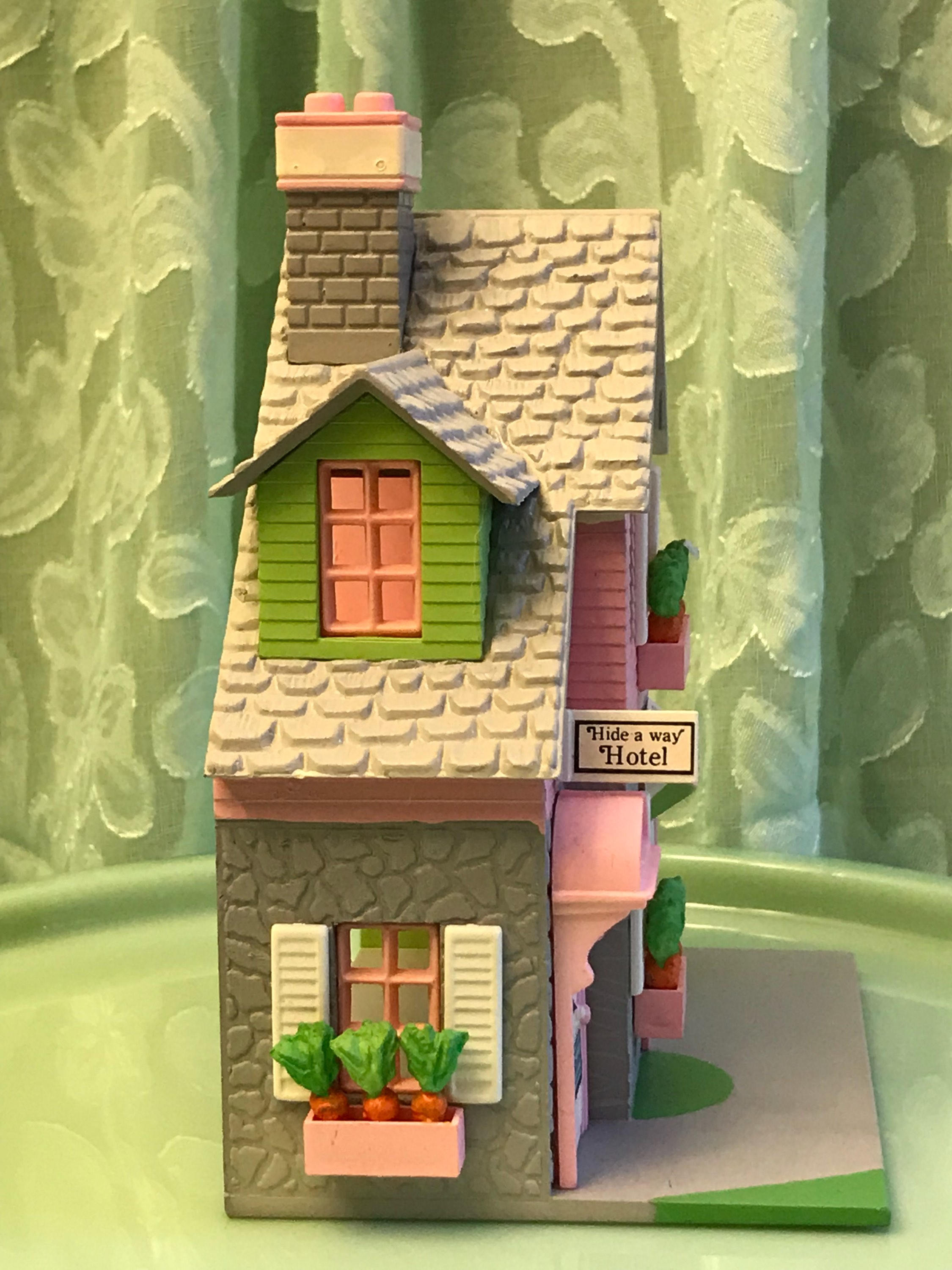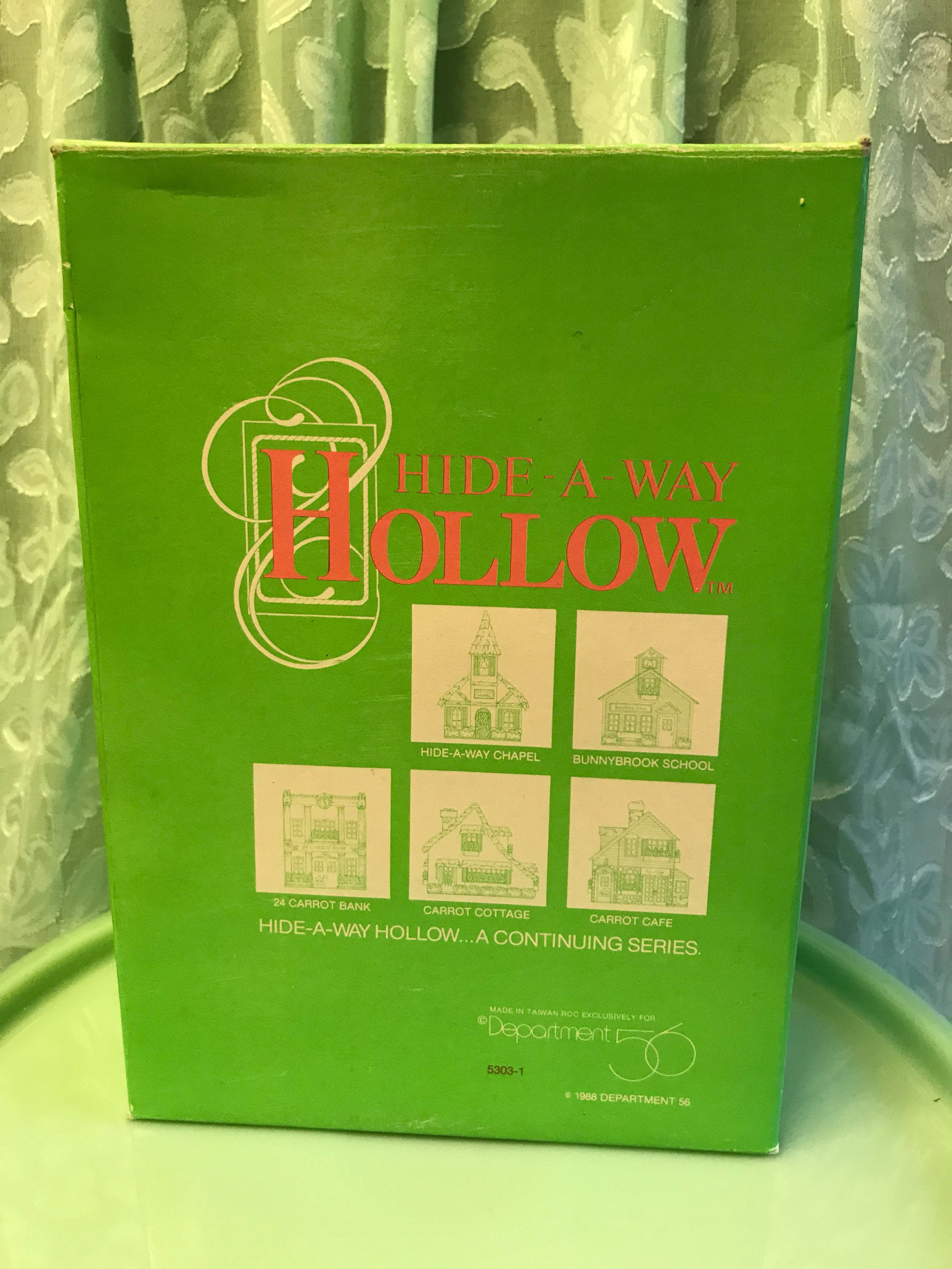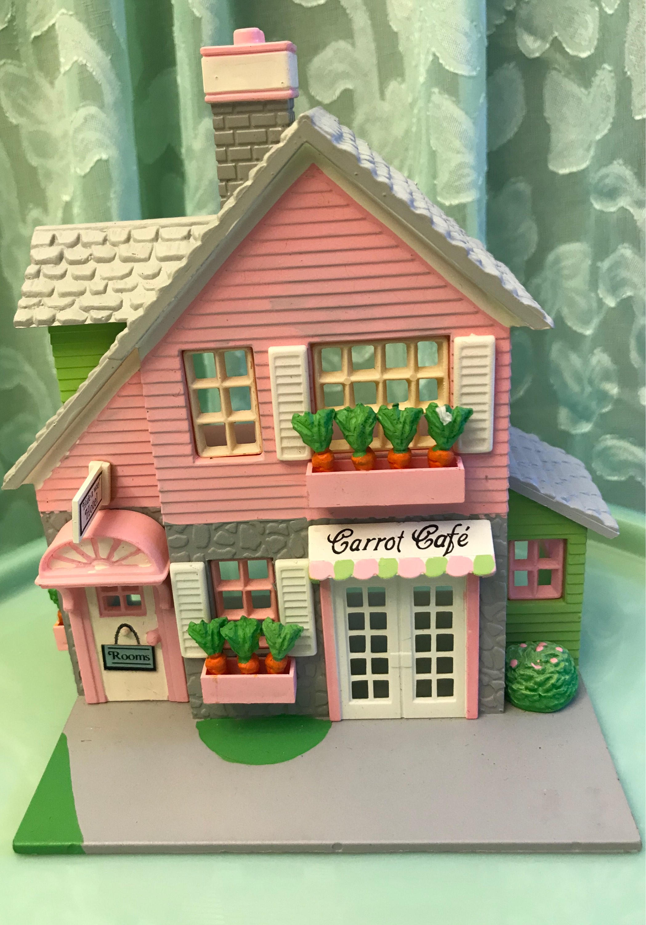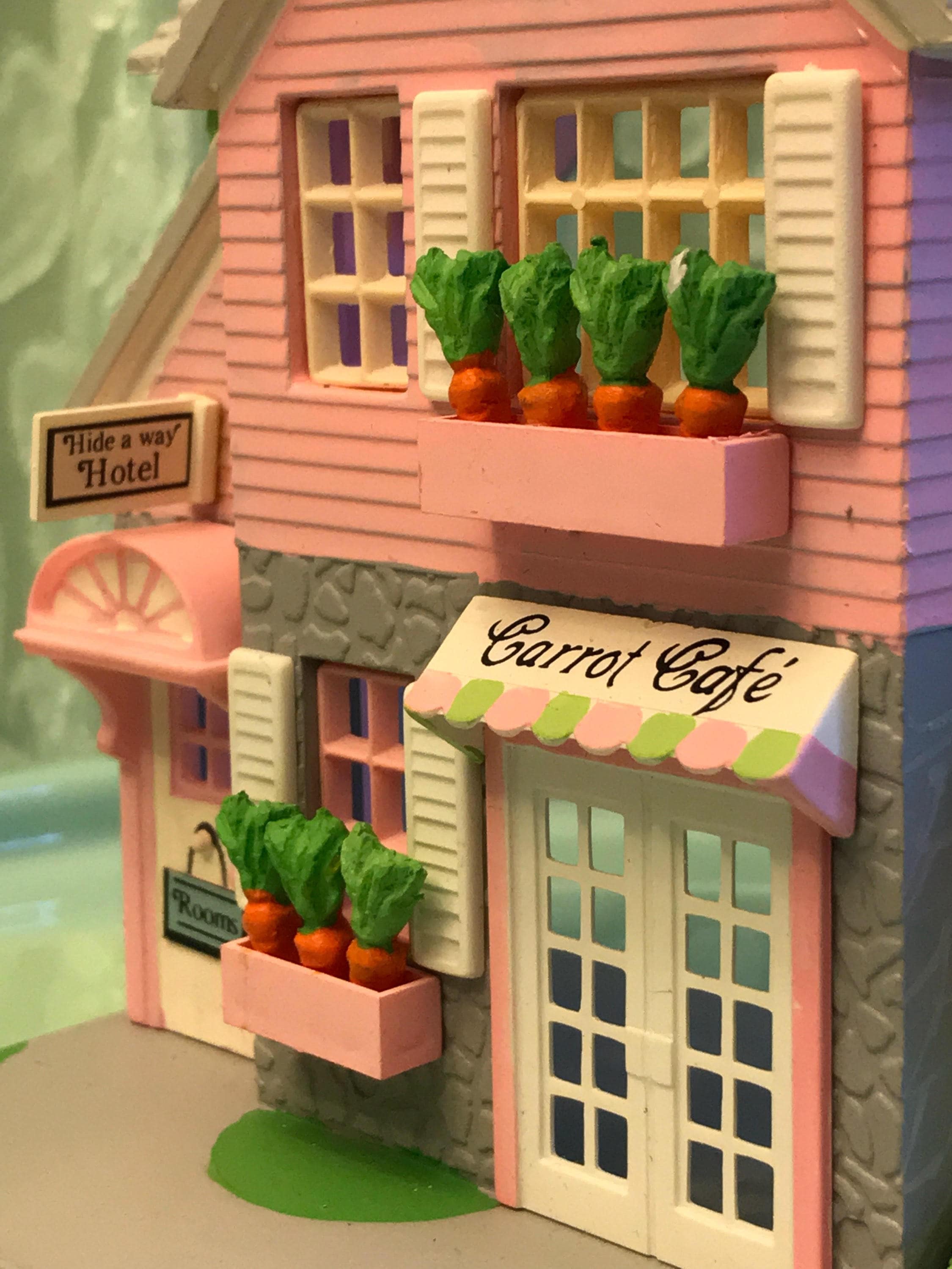 Once upon a time...on the edge of a wide green meadow...was a place called Hide-A-Way Hollow. This adorable little Hide-A-Way Carrot Cafe is part of the Collectible Dept 56 Bunny Village. A darling little Cafe complete with a striped awning and adjacent Hotel. The detail on this little Cafe is so engaging. Tiny carrots grace the flower boxes and pretty French doors are just a few of the the items that make this sooo cute! I also love thinking of the delicious carrot cake that could be served at this Tiny Cafe.