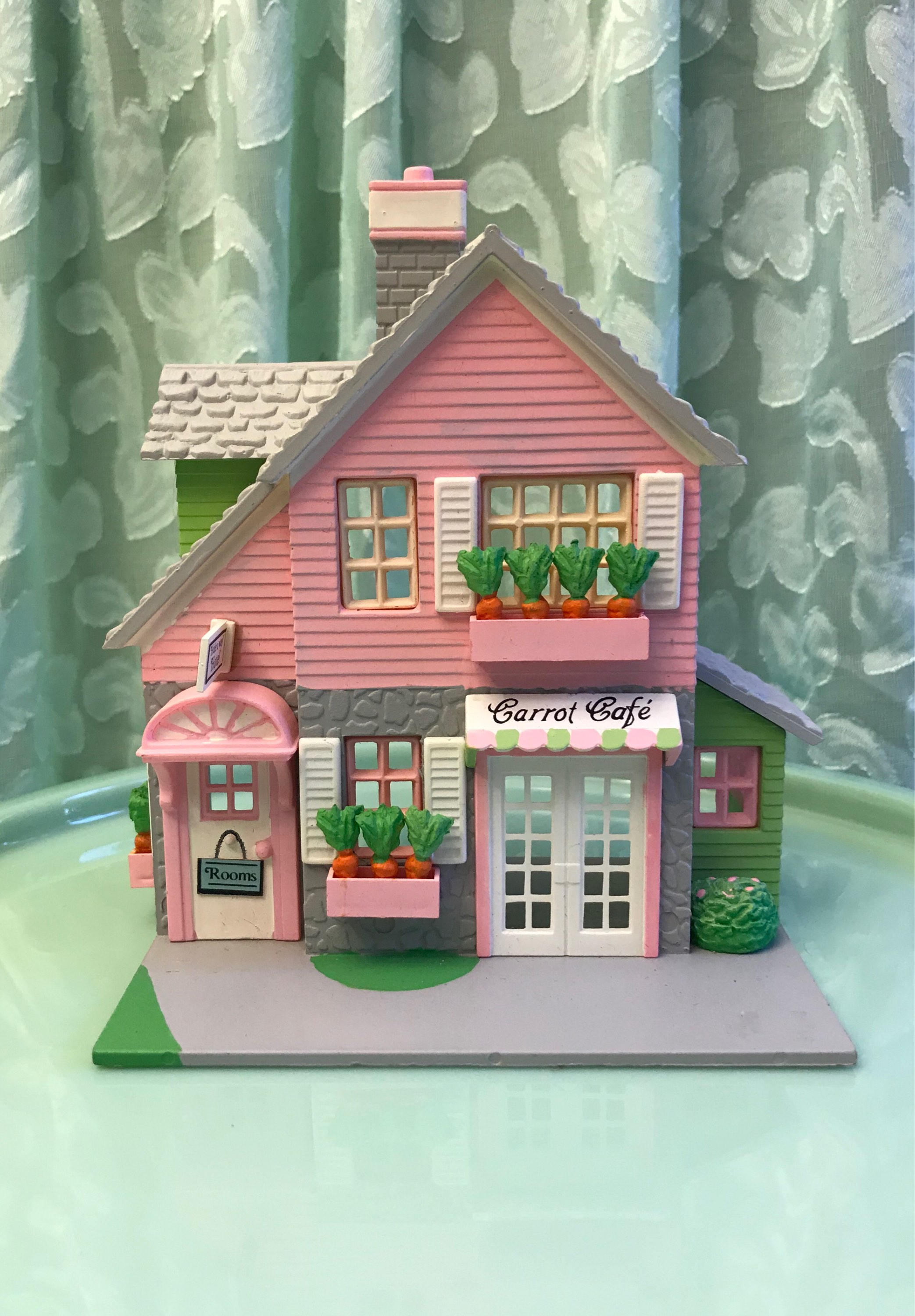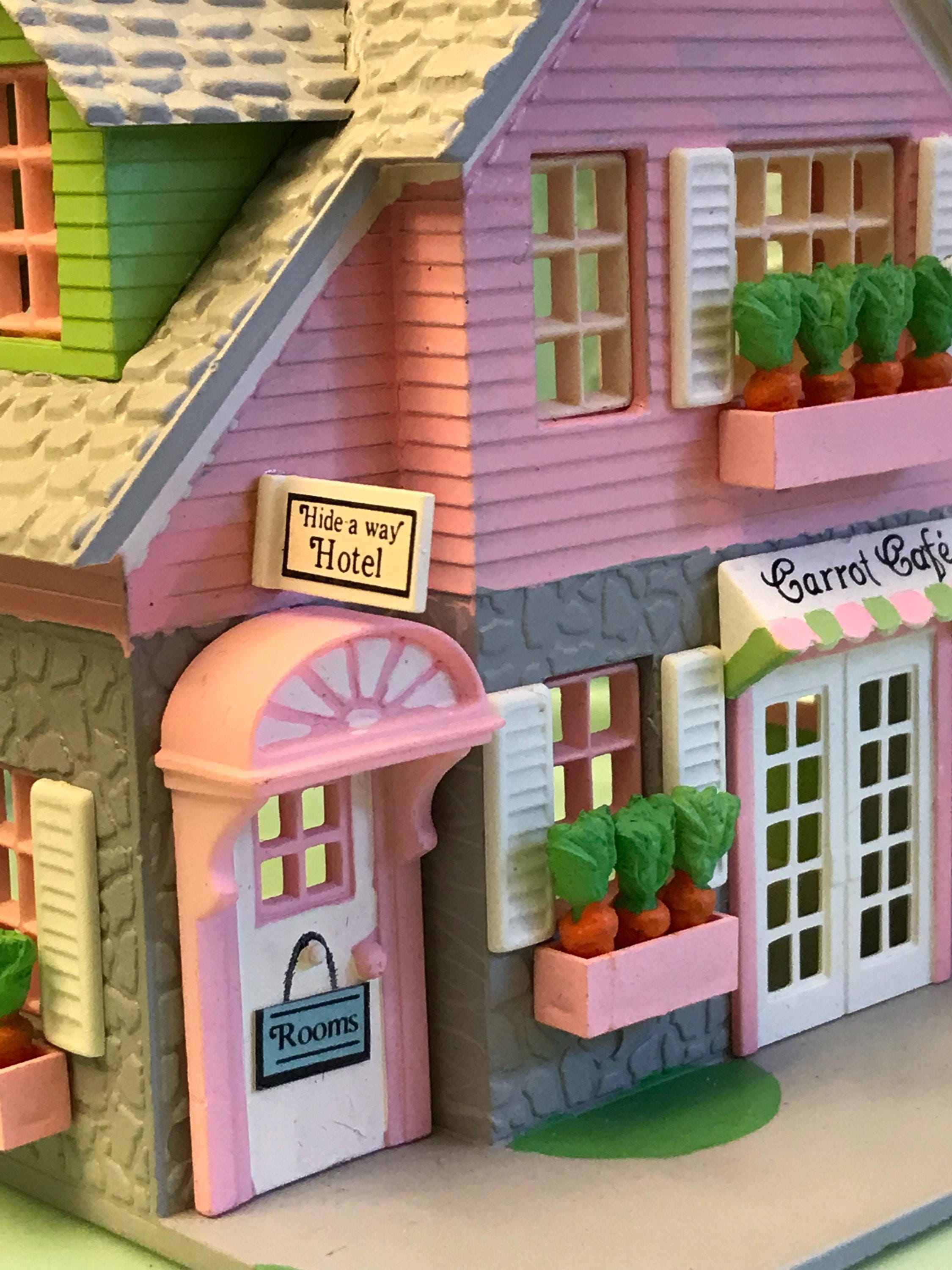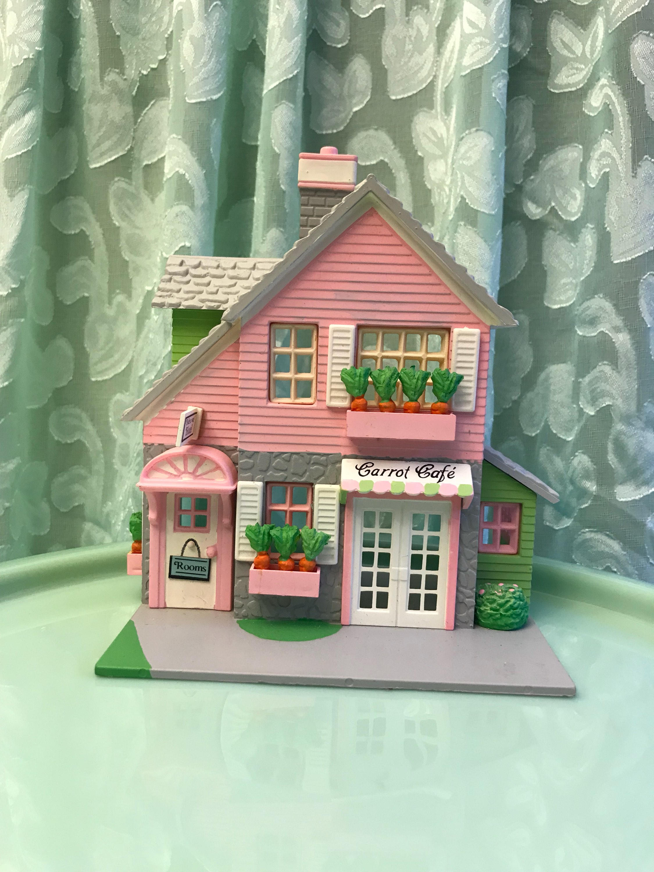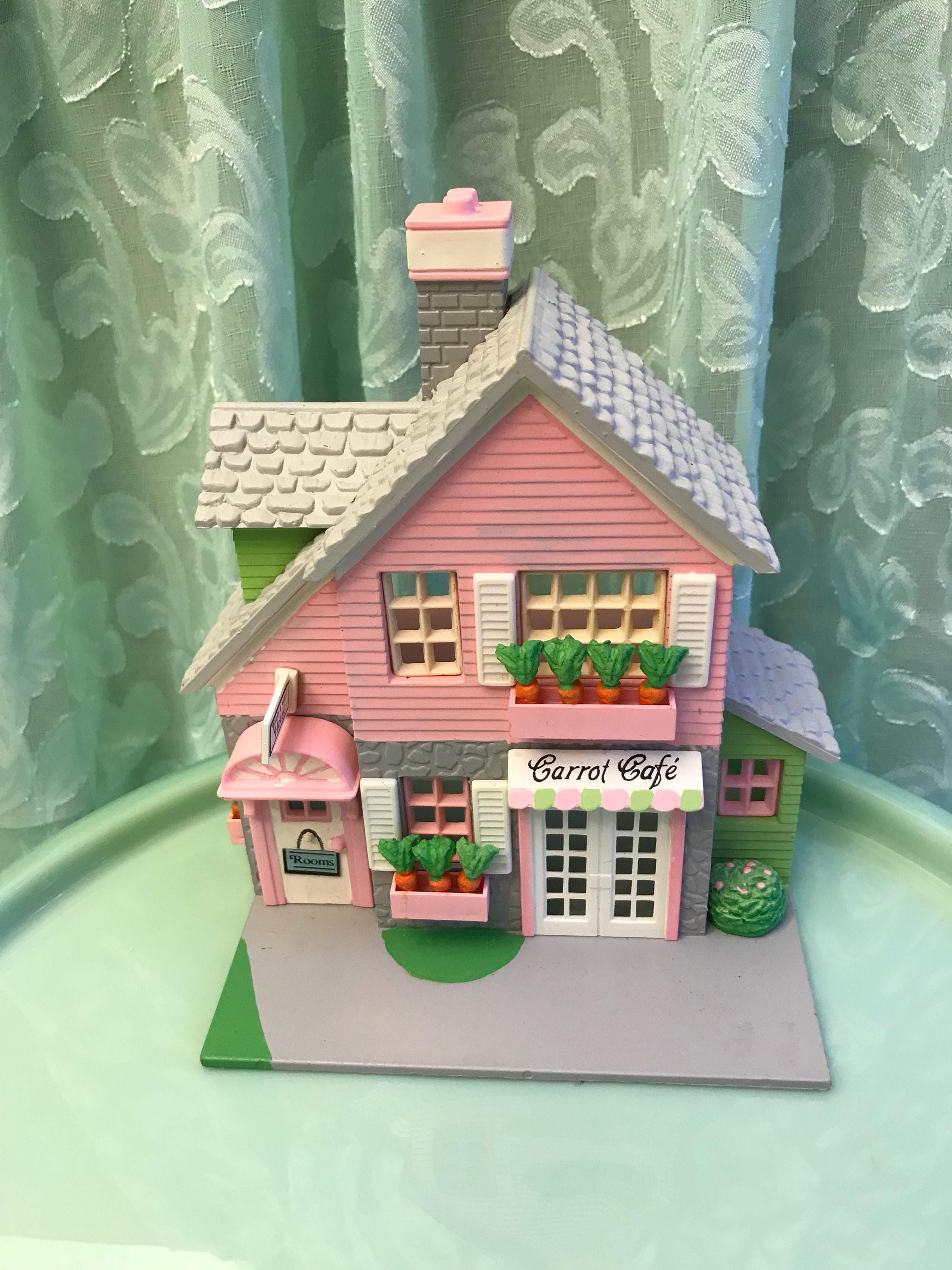 Once upon a time...on the edge of a wide green meadow...was a place called Hide-A-Way Hollow. This adorable little Hide-A-Way Carrot Cafe is part of the Collectible Dept 56 Bunny Village. A darling little Cafe complete with a striped awning and adjacent Hotel. The detail on this little Cafe is so engaging. Tiny carrots grace the flower boxes and pretty French doors are just a few of the the items that make this sooo cute! I also love thinking of the delicious carrot cake that could be served at this Tiny Cafe.