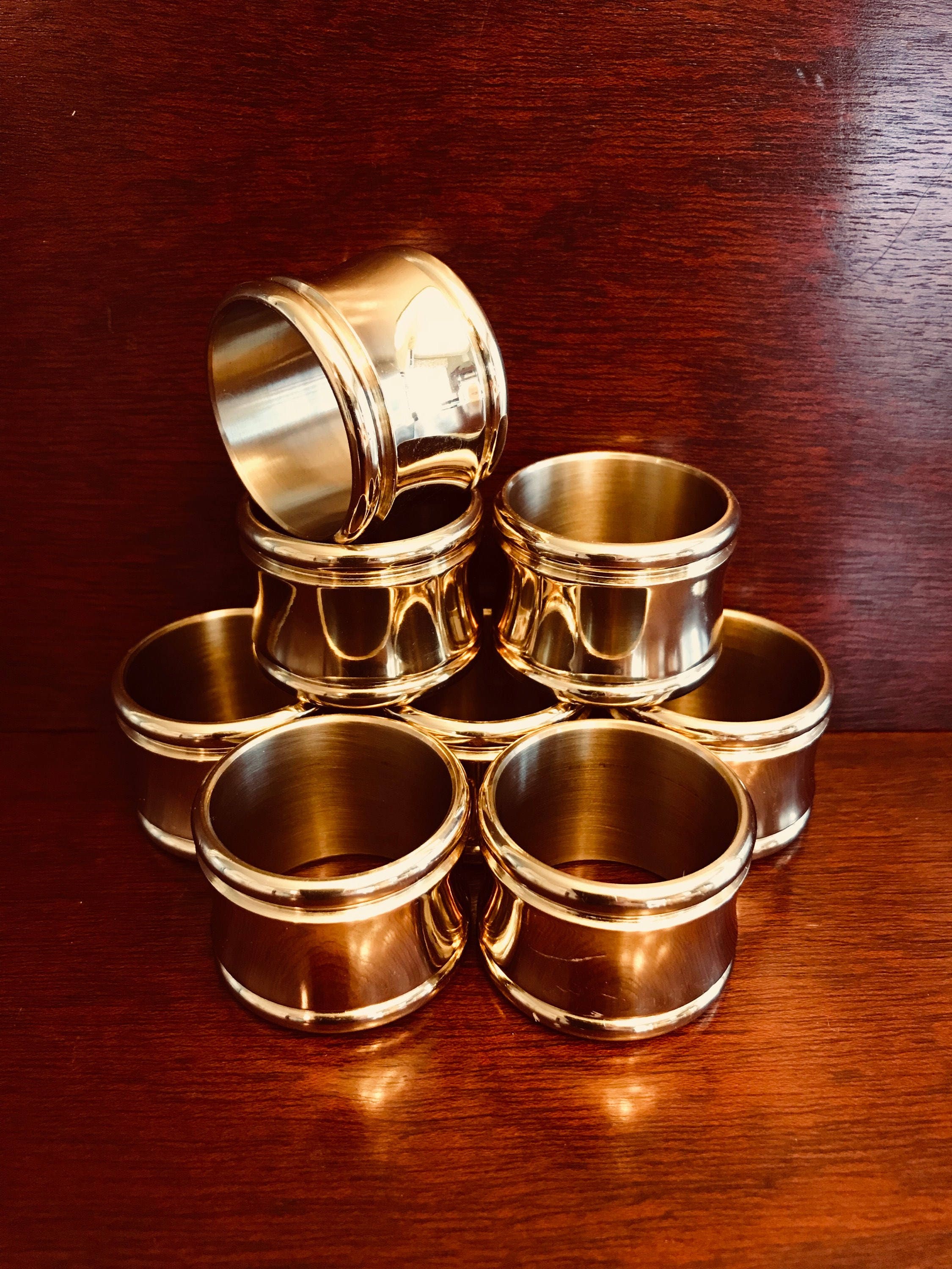 Vintage Brass Napkin Rings. This is a beautiful set of napkin rings. Add a classy touch to your dinner party with these elegant Brass rings encasing your cloth napkins. A set of 8 in Very Good Vintage Condition.