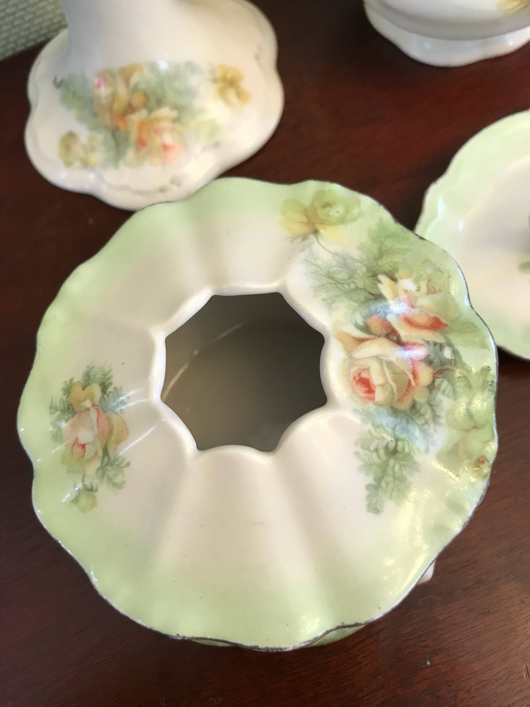 This is a beautiful Antique Limoges France vanity dressing table set. A lovely collection which includes a matching set of candlestick holders, small and medium covered trinket boxes, a hair receiver, and an ornate ring holder. They are decorated in a lovely soft green with yellow floral Rose transfers. This set is accented with hand decorated gold guilt. In very lovely condition. I believe the makers Marks estimate this set to be late 1891-1914. Marked with the Coiffe Mark 3 Limoges France. Not all pieces are marked, however there were purchased as a set and match.