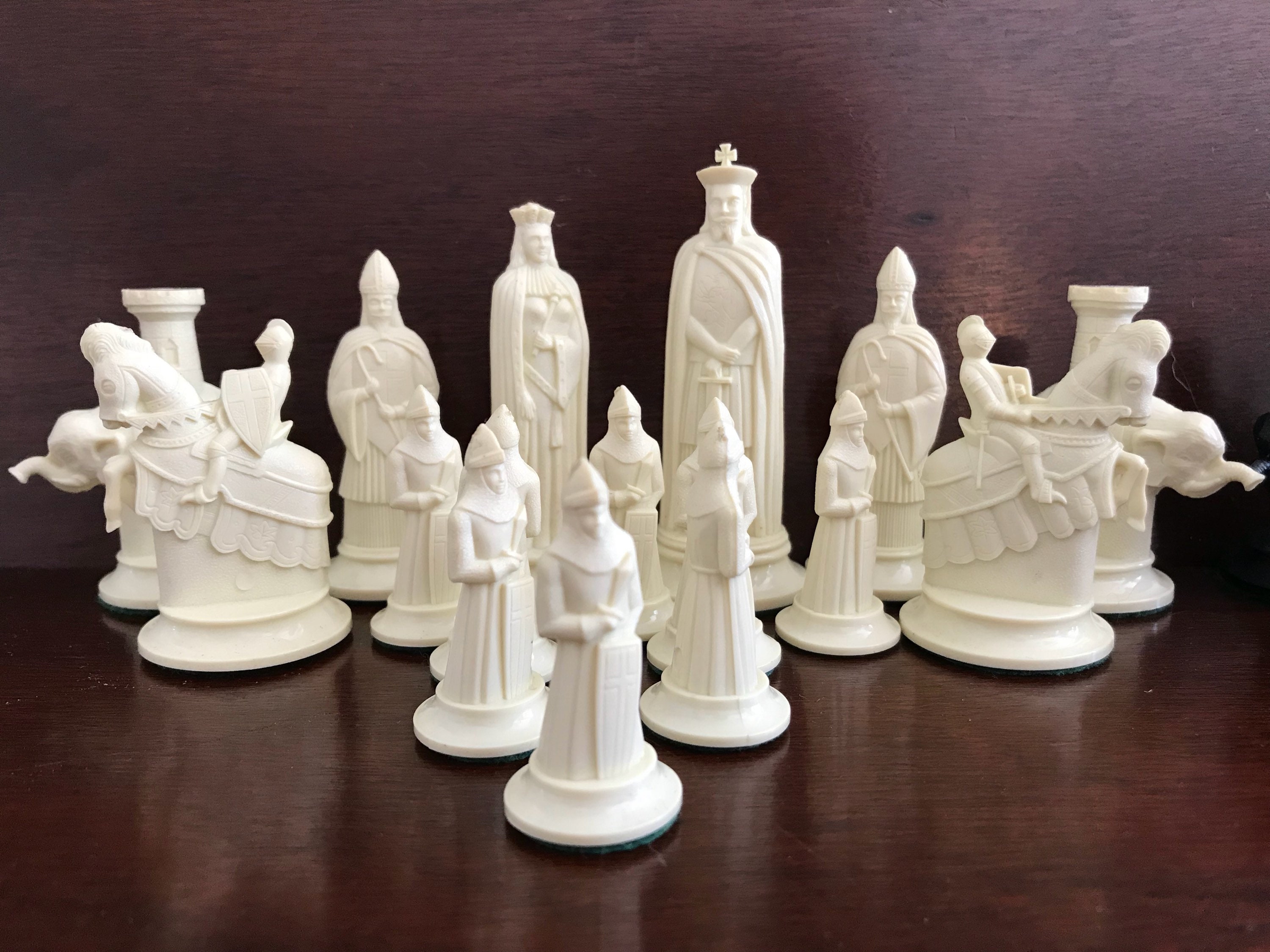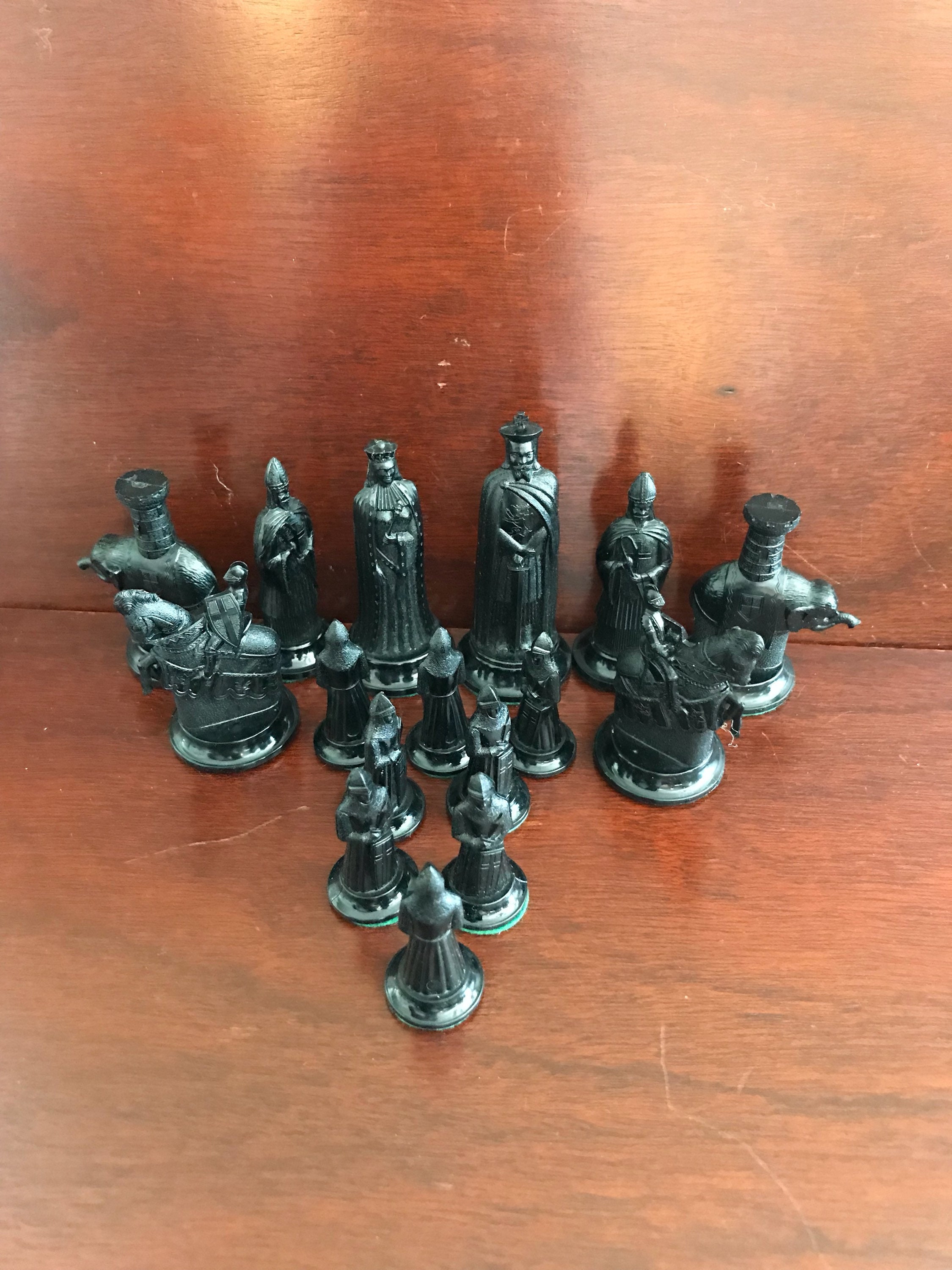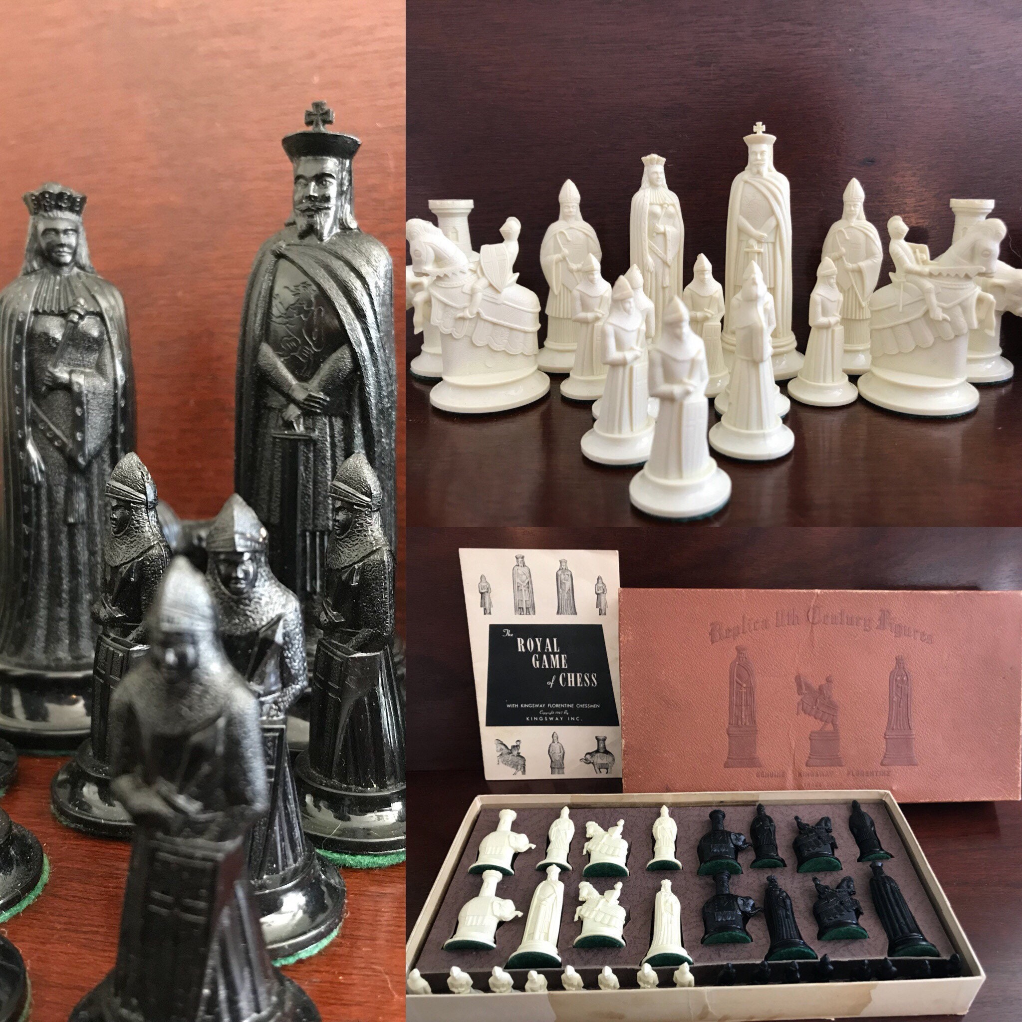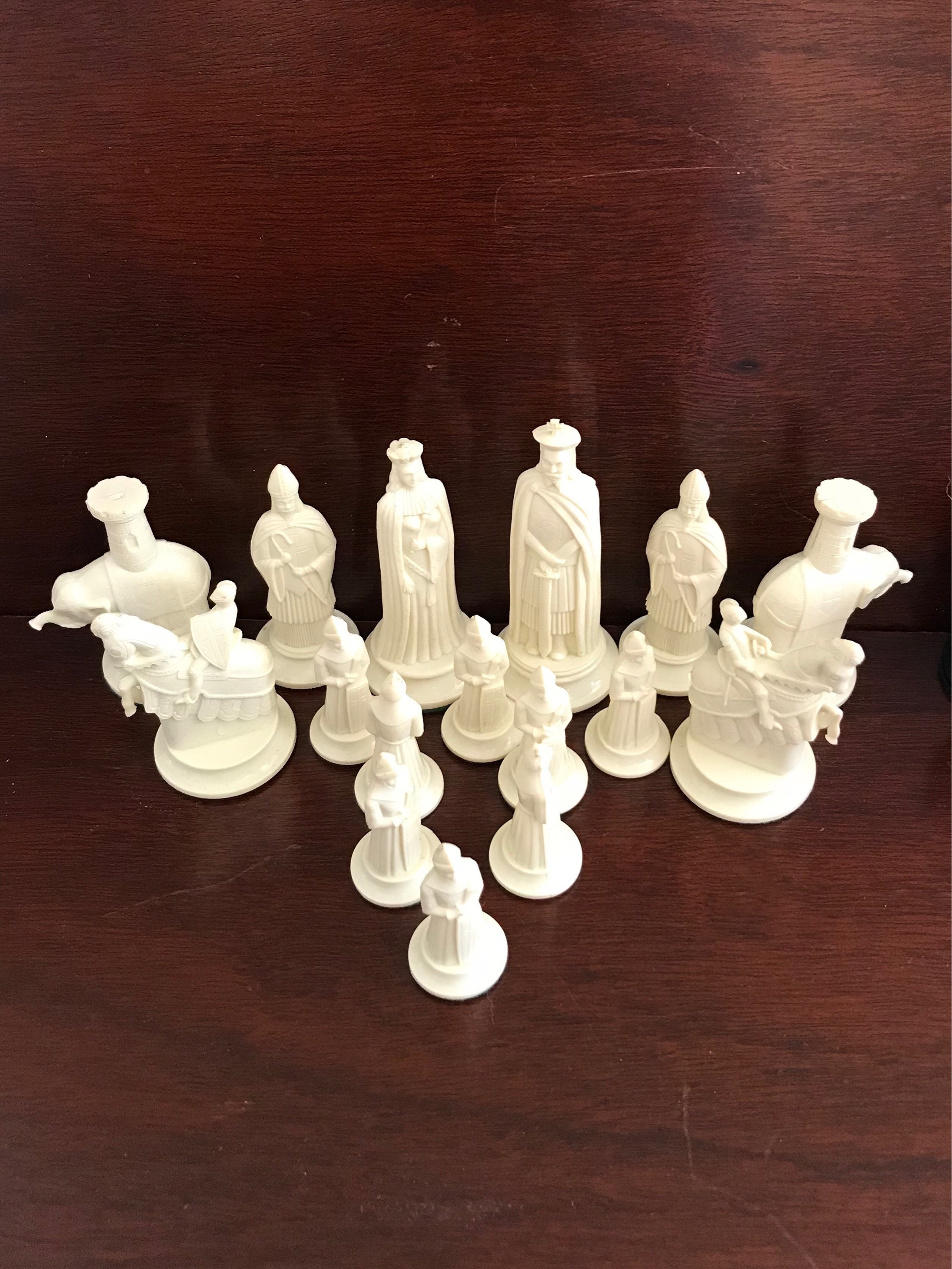 Collector's 11th Century replica Figurines Chess Set. This is a fabulous chess set by Mid Century Game company Kingsway circa 1940-50s. These beautiful chess pieces were molded in high quality plastic.