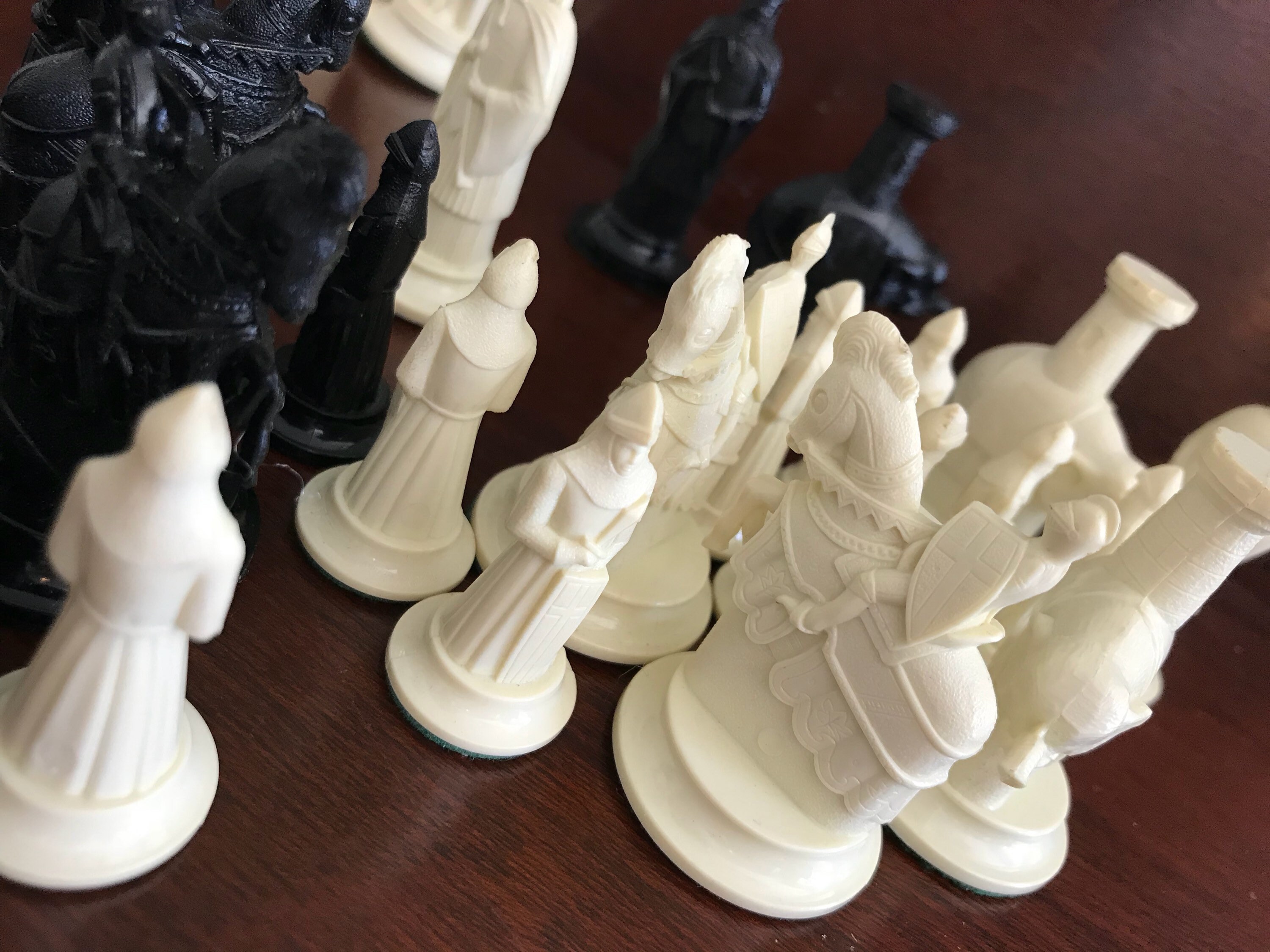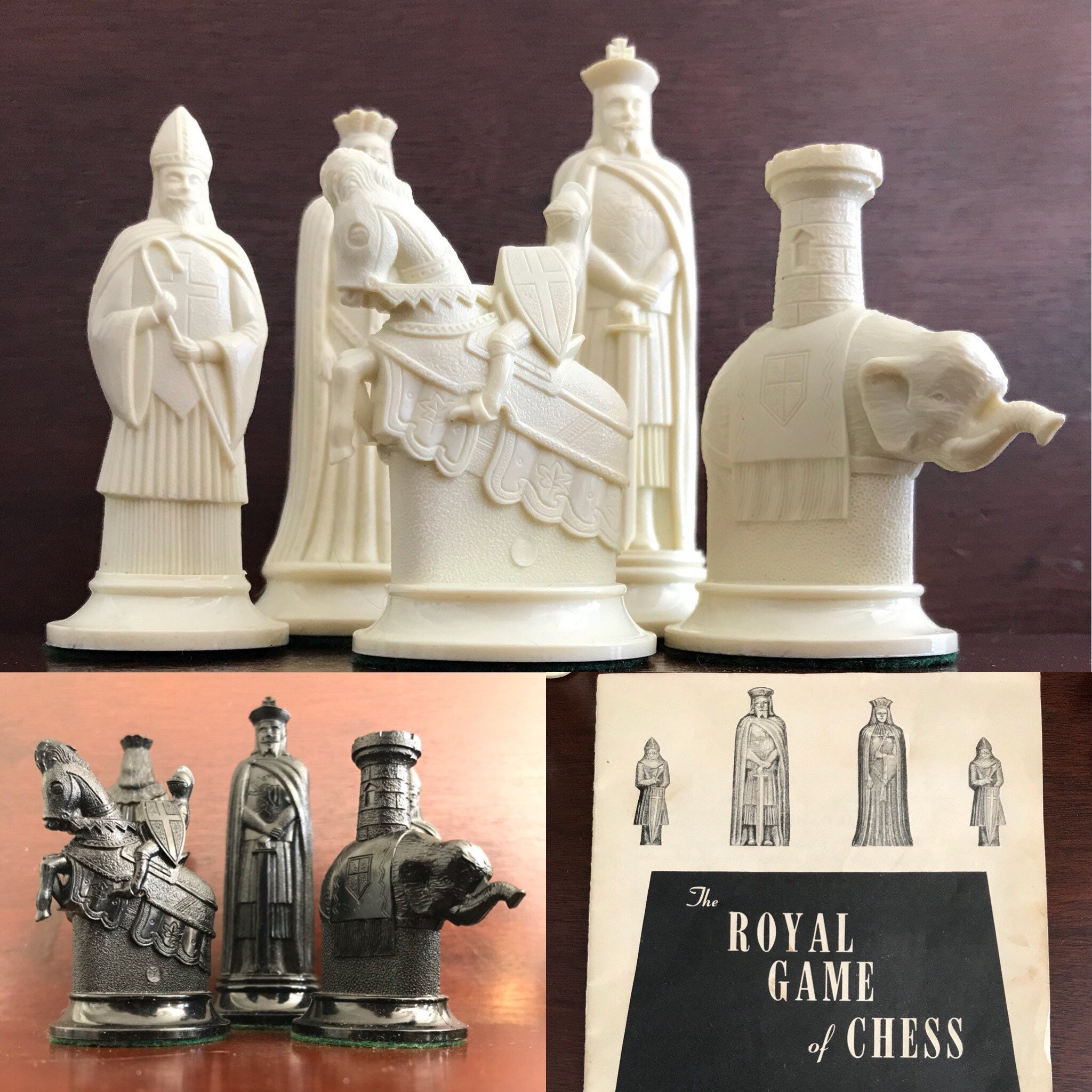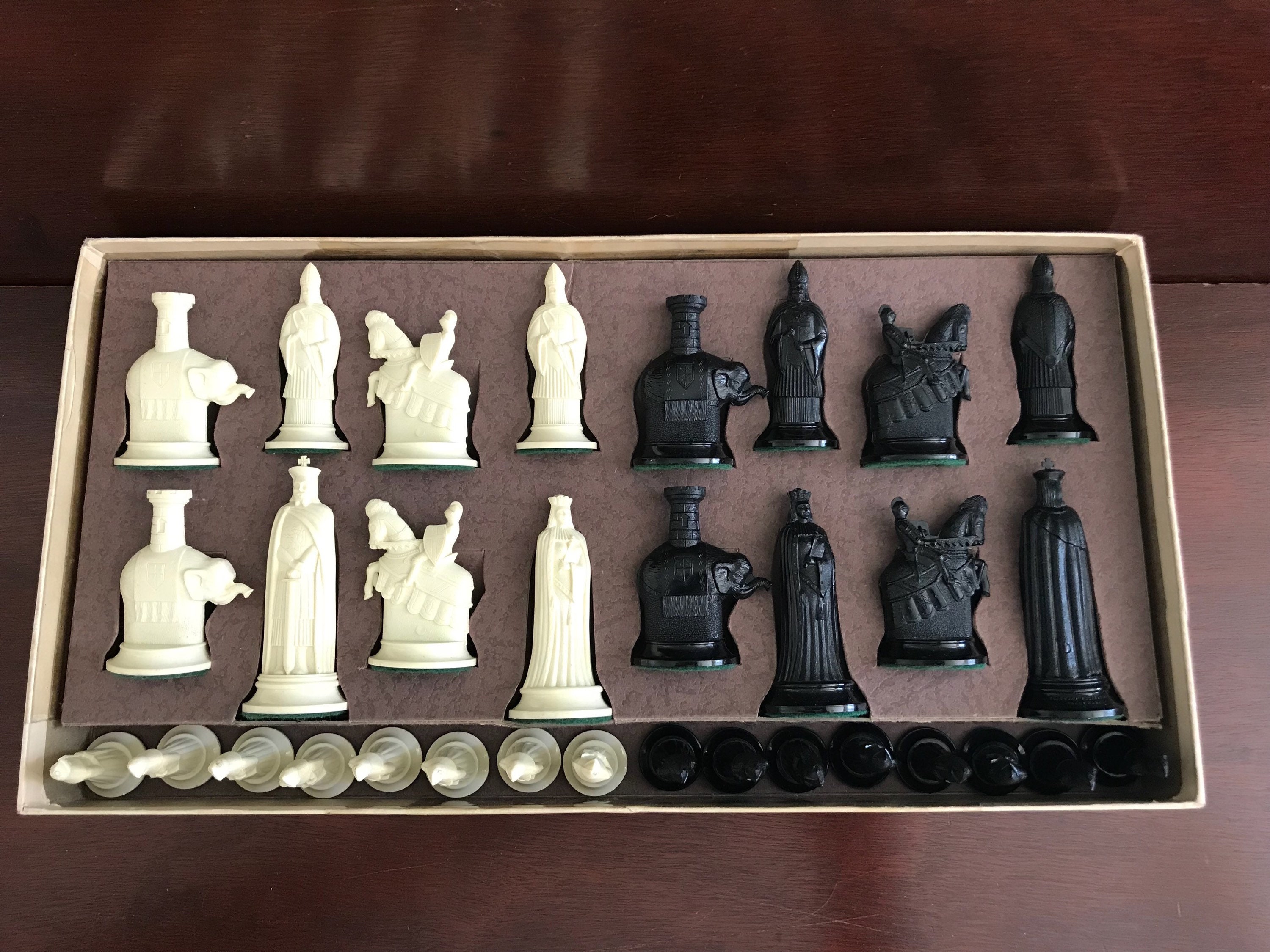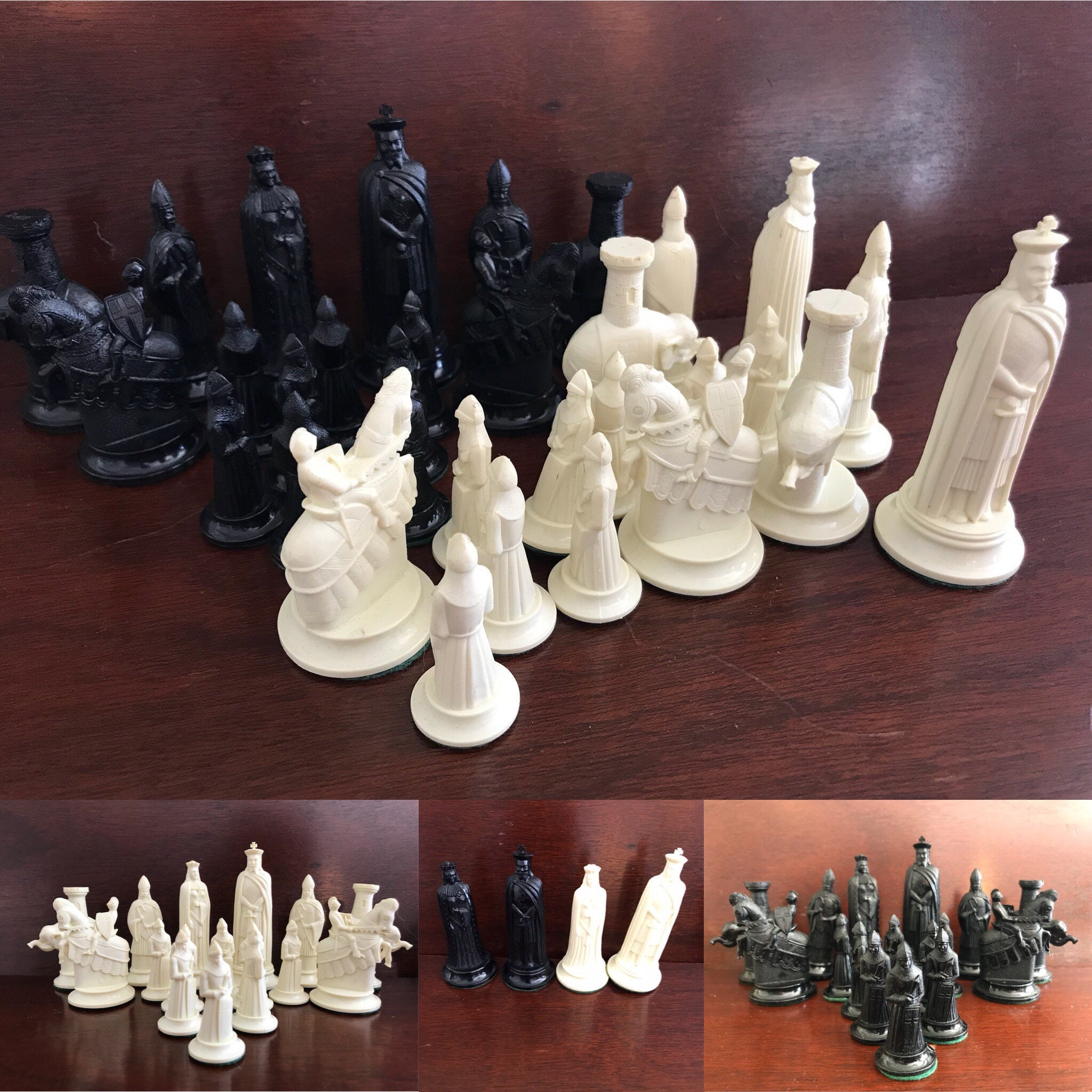 Collector's 11th Century replica Figurines Chess Set. This is a fabulous chess set by Mid Century Game company Kingsway circa 1940-50s. These beautiful chess pieces were molded in high quality plastic.