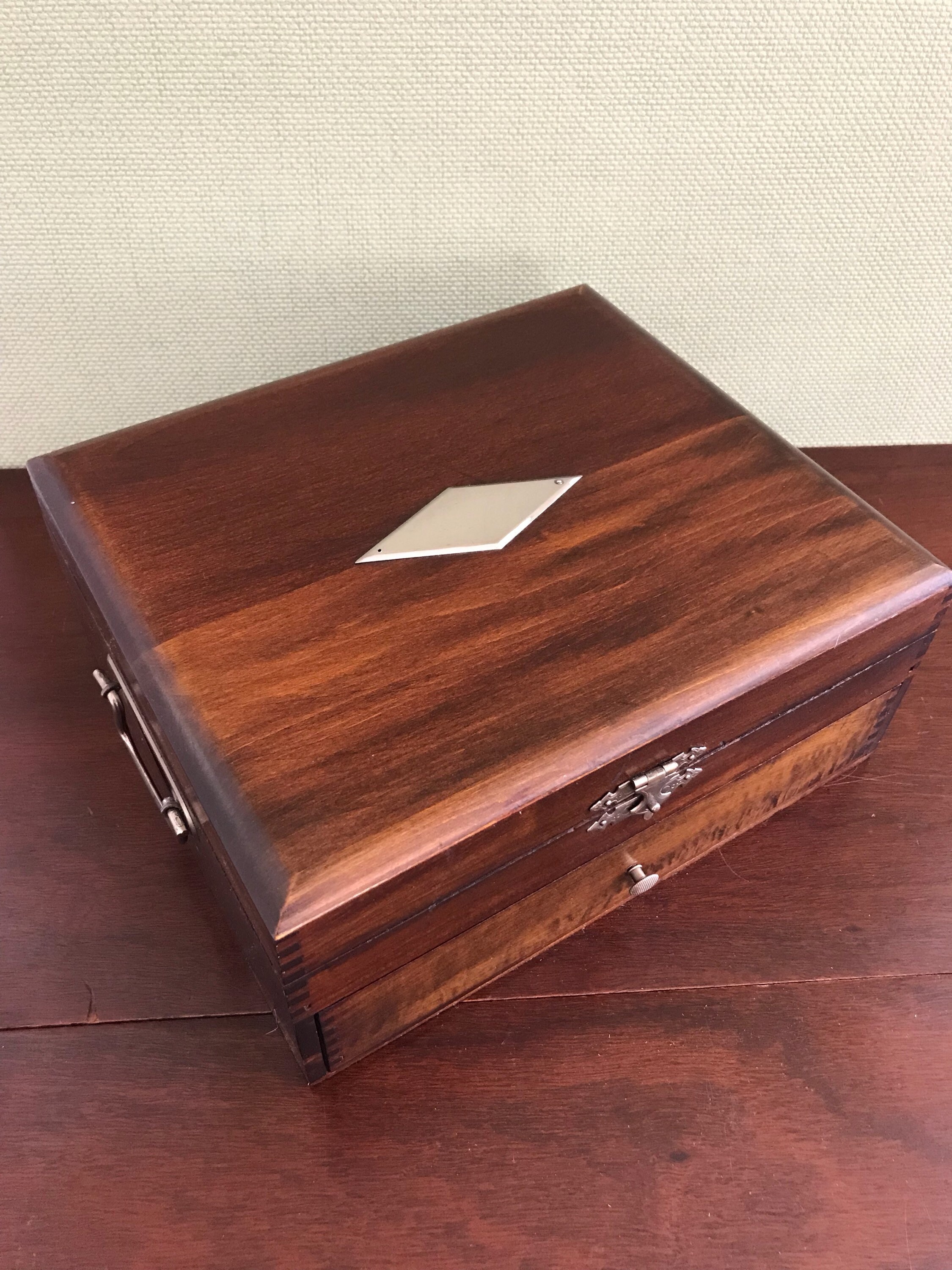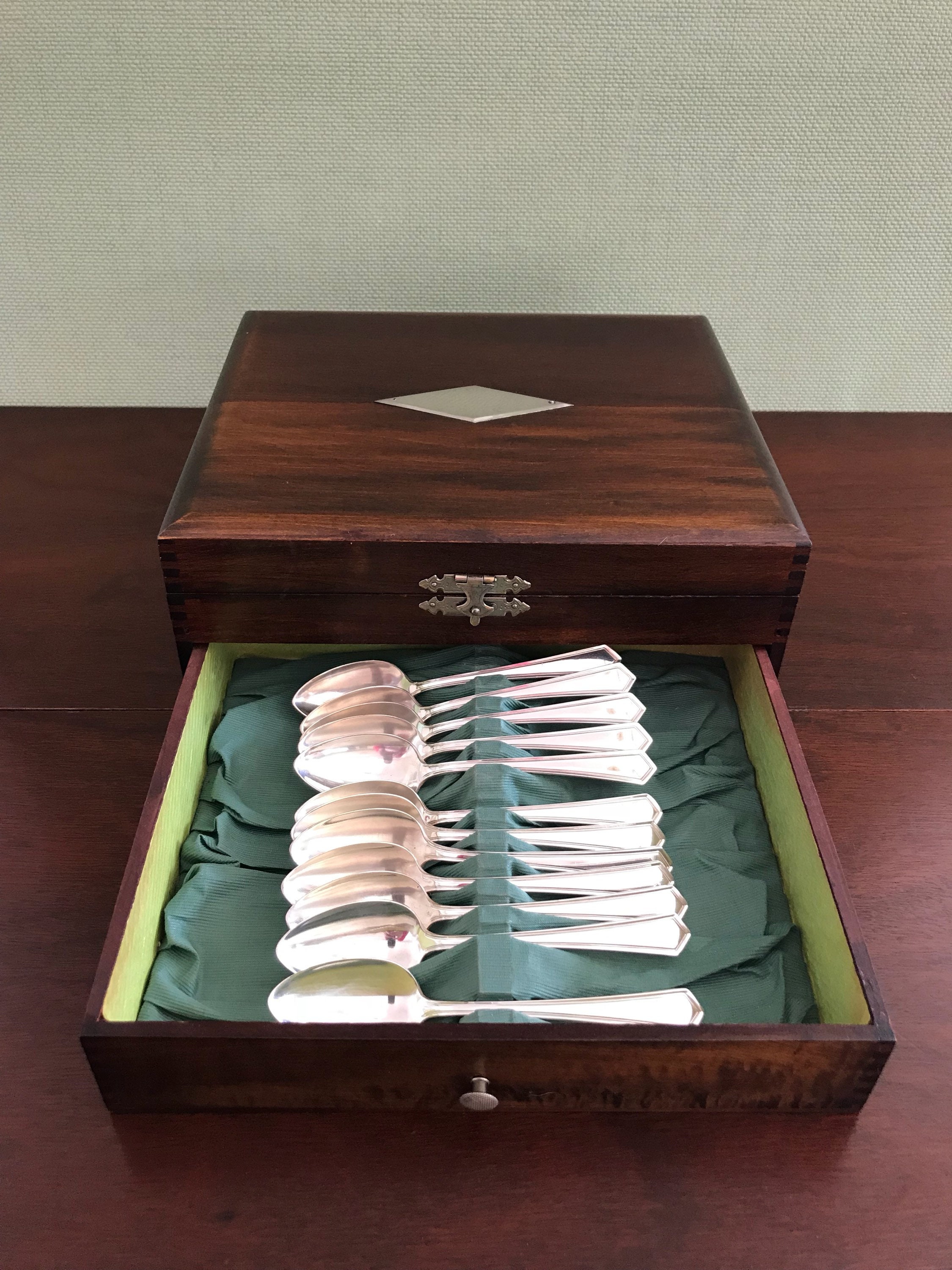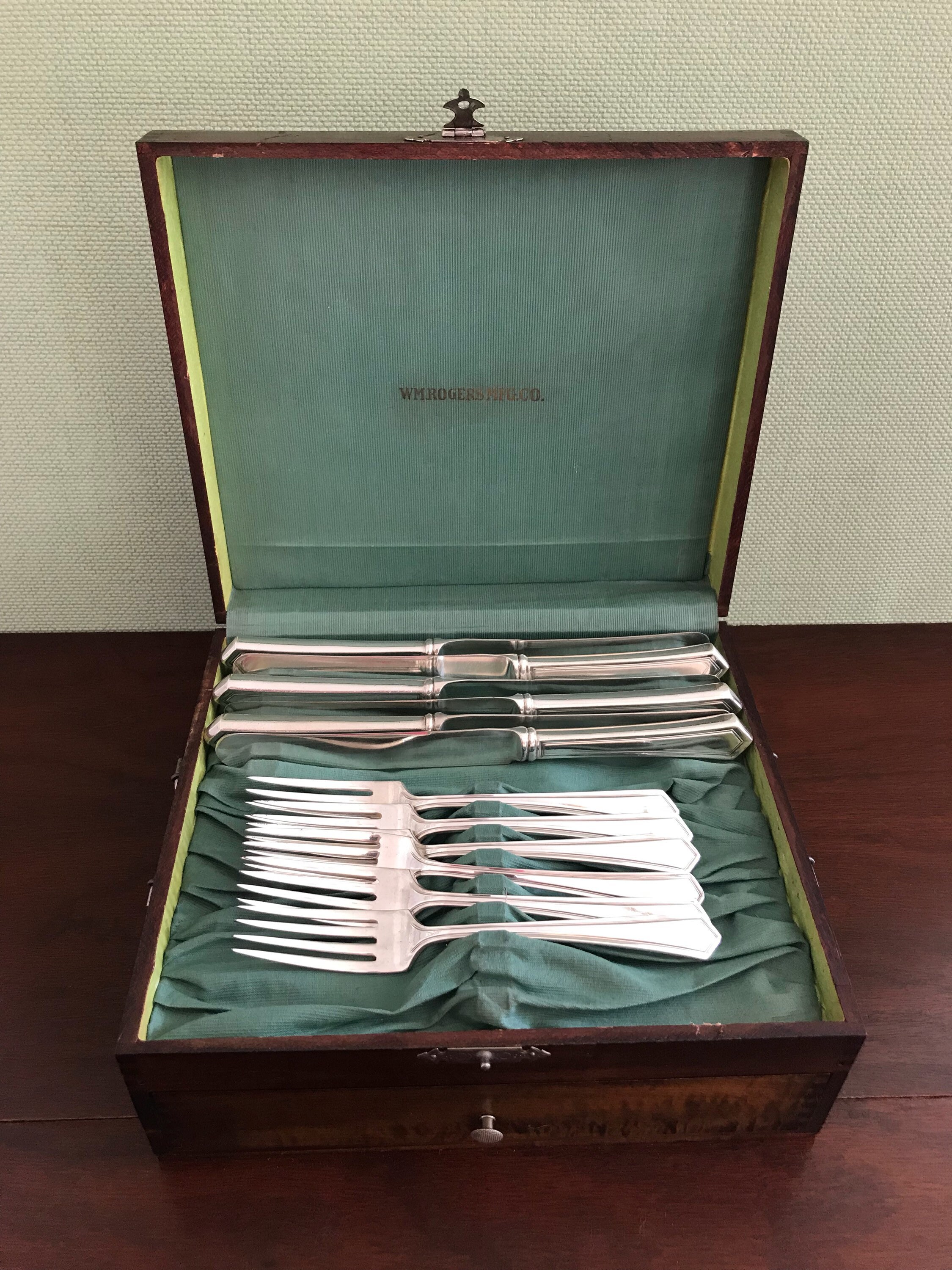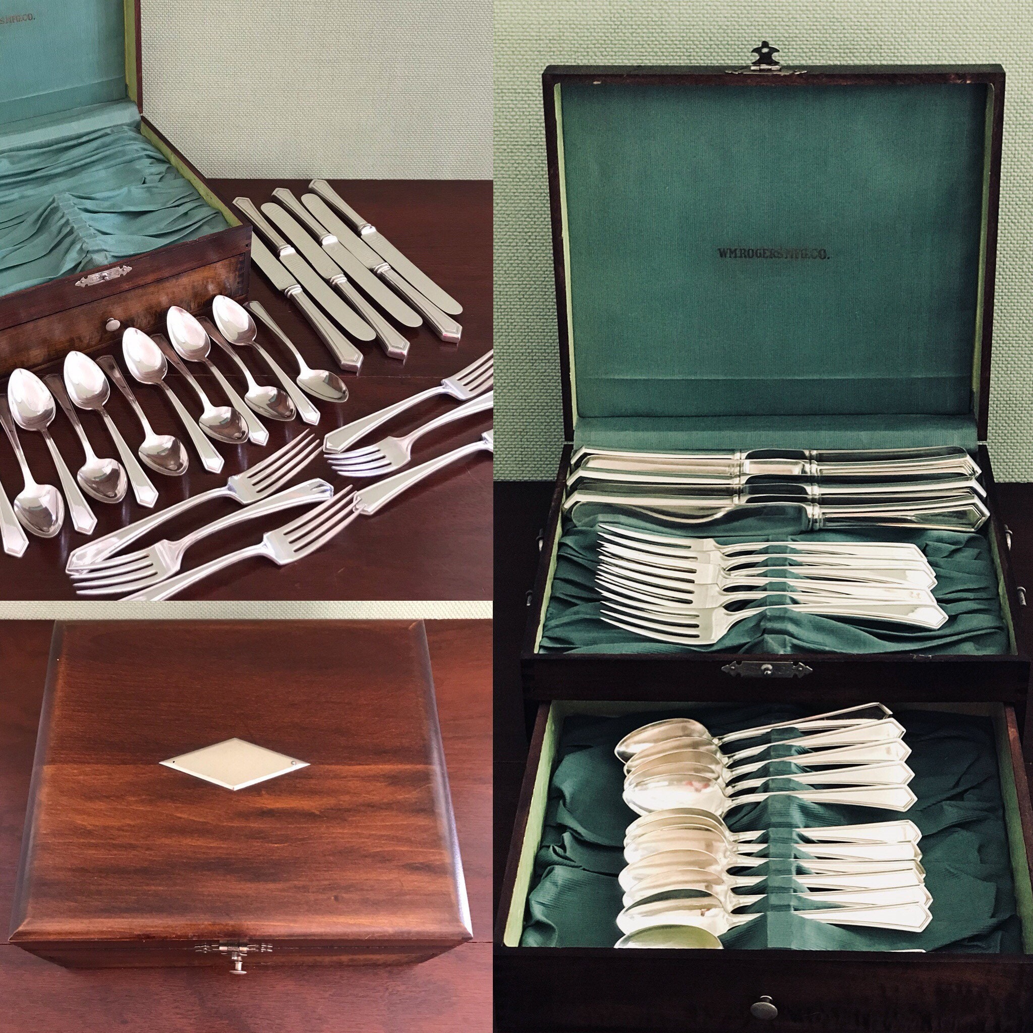 This set comes with the Original WM Rogers Antique Wood chest. The gorgeous chest is in a dark solid wood with beautifully dovetailed corners and a soft satin finish. It has antique bronze handles on either side and a bronze clasp to close the lid. On the lid is an original metal plate for engraving. The small silver drawer at the front has a tiny knob. The chest has its original fabric lining in a two-tone green. Absolutely gorgeous!