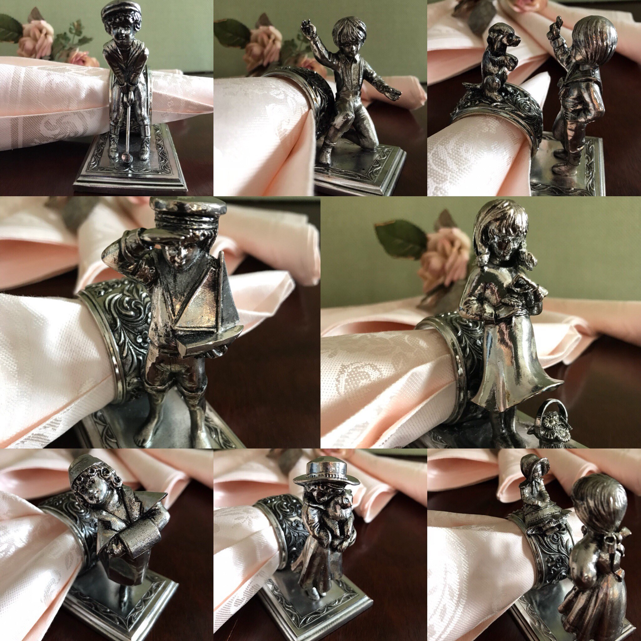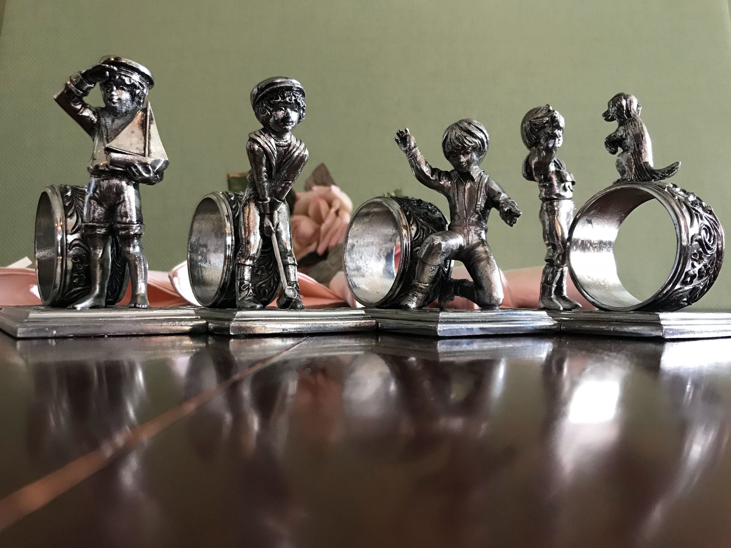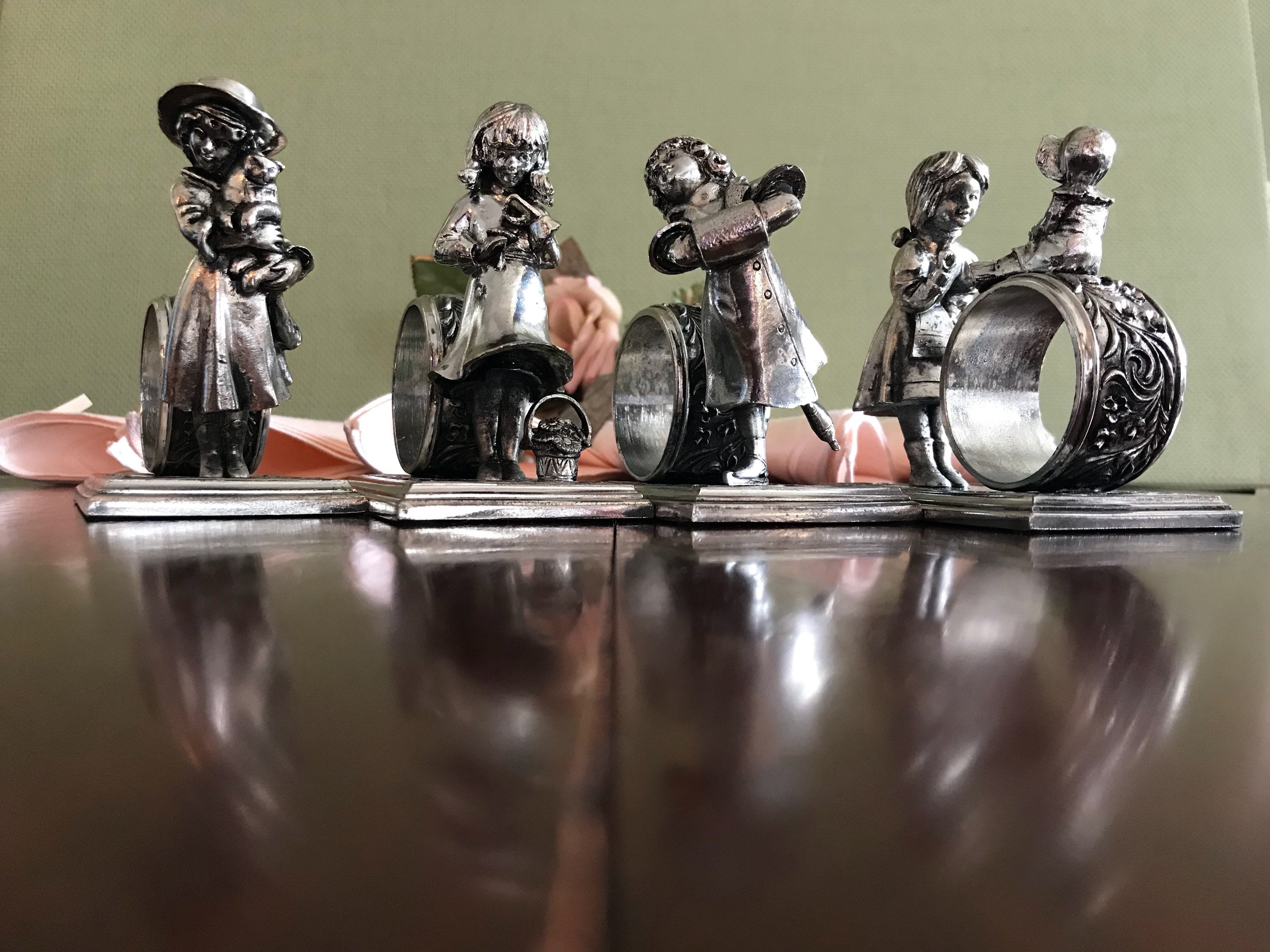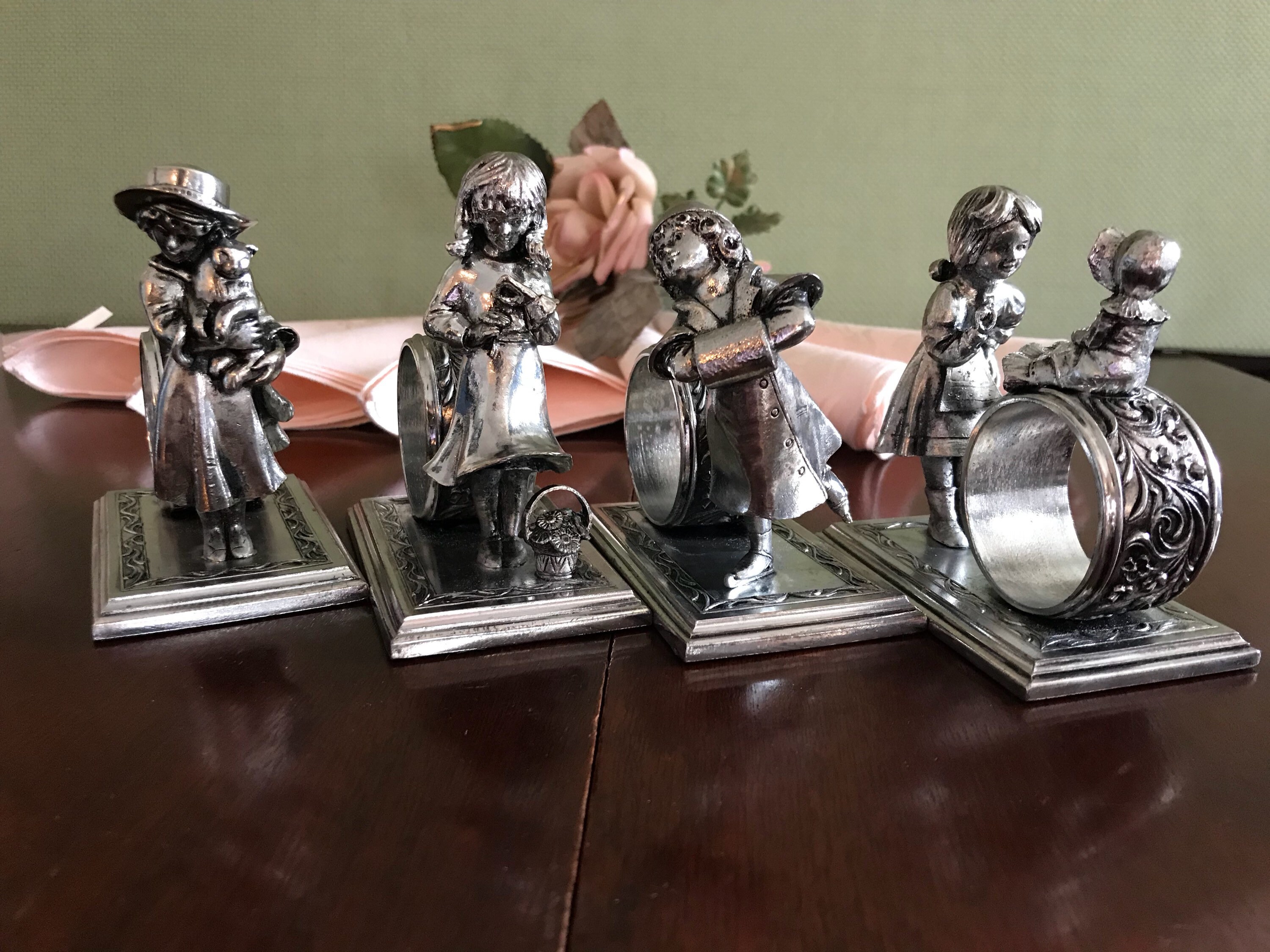 Vintage Silverplated Figural Napkin Rings with lovely Victorian children at Play on top. This is a beautiful set of Collectible Sculptured Silver plated napkin rings,