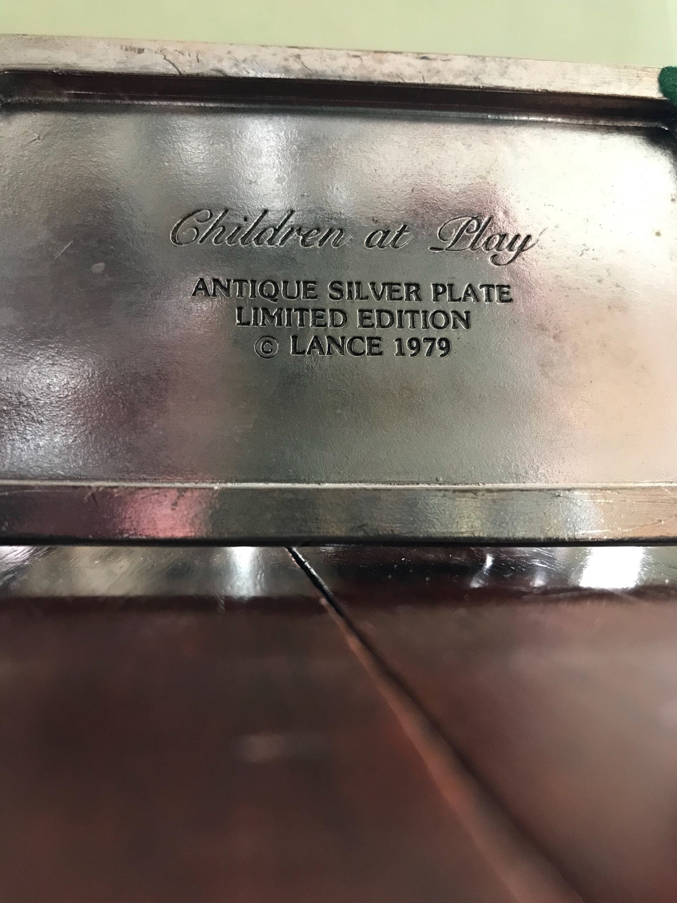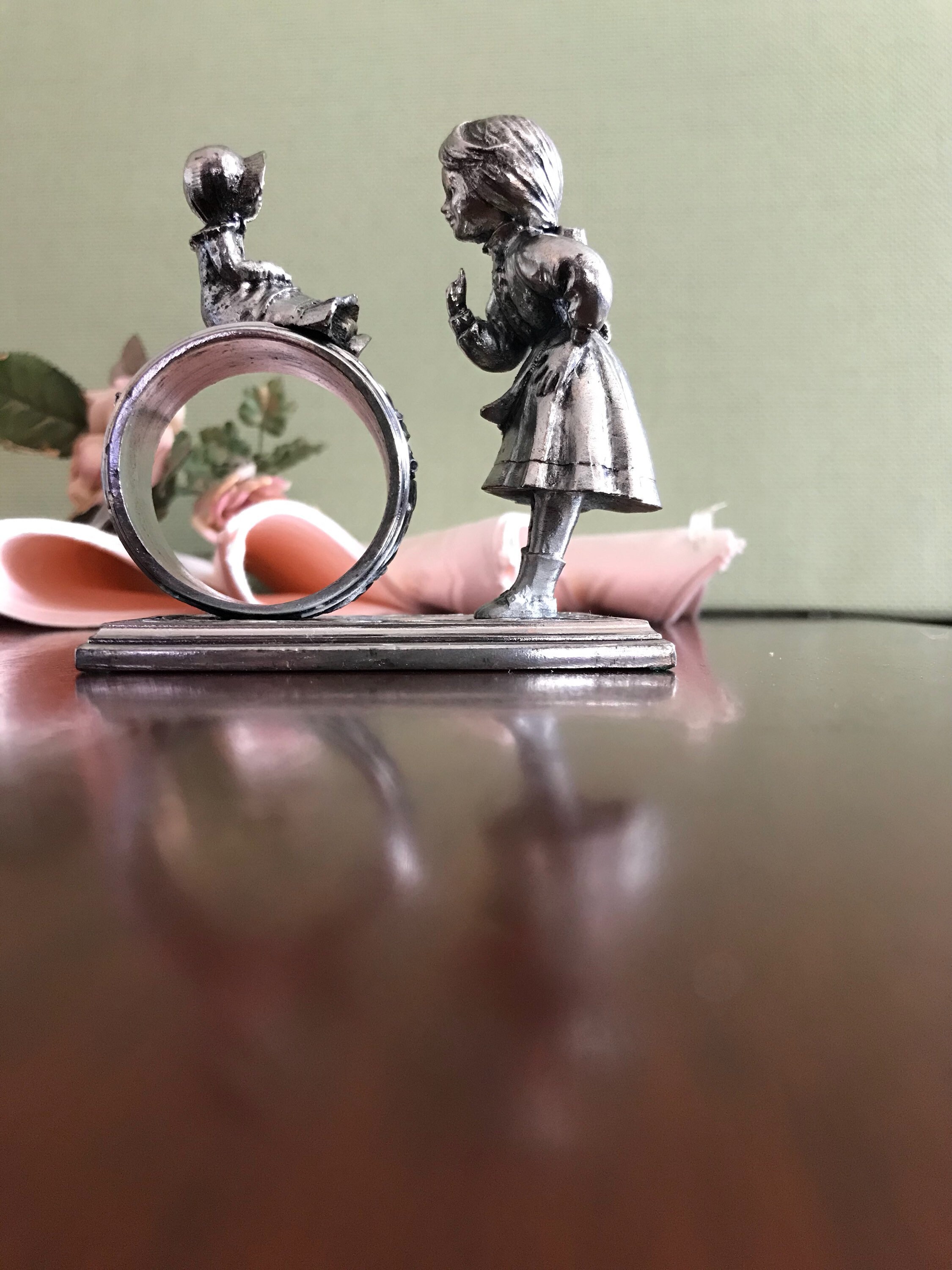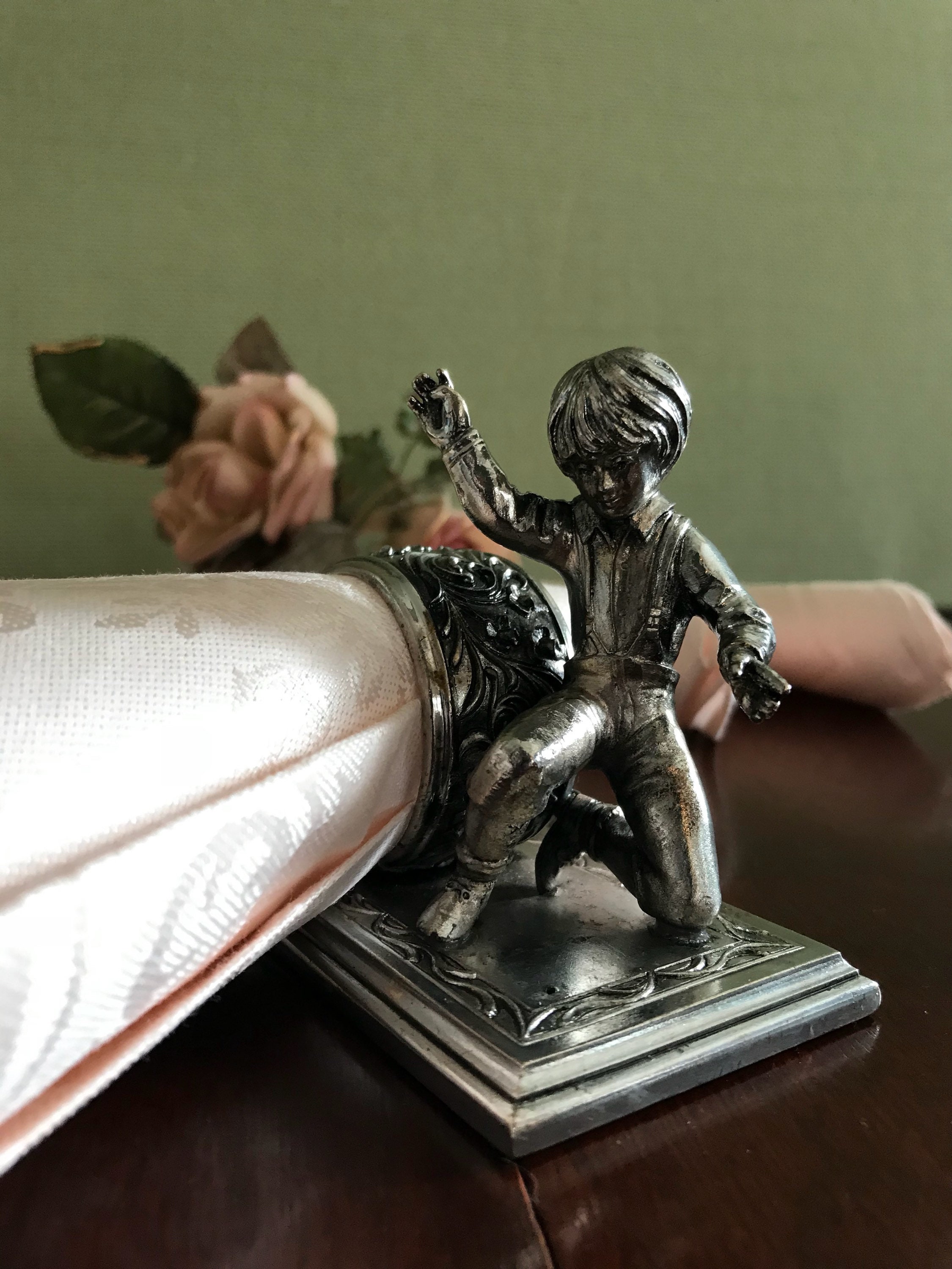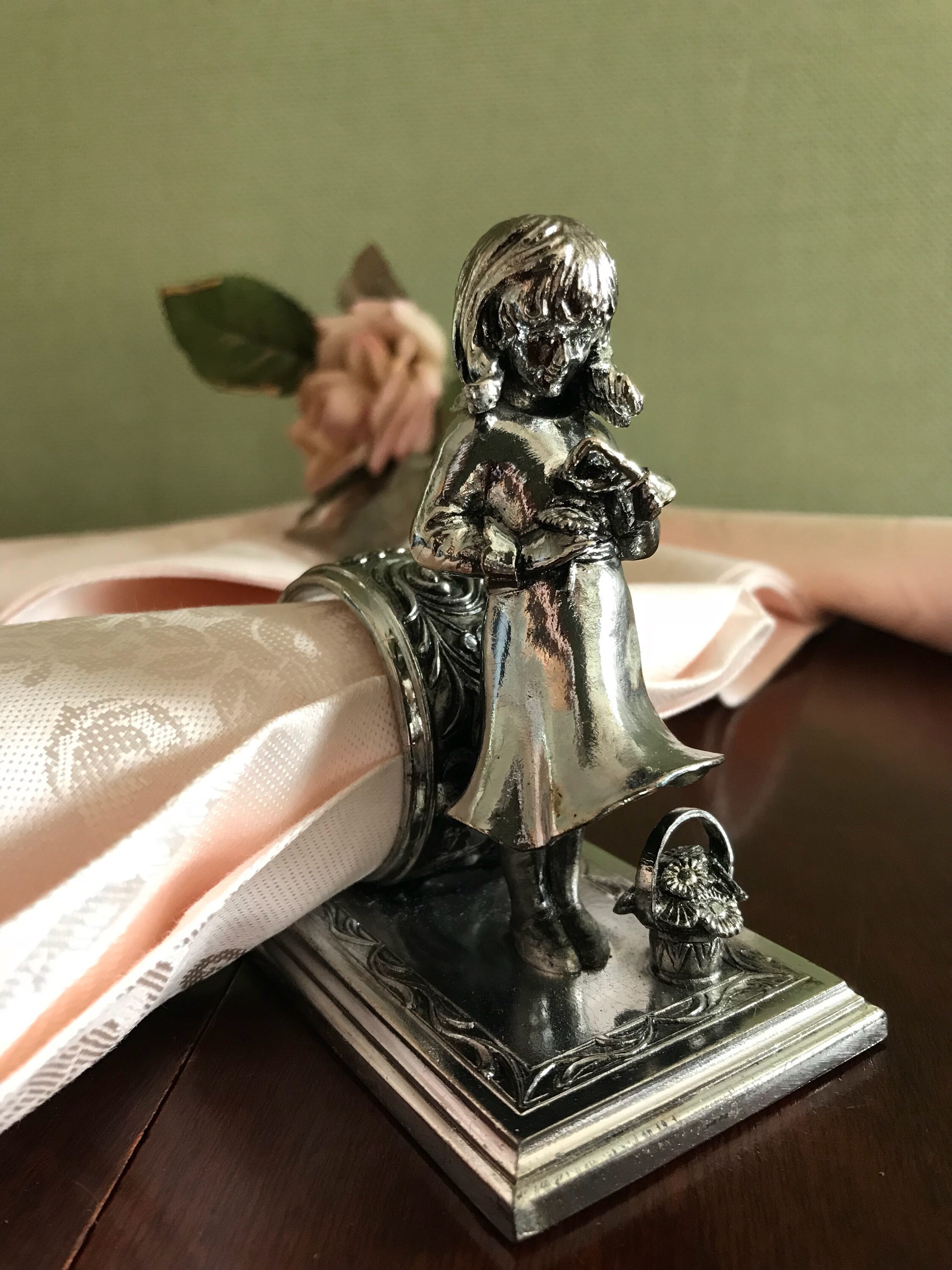 These lovely rings were designed by the artist Lance and made available in limited editions. Envision how beautiful your table will be with these elegant silver rings encasing your cloth napkins. These are large and very substantial napkin rings; the children are attached to a large rectangular base of silver plated metal. The rings are big enough to hold a large dinner napkin with silverware tucked inside. They would make a unique and gorgeous table scape for Mother’s Day.