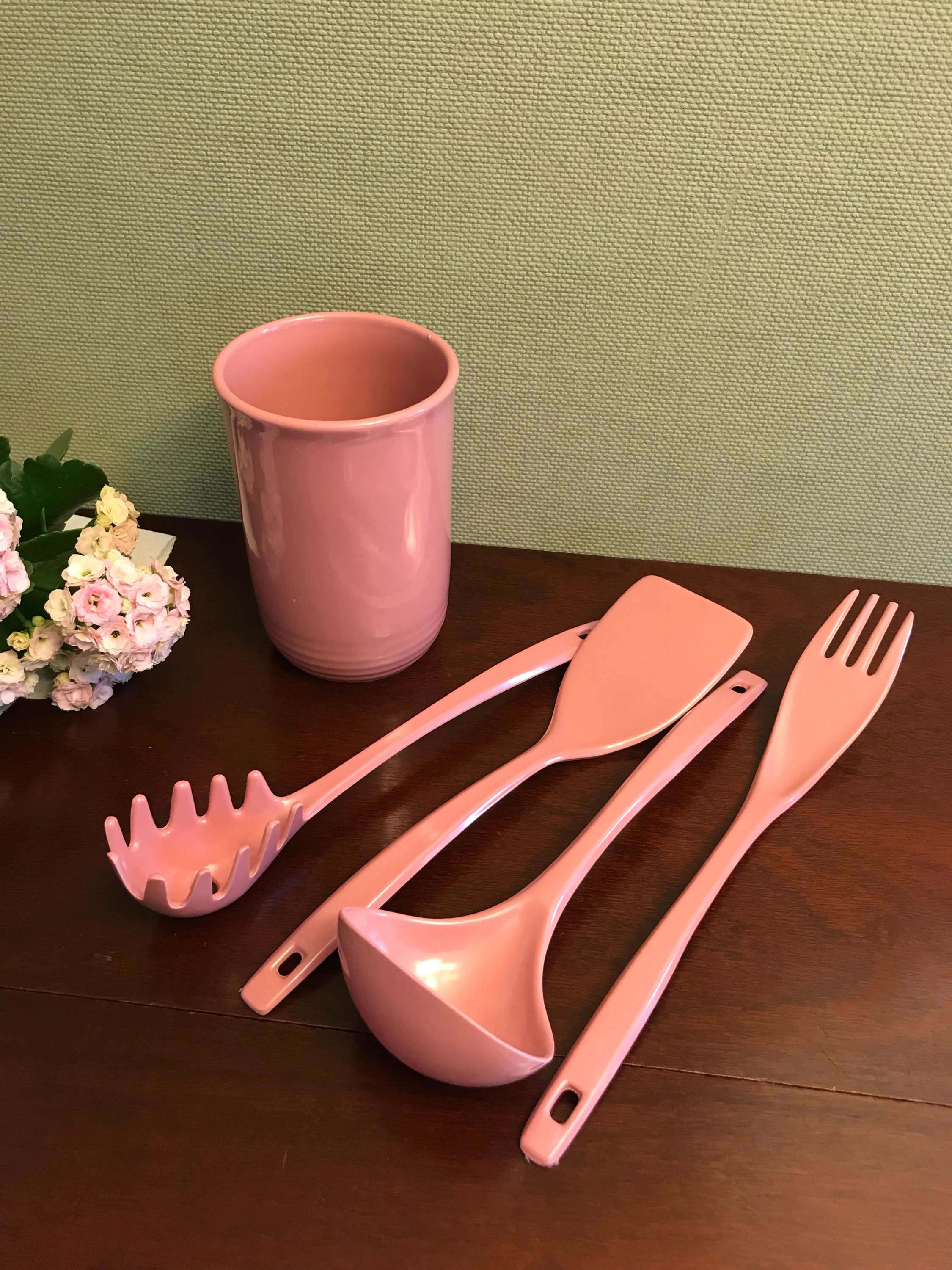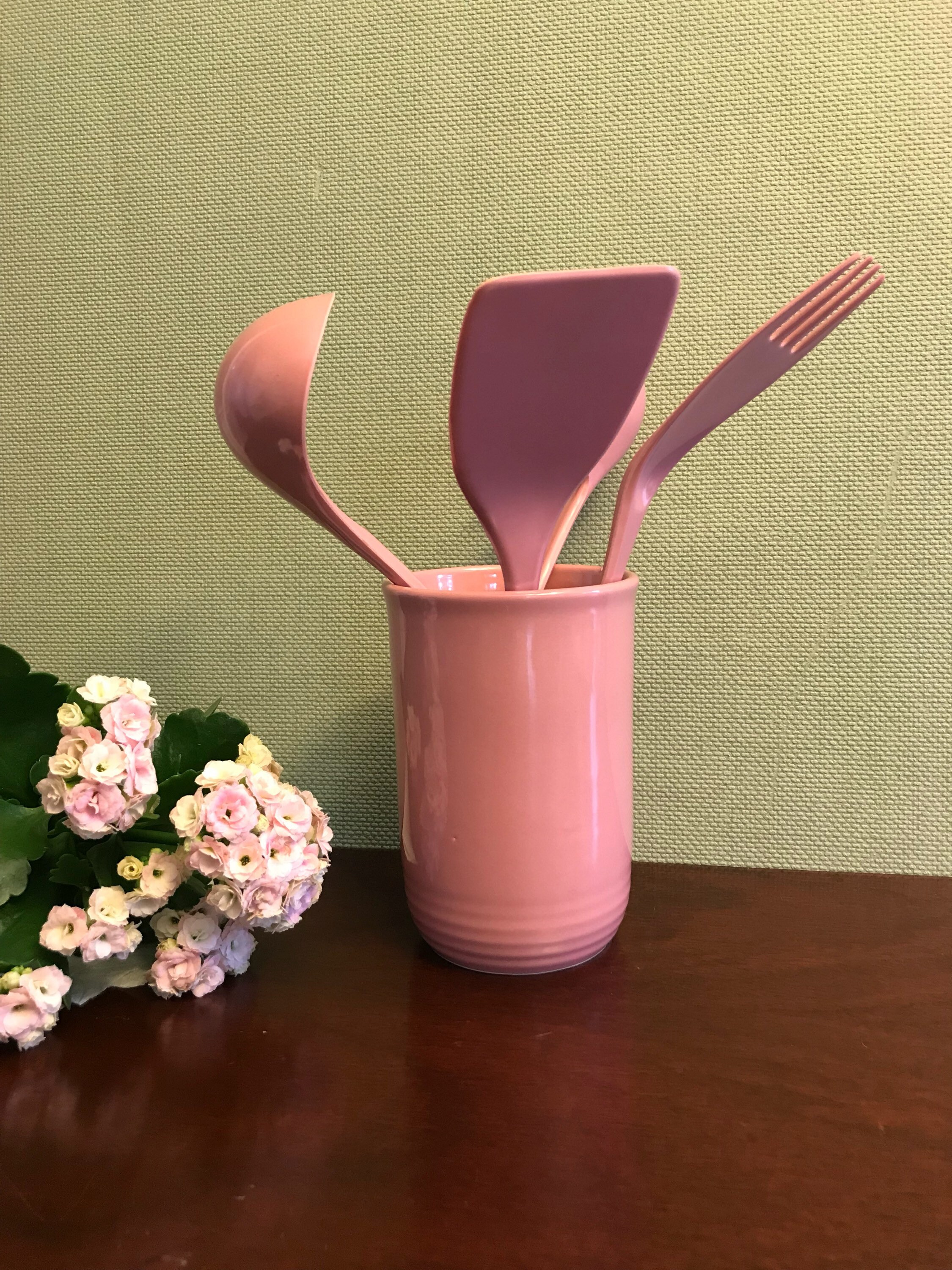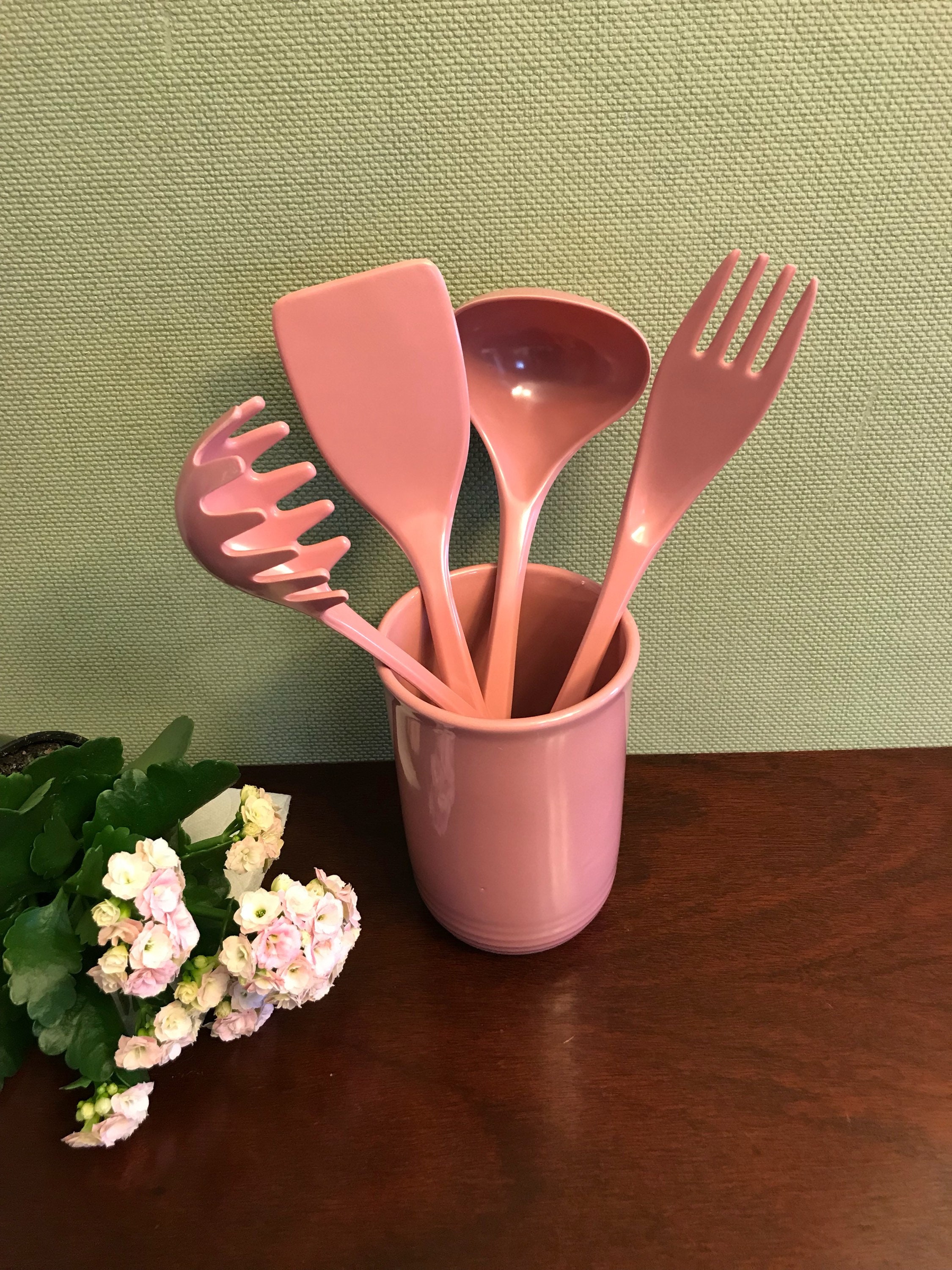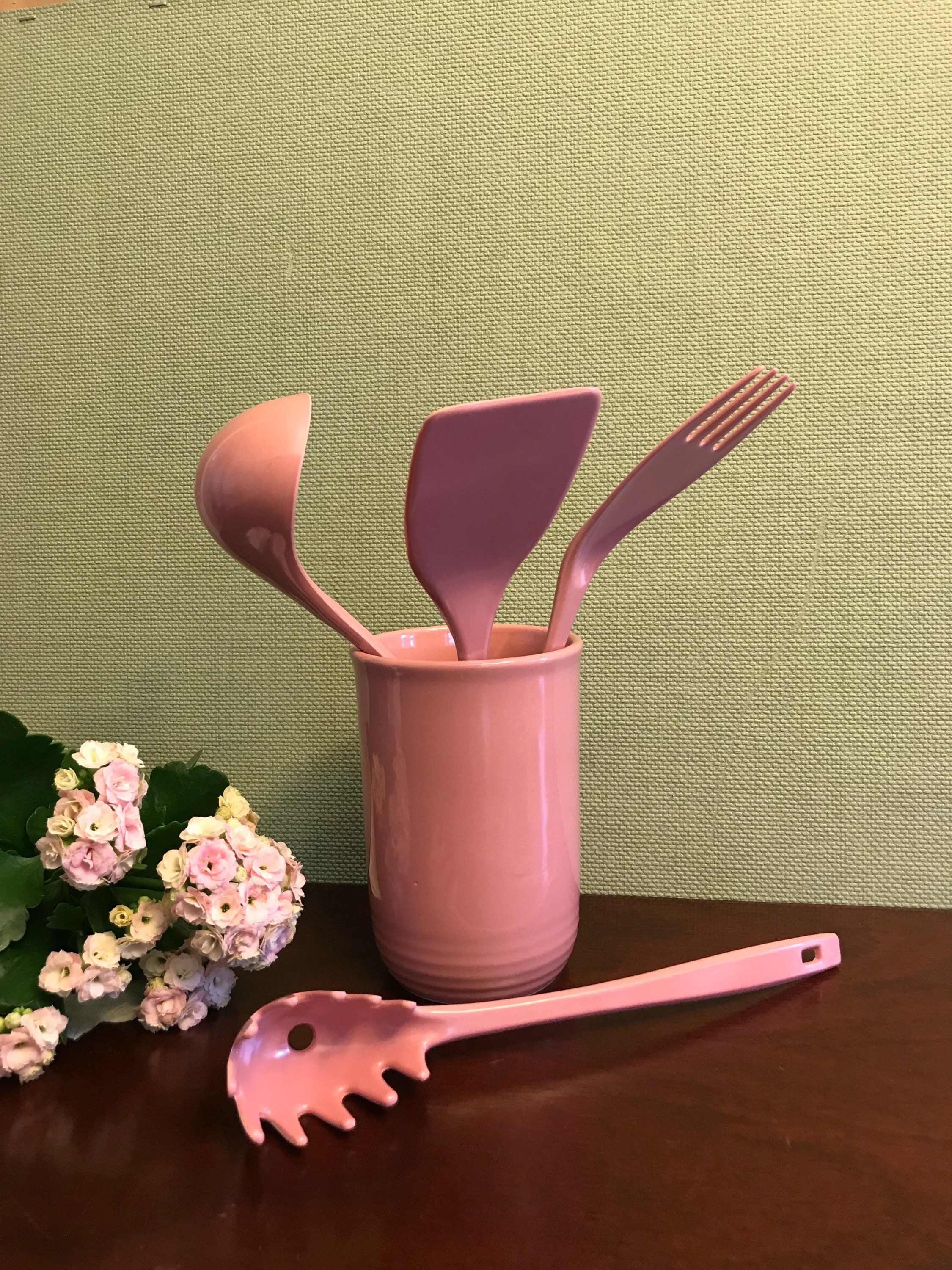 Vintage Pink Stoneware Utensil crock set. This pretty set of utensils and matching Crock are from the Color Connection series of the 1990s. The crock is made from Quality heavy-duty stoneware, and the utensils are made from matching melamine ware. This color of dusty rose is so pretty. This would be a lovely set for a cottage chic themed kitchen.
