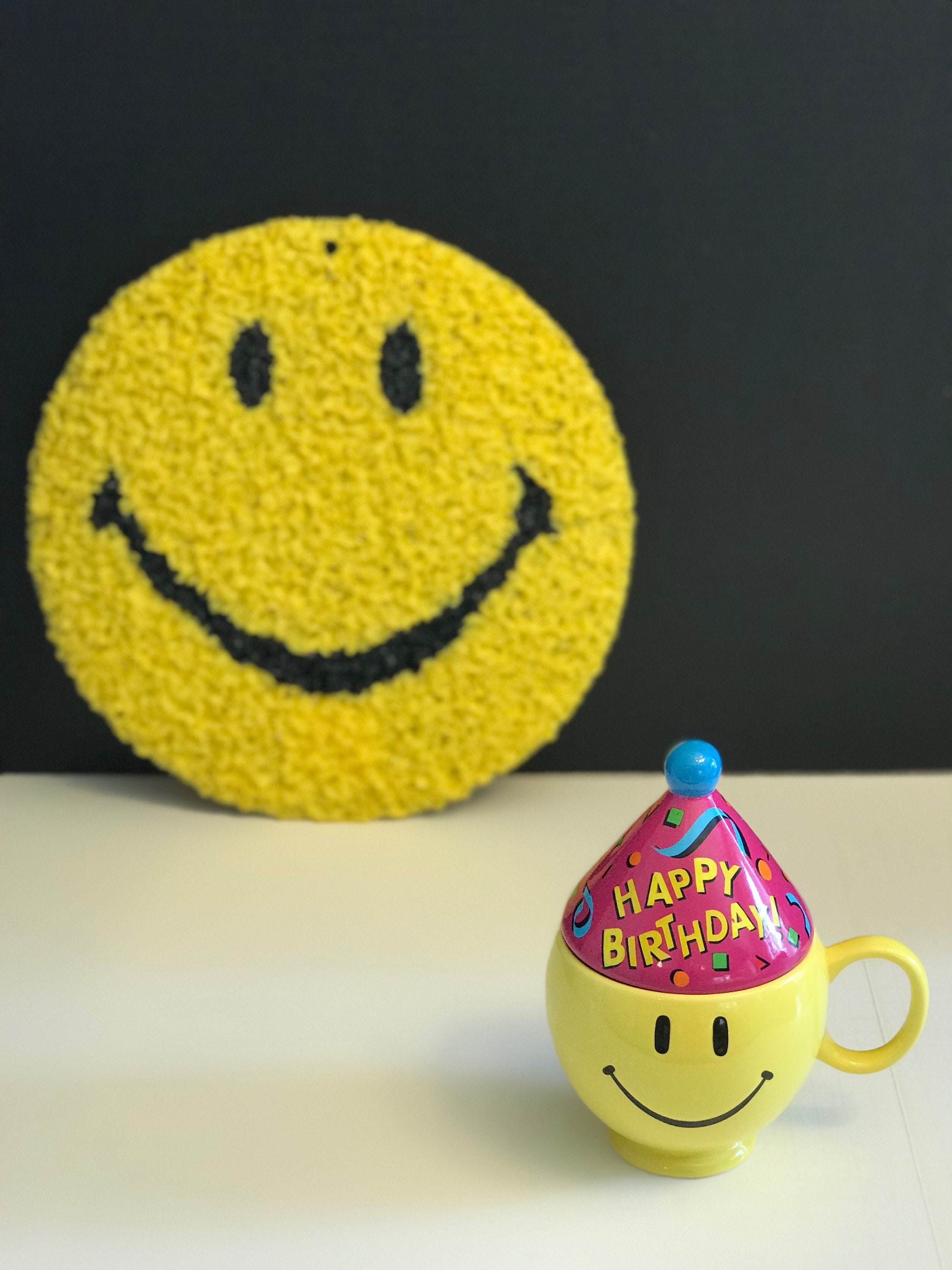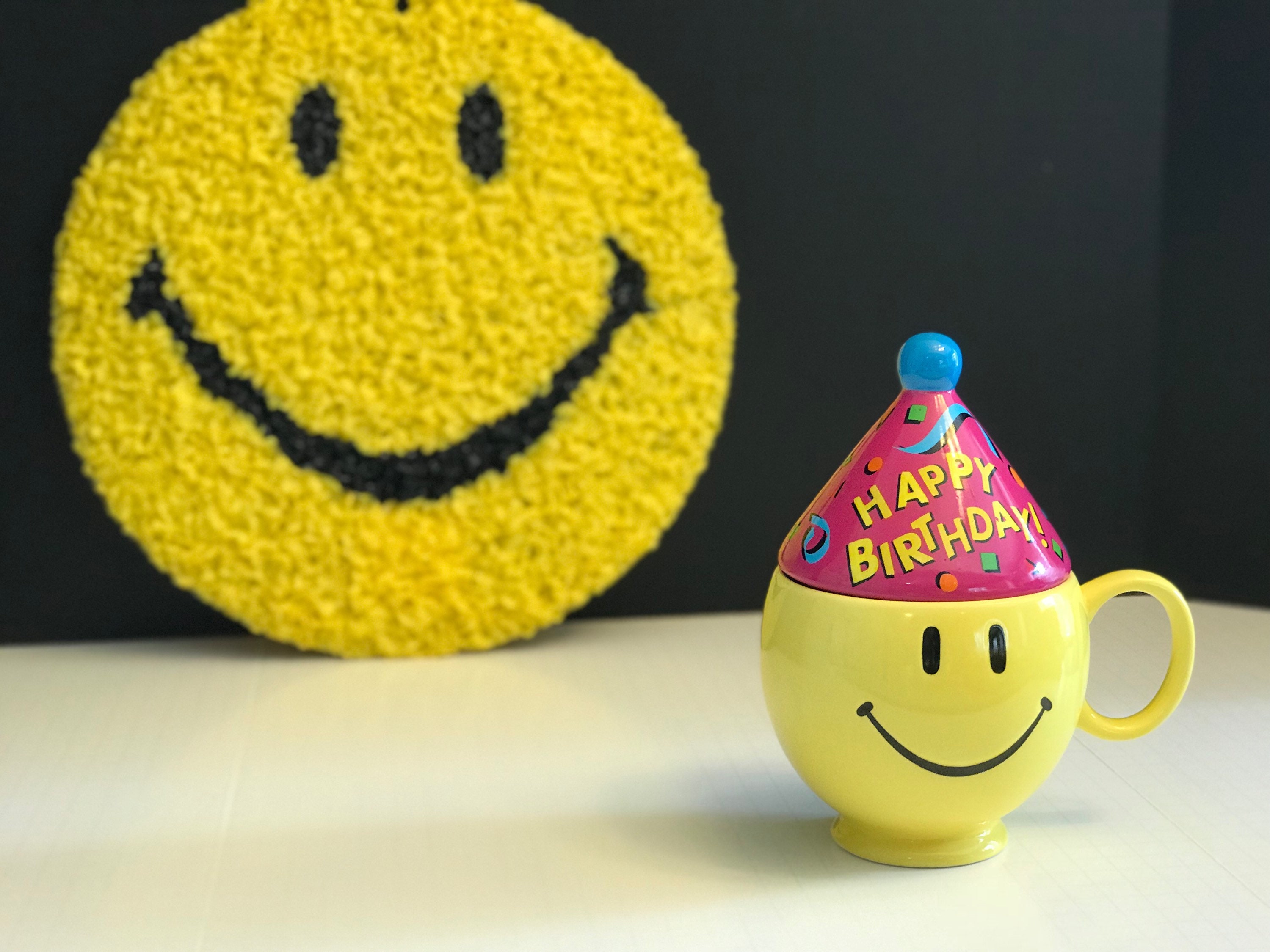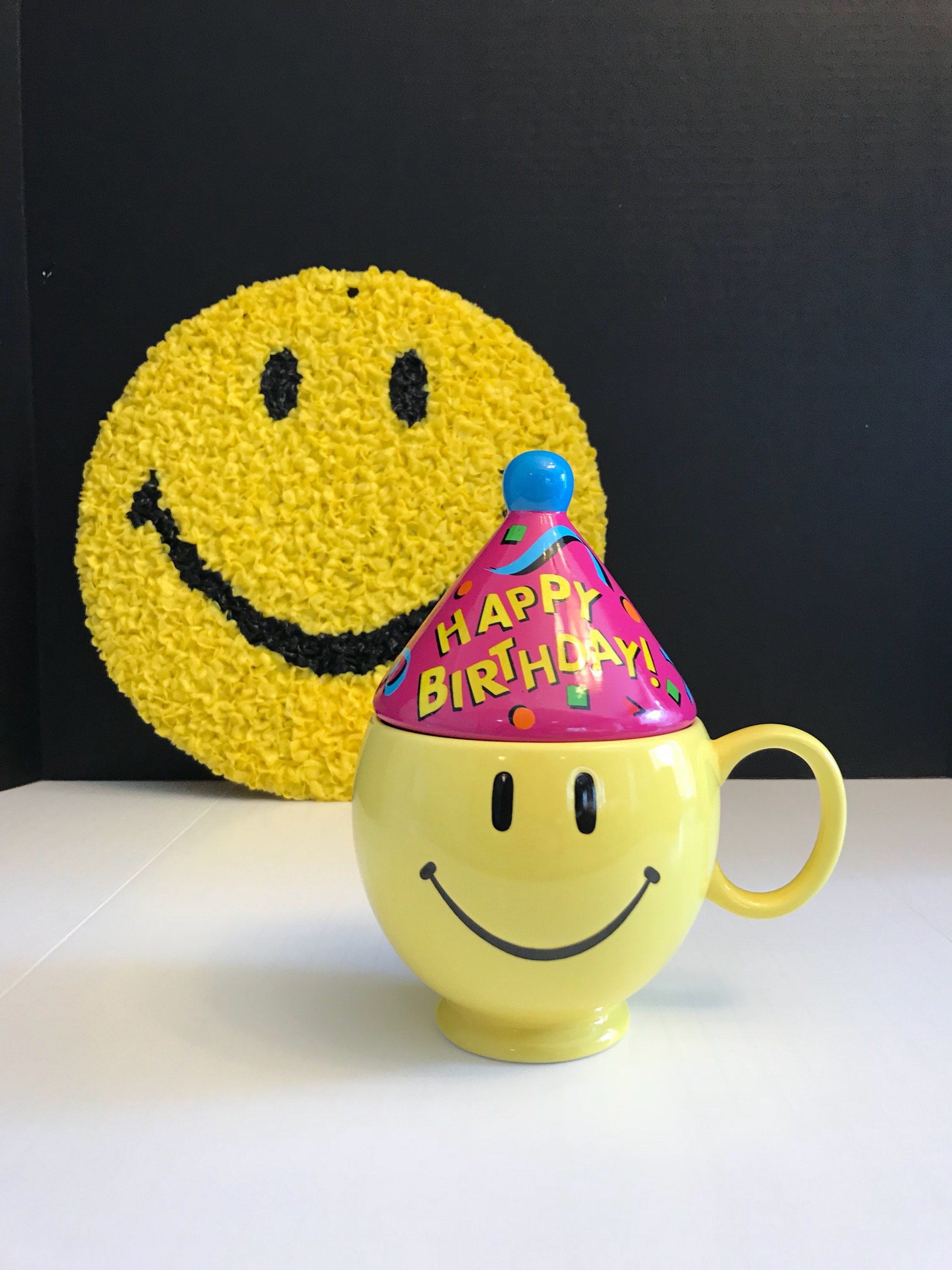 Vintage Happy Birthday Yellow Smiley Face gift mug. Such a Fabulous Smiley Face mug it is all ready to party; with its Blue party hat. The cone shaped hat is covered with confetti and “Happy Birthday” is written across it in bright cheerful colors.