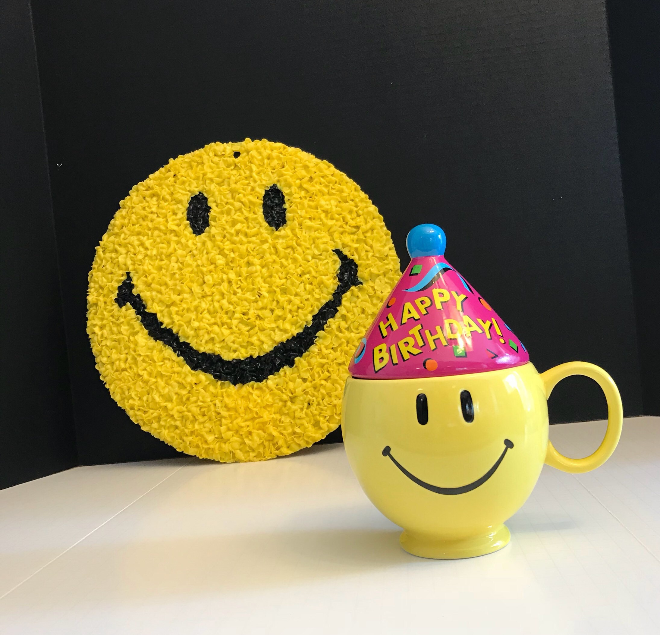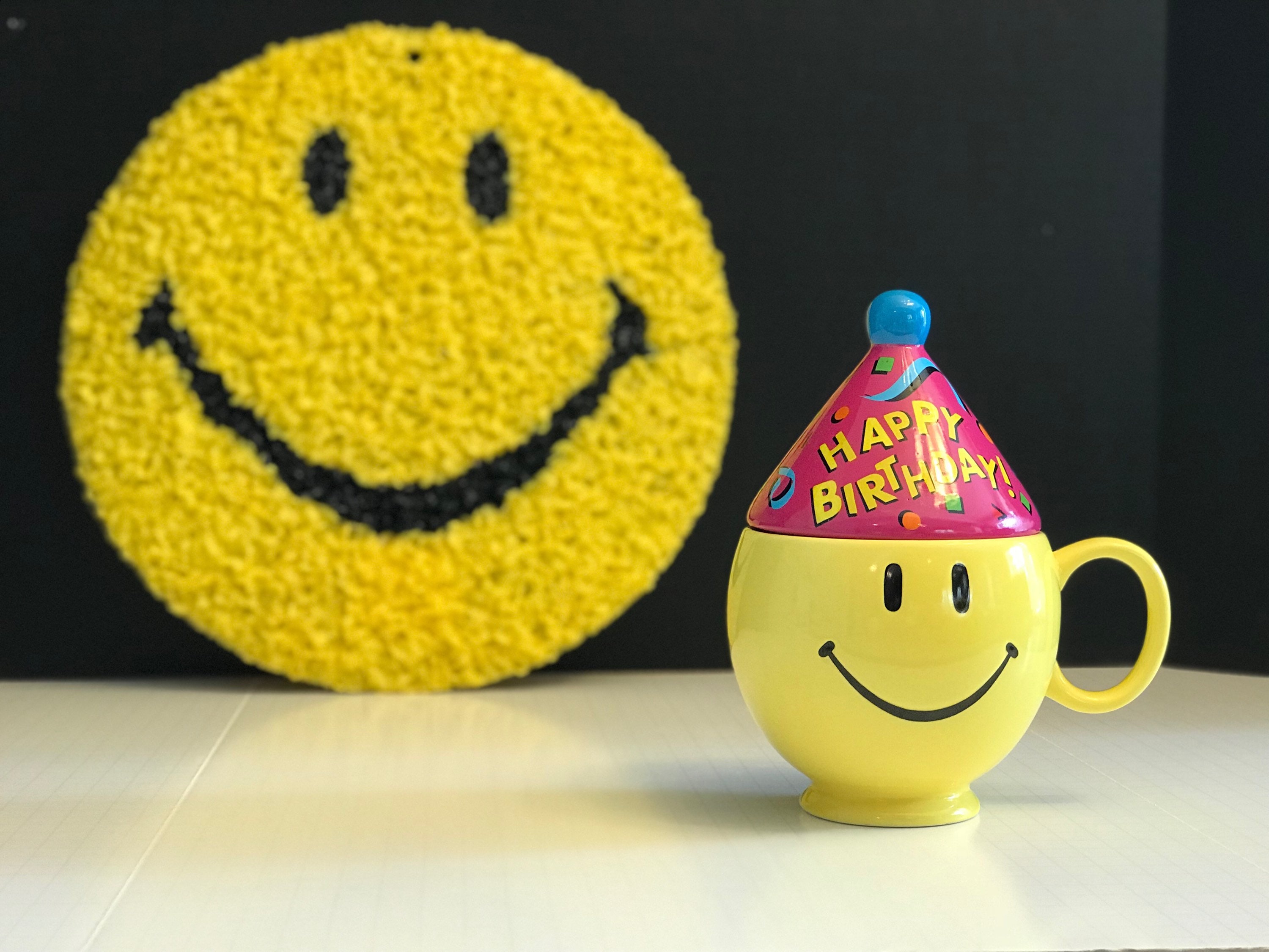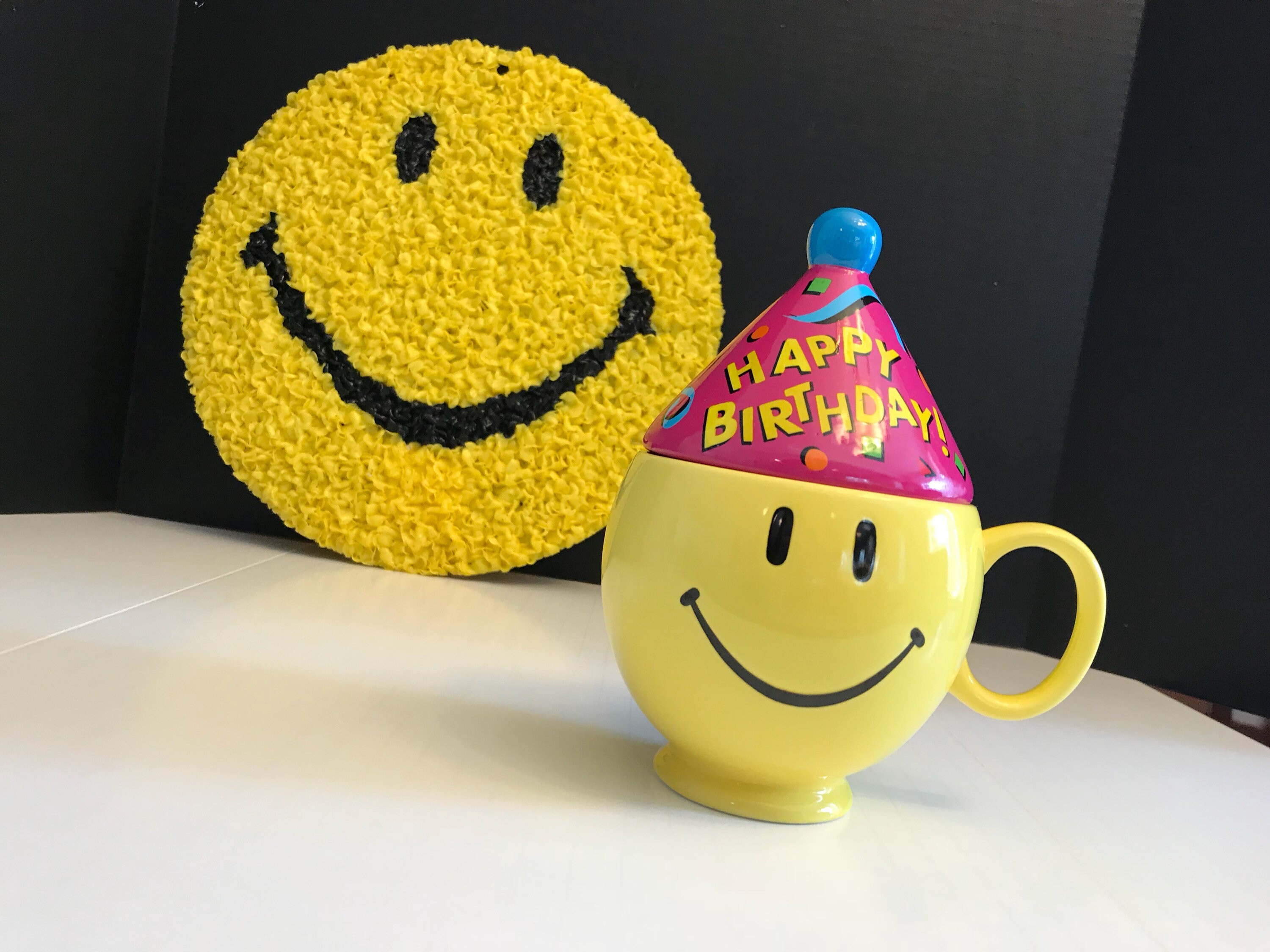 Vintage Happy Birthday Yellow Smiley Face gift mug. Such a Fabulous Smiley Face mug it is all ready to party; with its Blue party hat. The cone shaped hat is covered with confetti and “Happy Birthday” is written across it in bright cheerful colors.