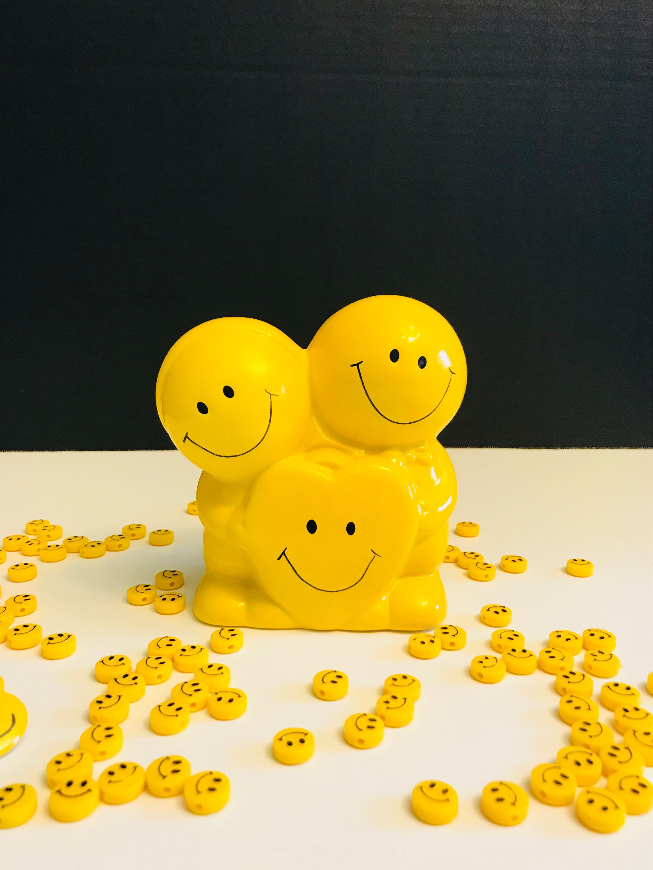 This is an adorable Vintage Yellow smiley faces coin bank. It has a cute Smiley face Boy and Girl with their arms around each other and holding a smiling Heart.