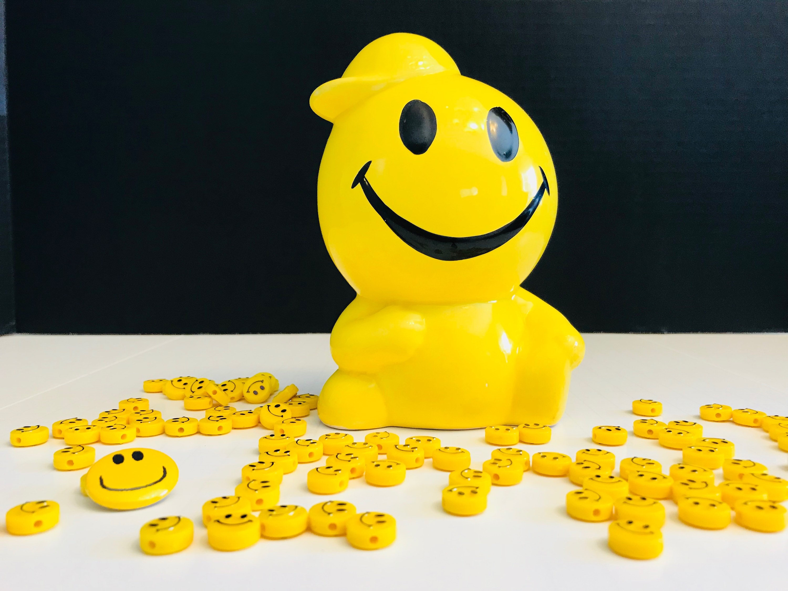 A Vintage Yellow smiley face Boy coin bank. He has a cool little baseball cap sitting sideways on his head. This is one groovy dude.