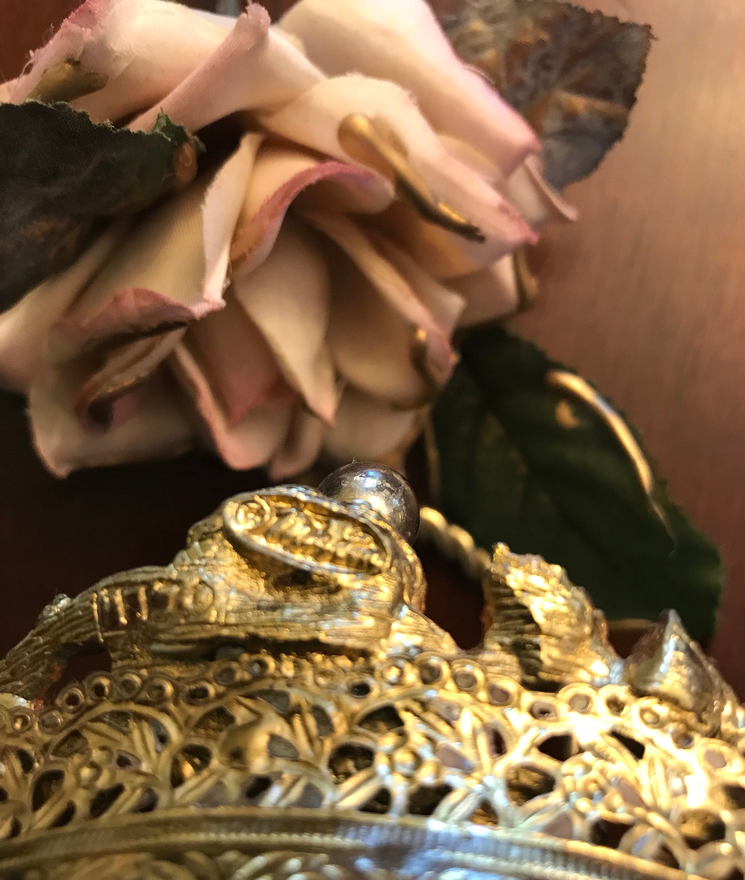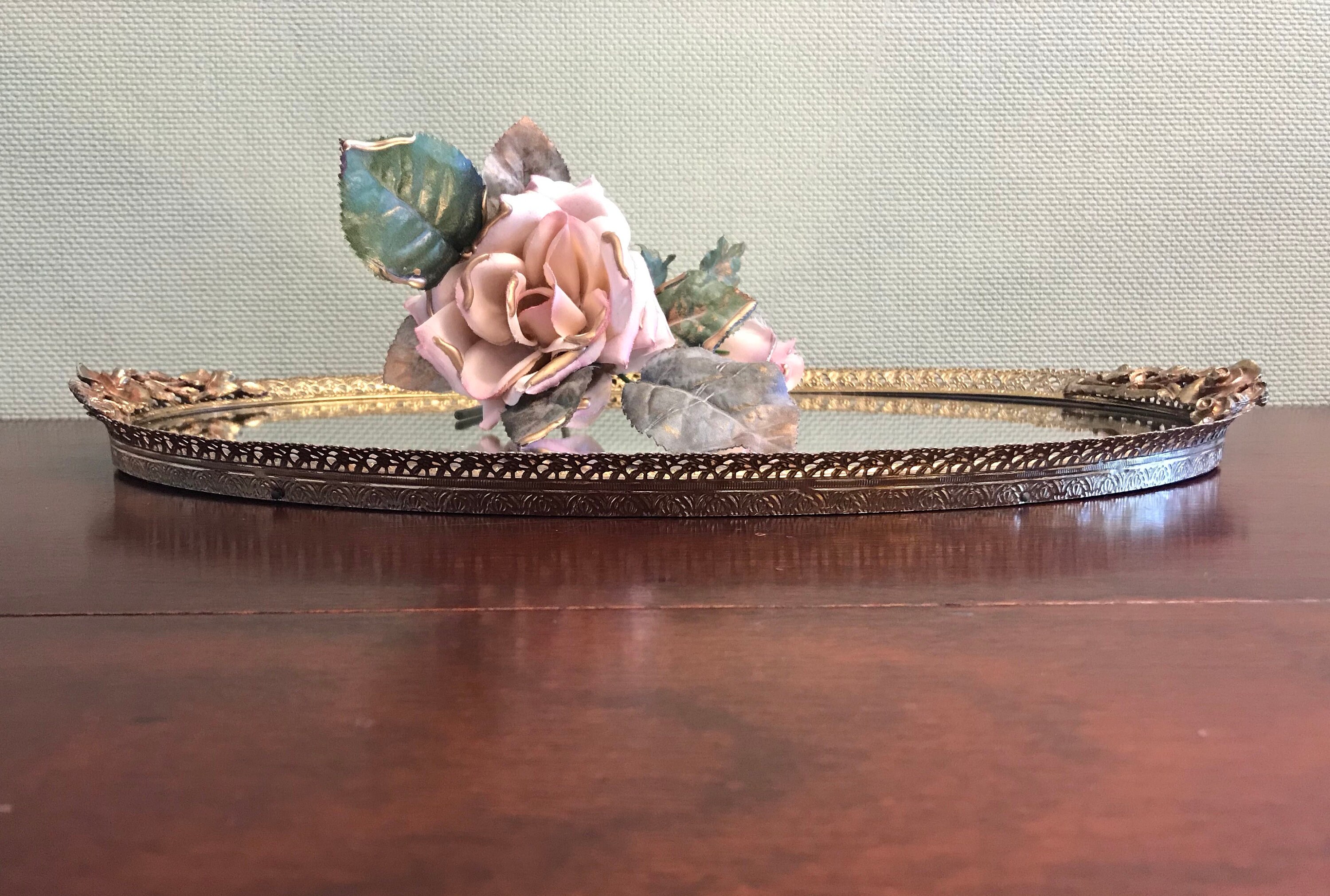 This is a lovely Vintage Vanity Set with Vanity Mirror, matching Hand Mirror and Comb. This set is plated in elegant Gold. All matching pieces of the Vanity Set are decorated in ornate Ormolu and Golden Filigree. Beautiful roses decorate the mirrors. Gorgeous!