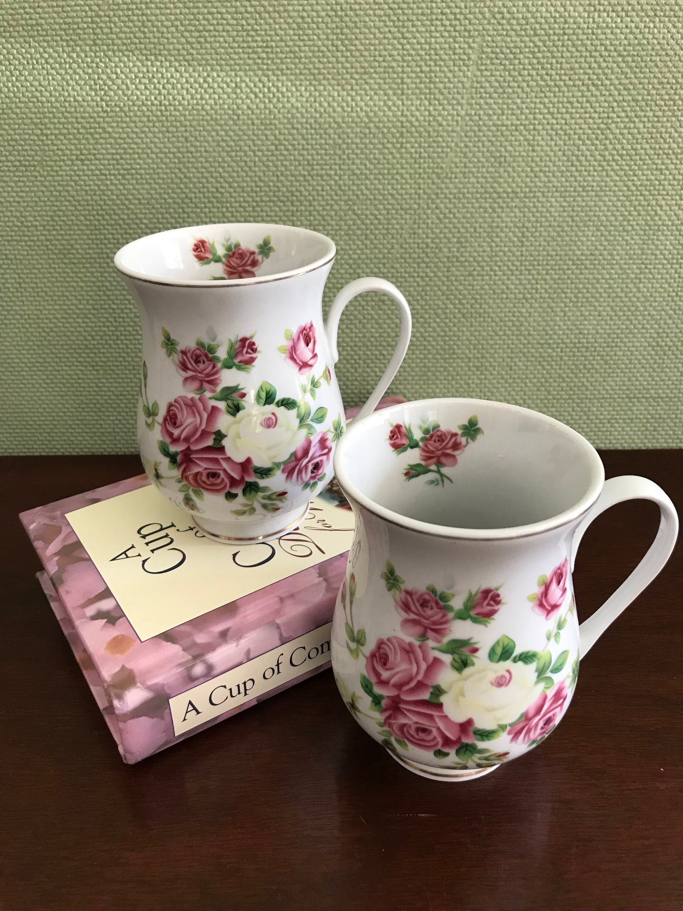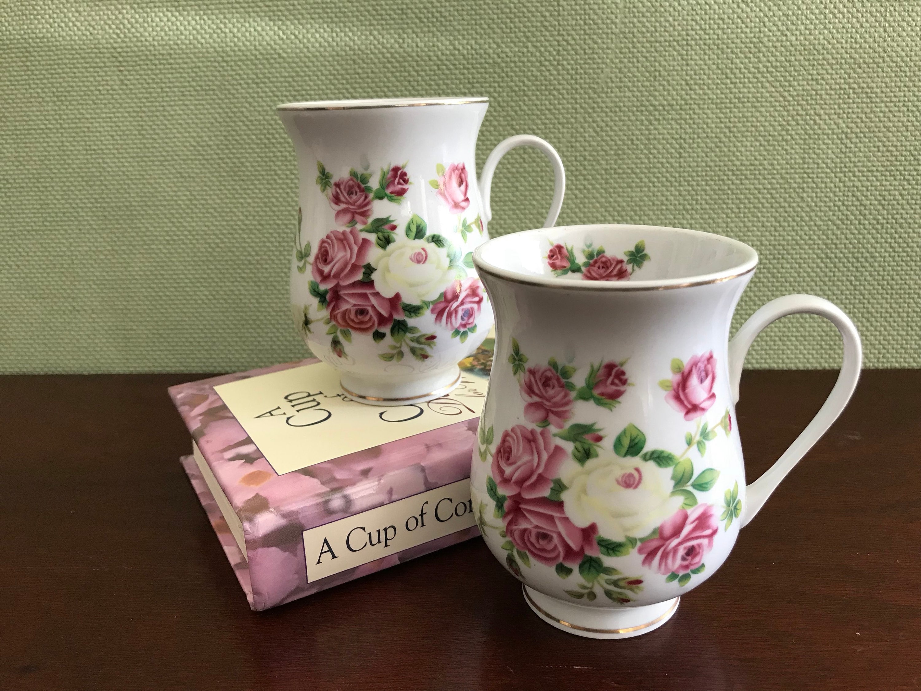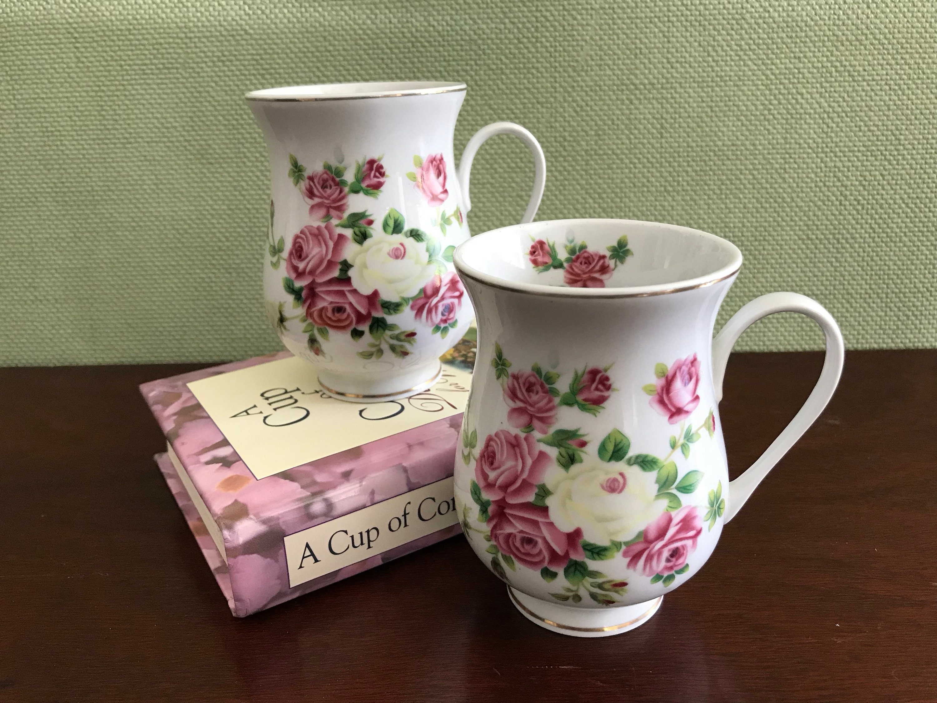 These lovely mug have a pretty pattern of pink and white roses applied to the sides of the mug and accenting the inside. The Handles and edges are outlined in Hand painted Gold Gilt. The base of the mug is pedestal shaped.