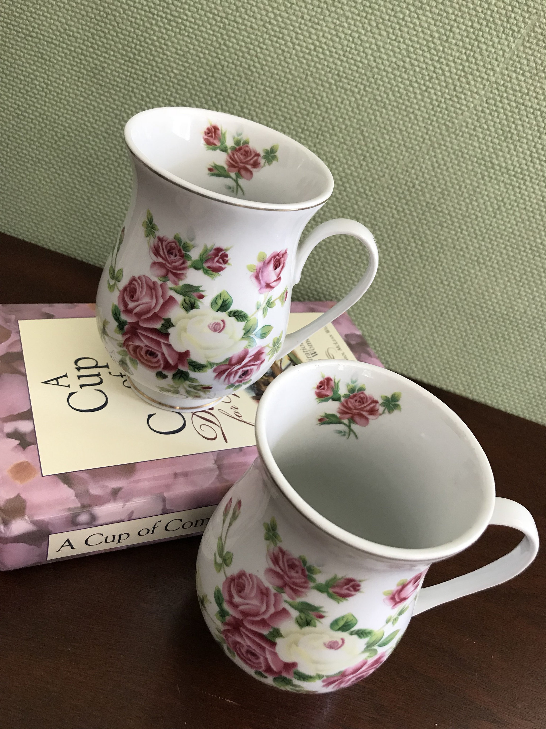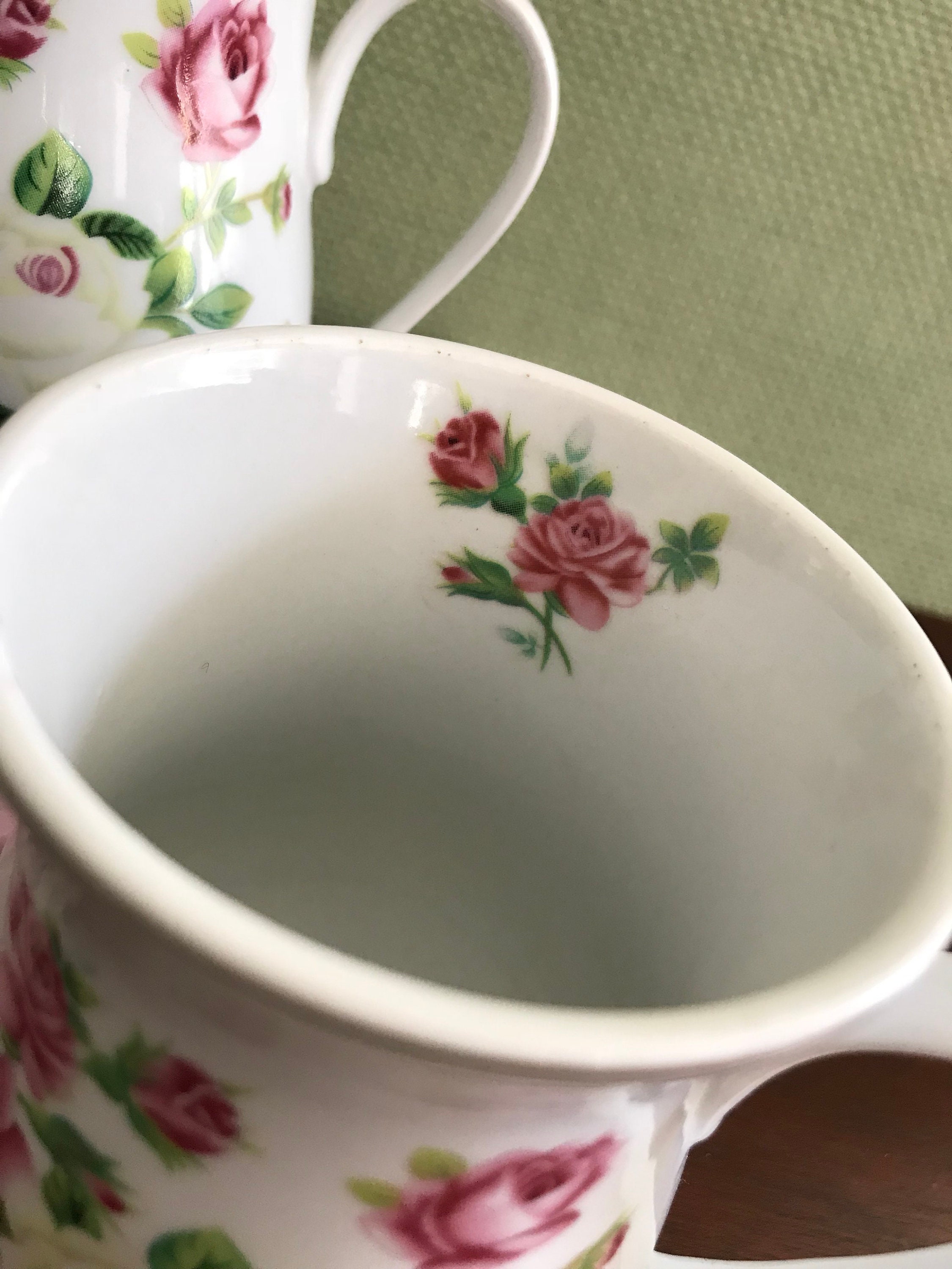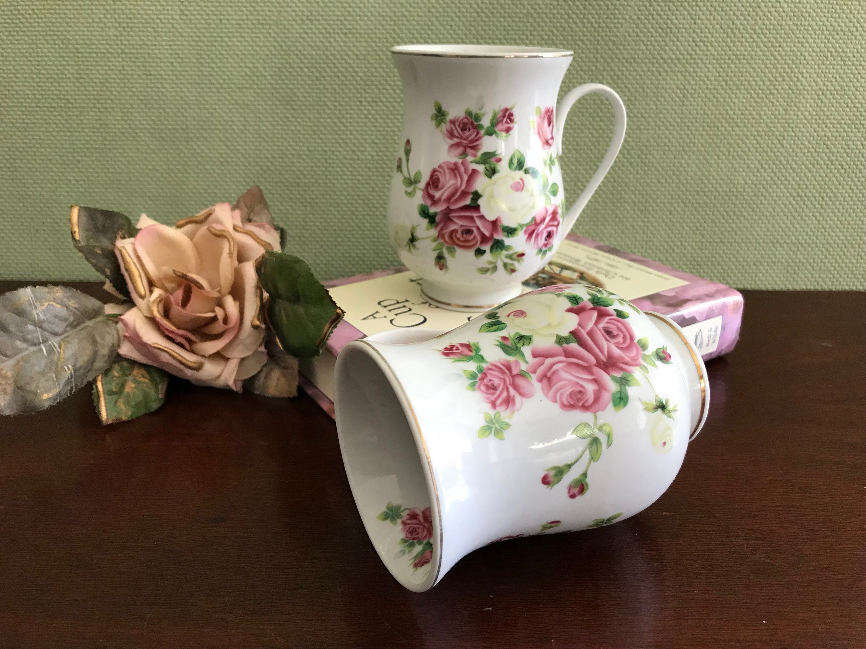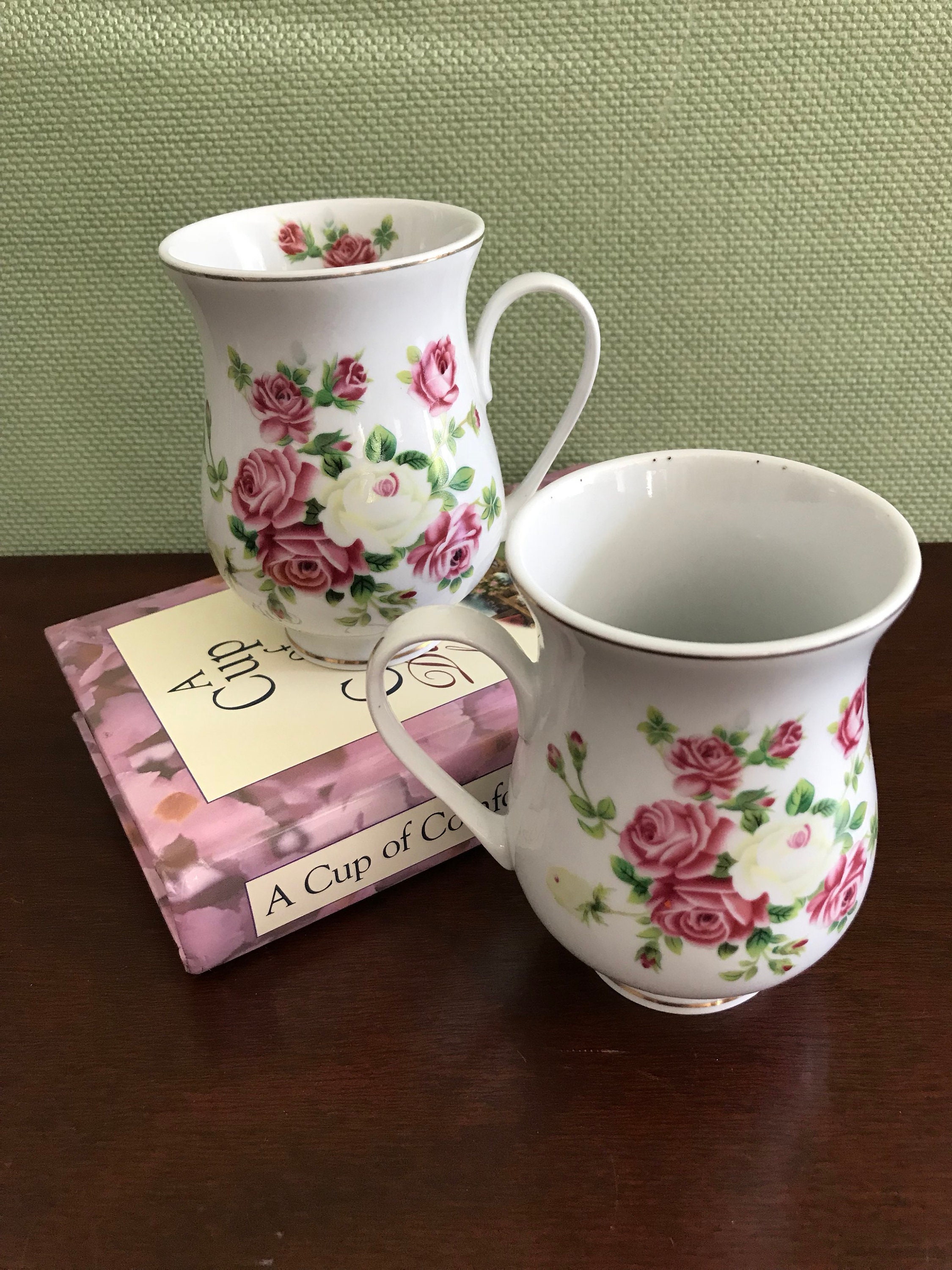 These lovely mug have a pretty pattern of pink and white roses applied to the sides of the mug and accenting the inside. The Handles and edges are outlined in Hand painted Gold Gilt. The base of the mug is pedestal shaped.