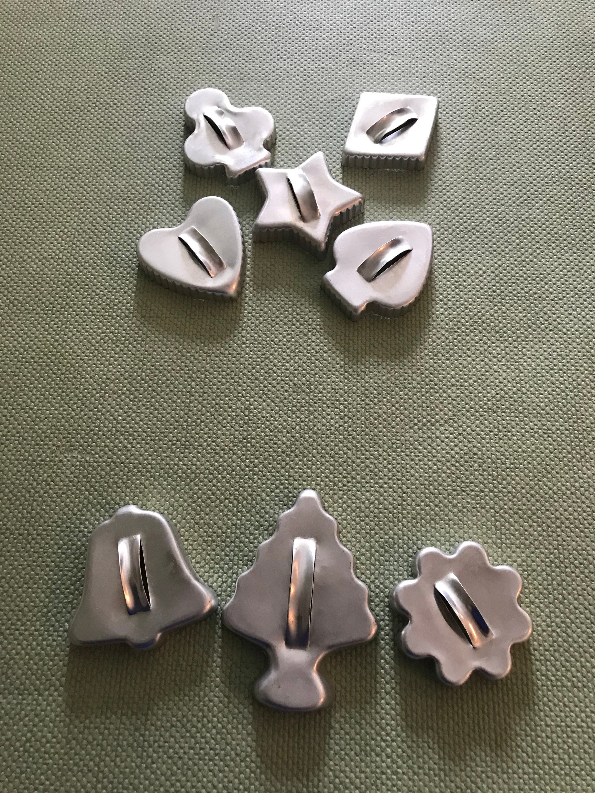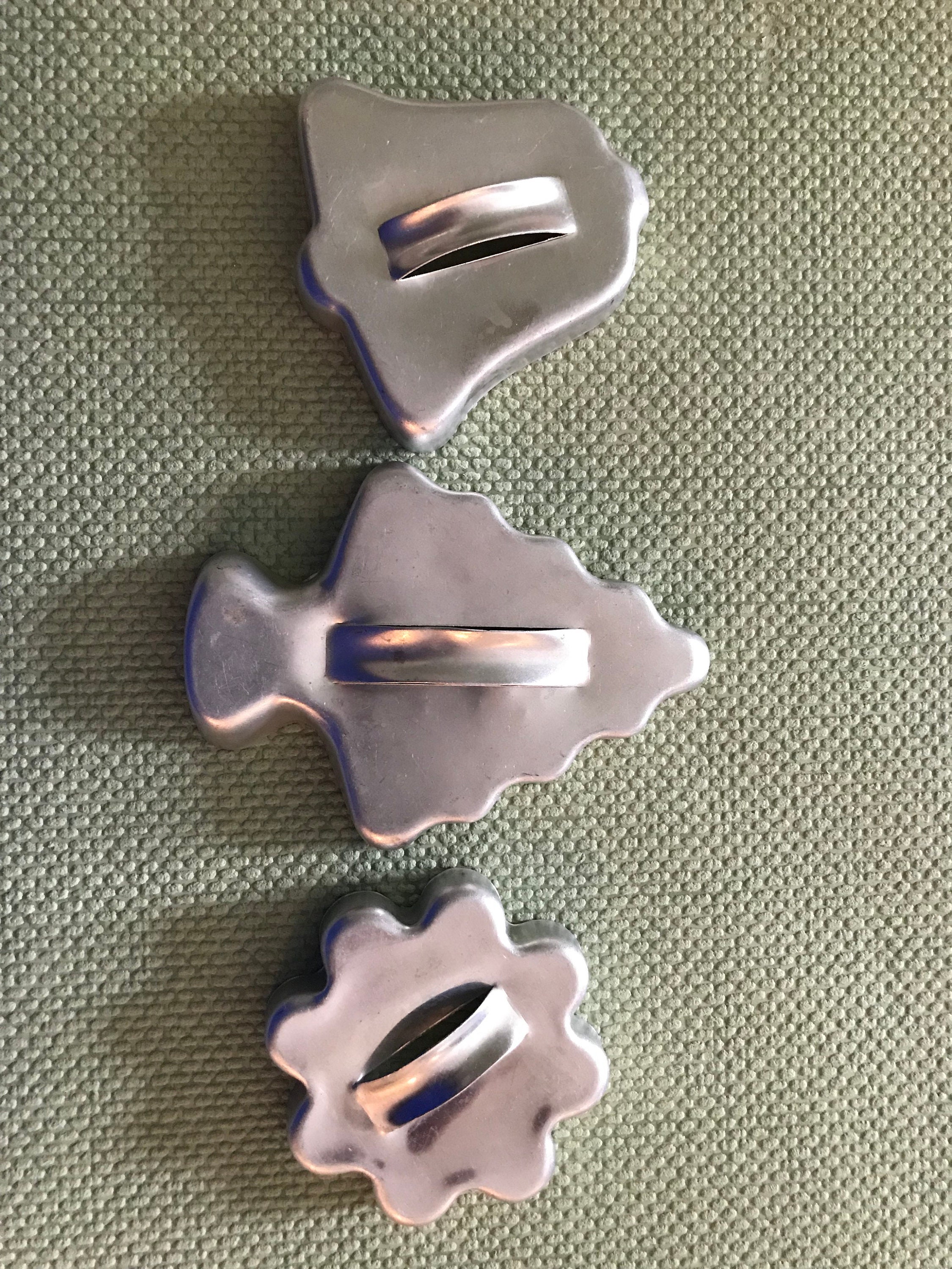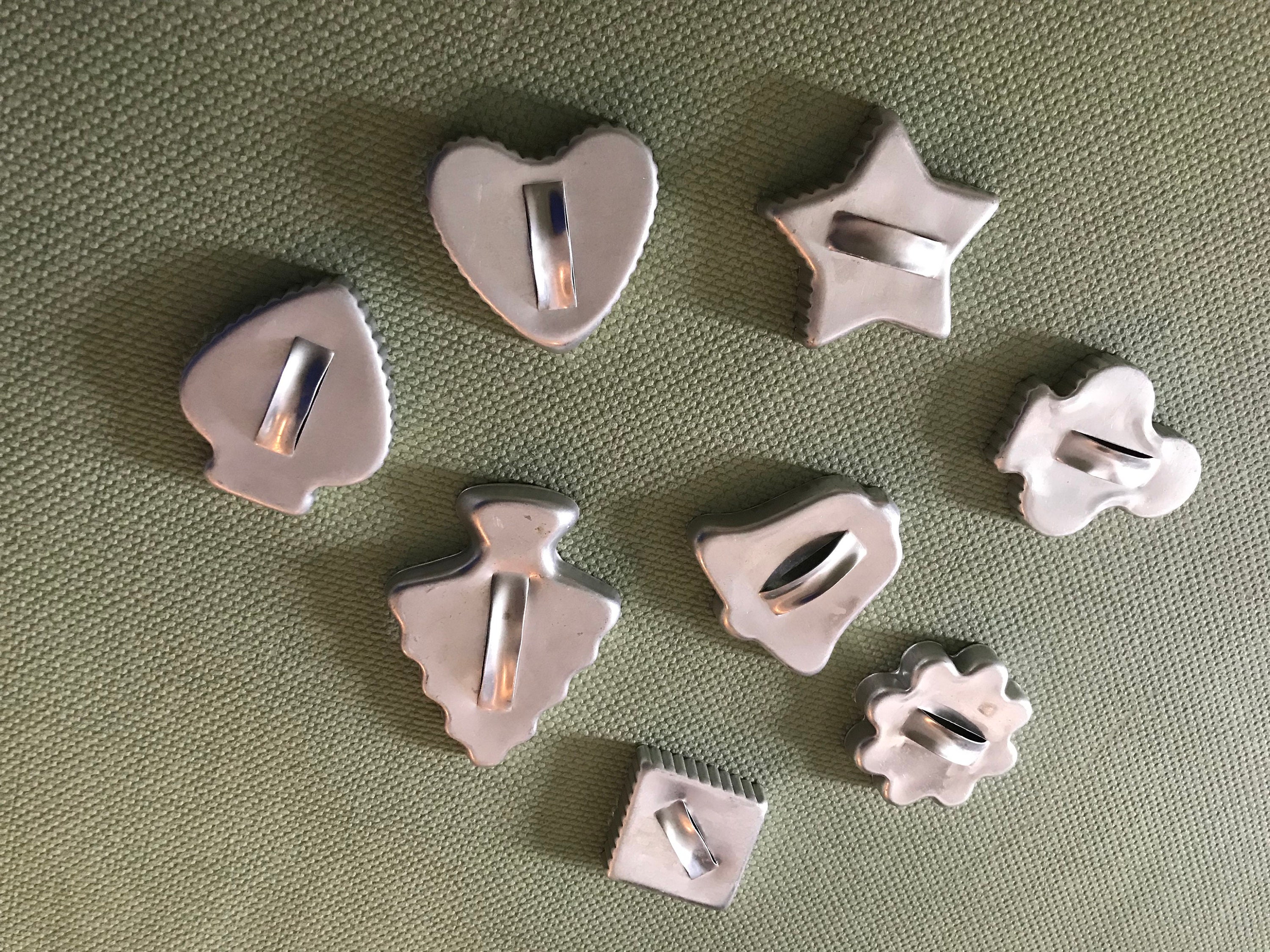 This is a wonderful set of vintage cookie cutters. These classic cookie cutters have little handles, and are in the shape of Holiday designs. There are 8 shaped cookie cutters. They are so cute, all with a vintage charm. Perfect for a vintage kitchen.