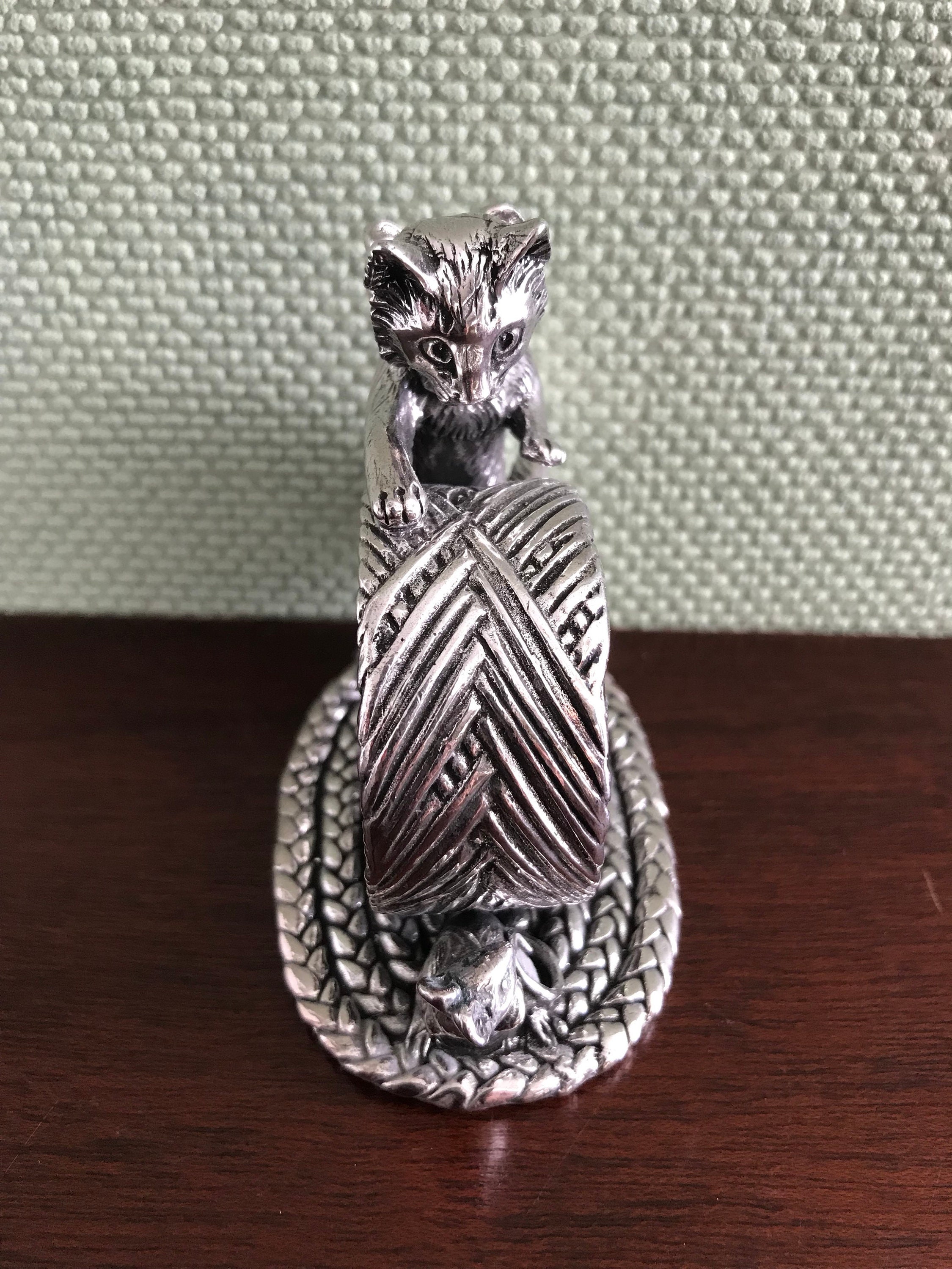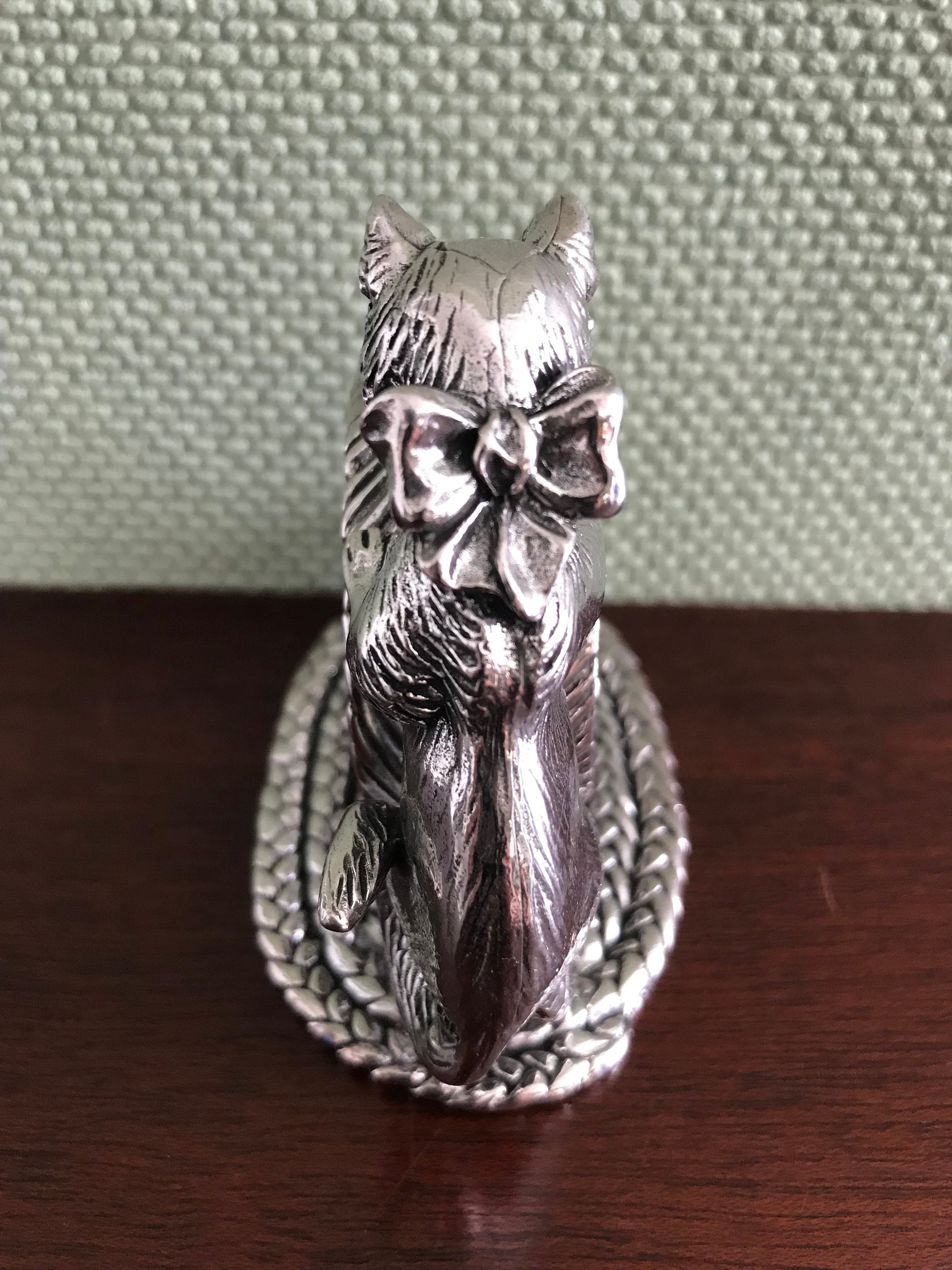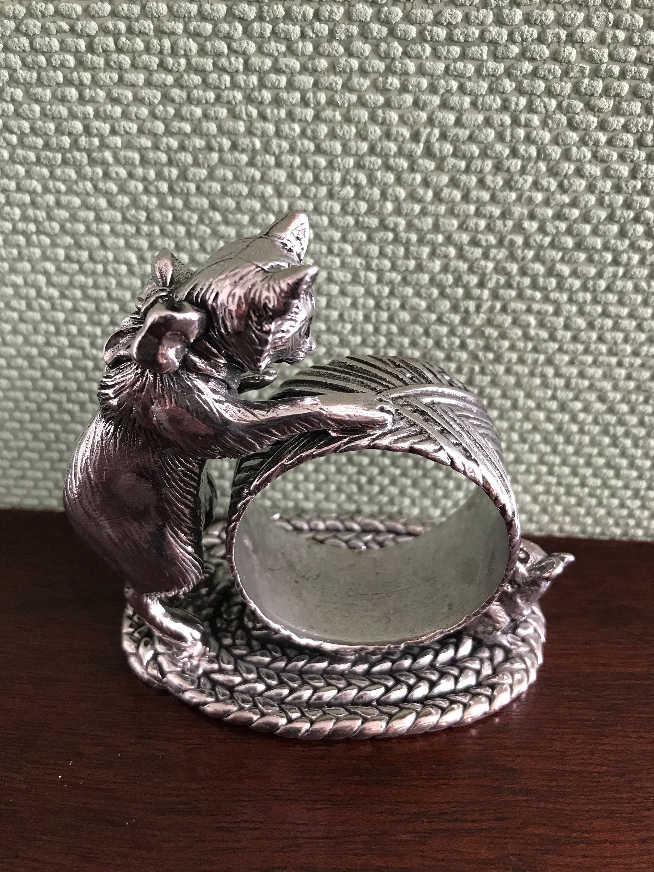 This is a large and very substantial napkin ring; the kitten and mouse are attached to a large oval base of silver plated metal. The ring is big enough to hold a large dinner napkin with silverware tucked inside. It would make a unique and gorgeous Gift.
