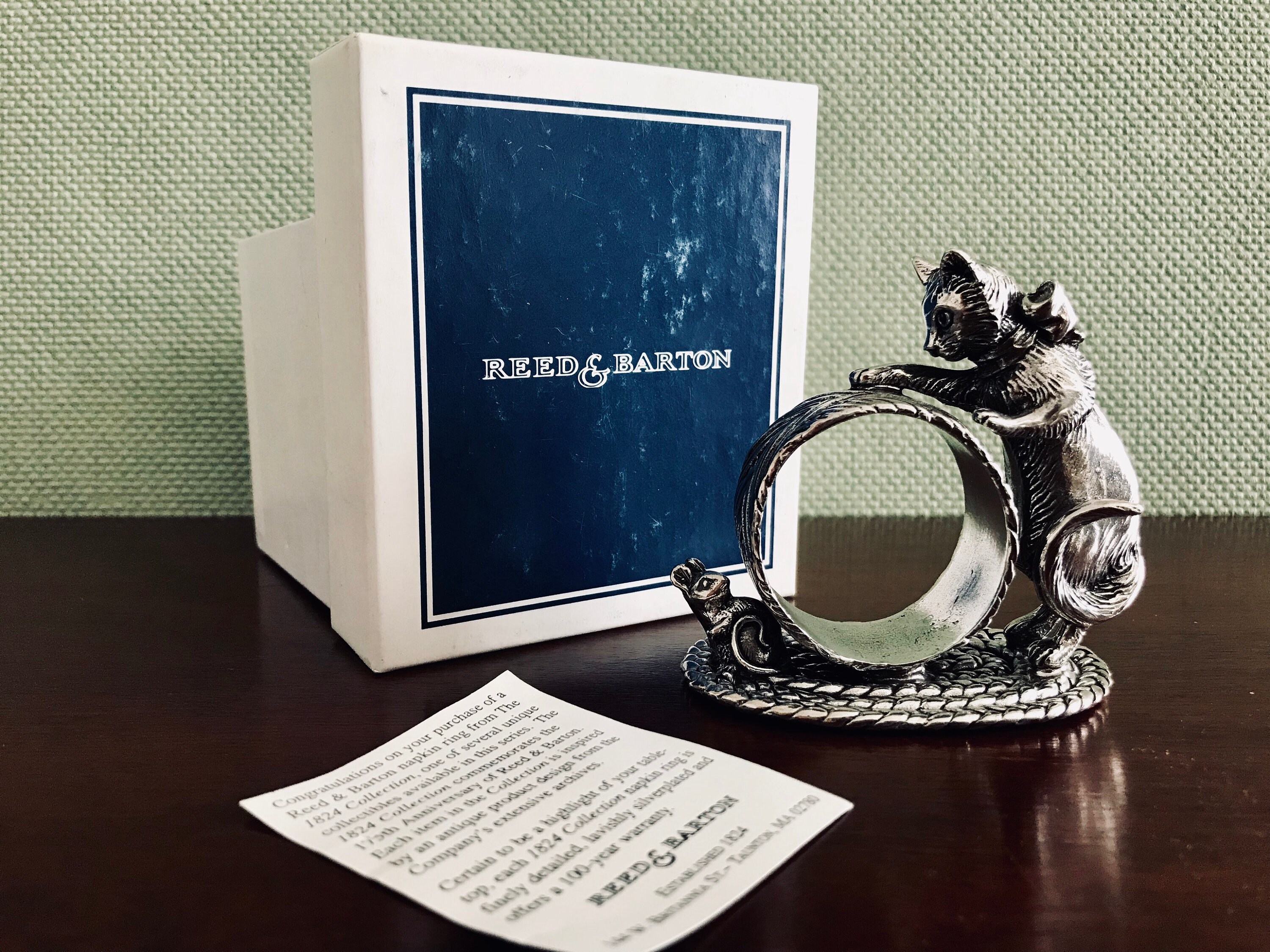 Vintage Silverplated Figural Napkin Ring with lovely Kitten and Mouse. This is a beautiful Collectible Silver plated napkin ring made by Reed and Barton to Commemorate their 175th anniversary, From the 1824 Collection.